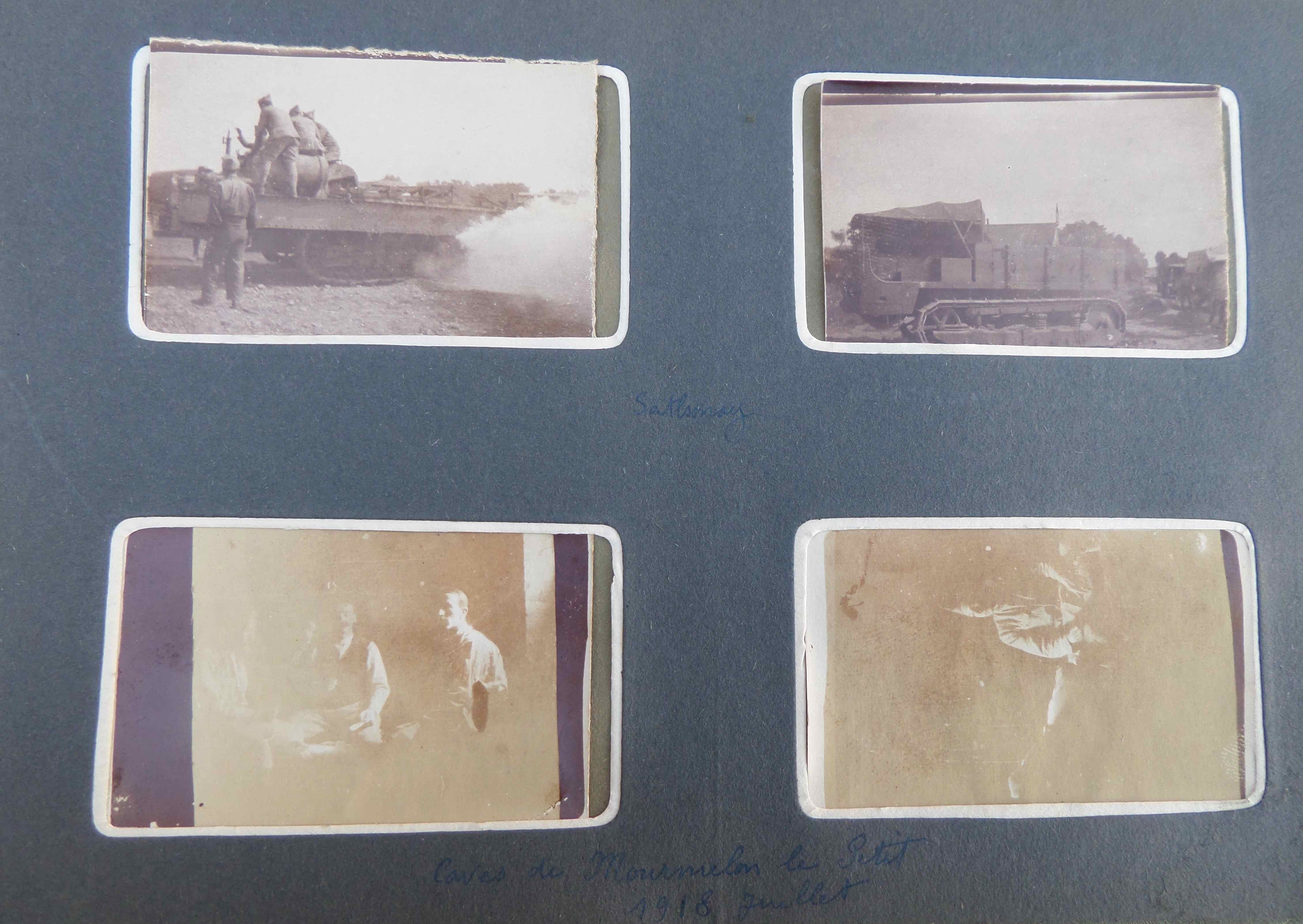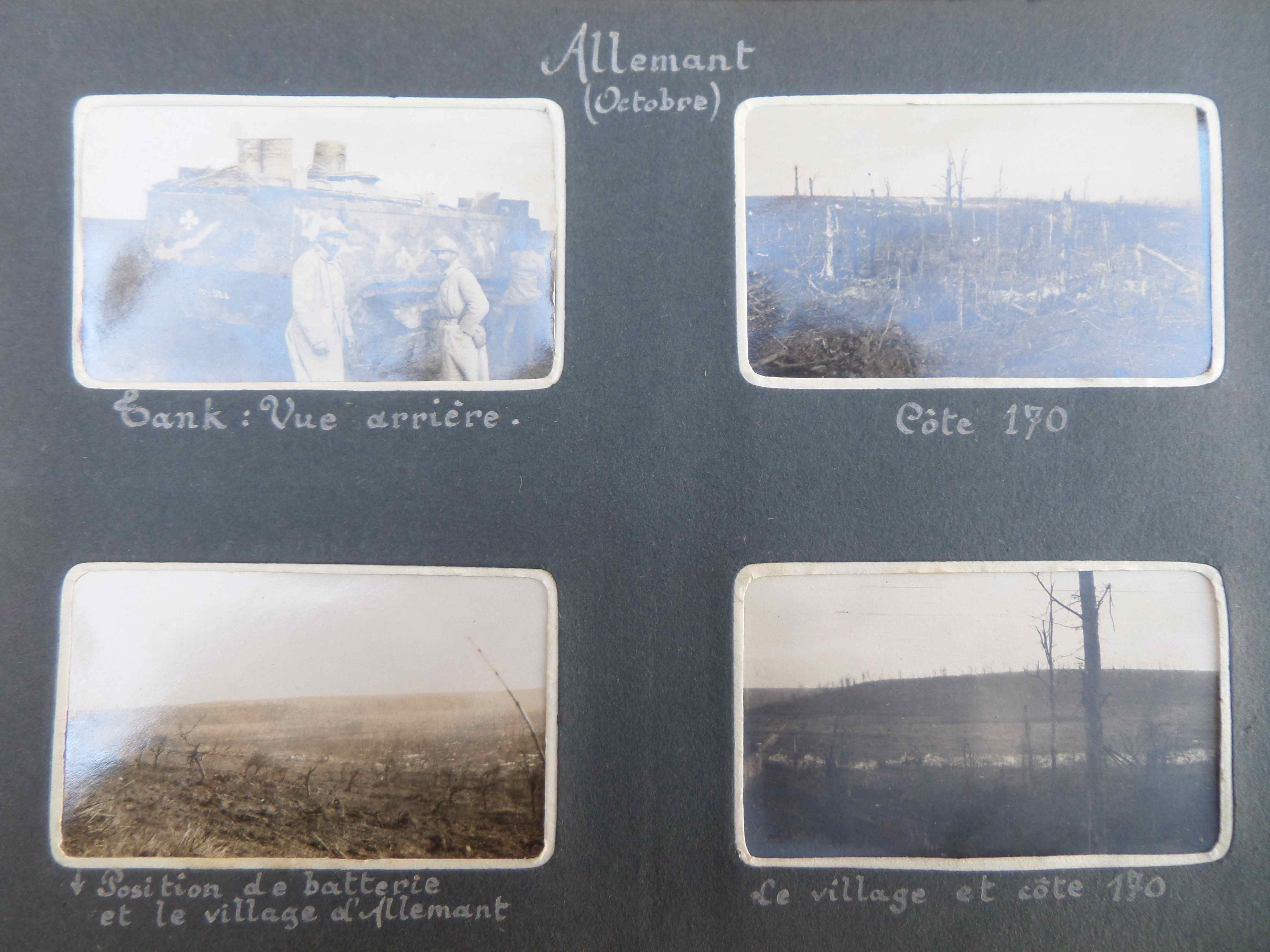 A côté de 3 vues des ruines d’Allemant et des arbres déchiquetés, photo d’un char français, pris par l’arrière. Et sur la page de droite, la corvée de soupe, un cagna à la tête de mort dessinée sur le linteau d’entrée, des obus de mortier allemands non explosés. La dernière vue montre un groupe de soldats autour d’un fourneau (sorti d’une maison) à Vauxaillon en novembre 1917 (à 4 ou 5km à vol d’oiseau d’Allemant). On sent sur les photos de ces 3 pages que les hommes ont été au coeur des combats.