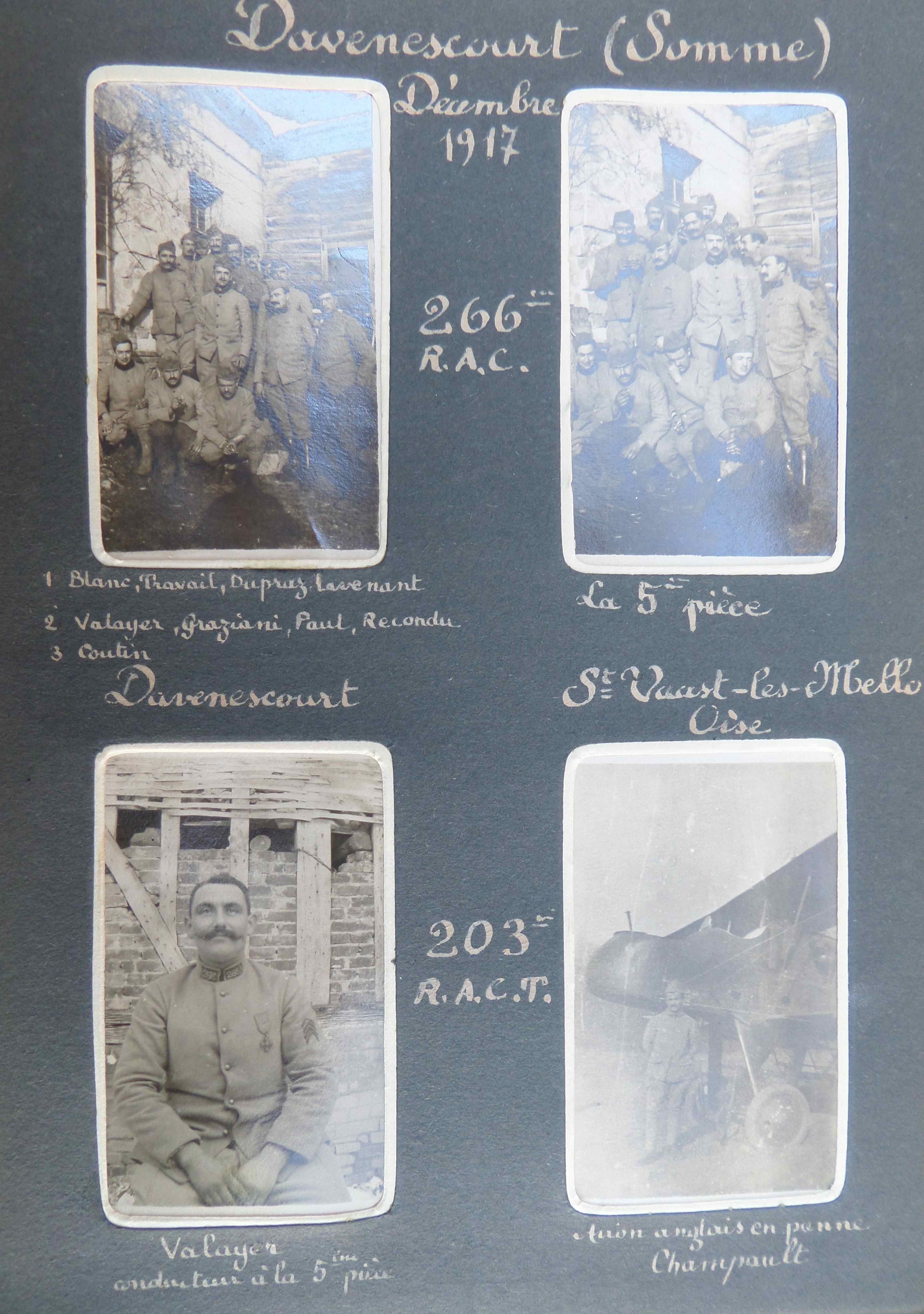 Suite de la campagne en novembre à Voyenne dans la Somme où un soldat est pris au milieu de l’entonnoir creusé par l’explosion d’un dépôt. Les hommes sont en cantonnement d’Alerte ce qui est un peu en arrière du front, prêt à monter en ligne en renfort. Puis sur deux pages, 9 photos de militaires à Davenescourt, 60km à l’ouest des vues précédentes. On apprend que les hommes appartiennent au 266ème RAC (Régiment d’Artillerie de Campagne).
