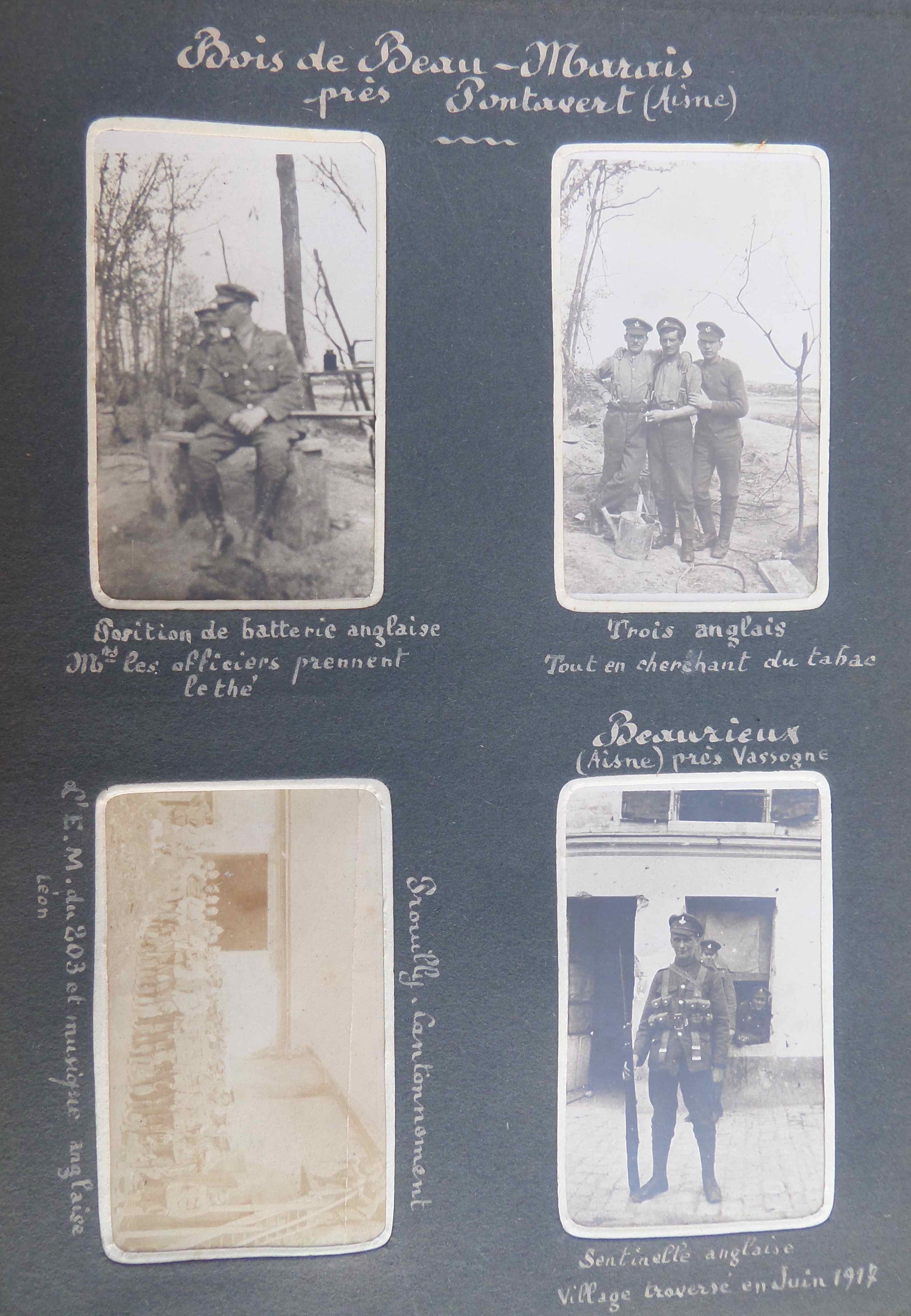Toujours dans le même secteur au Bois de Beau-Marais (Aisne) où les vues montrent des soldats anglais d’une musique est-il dit en commentaire de la dernière photo (la plus claire). La seconde photo montre une sentinelle  Beaurieux (Aisne) en juin et dans le commentaire de la 3ème photo l’auteur indique que les Officiers britanniques prennent le thé.