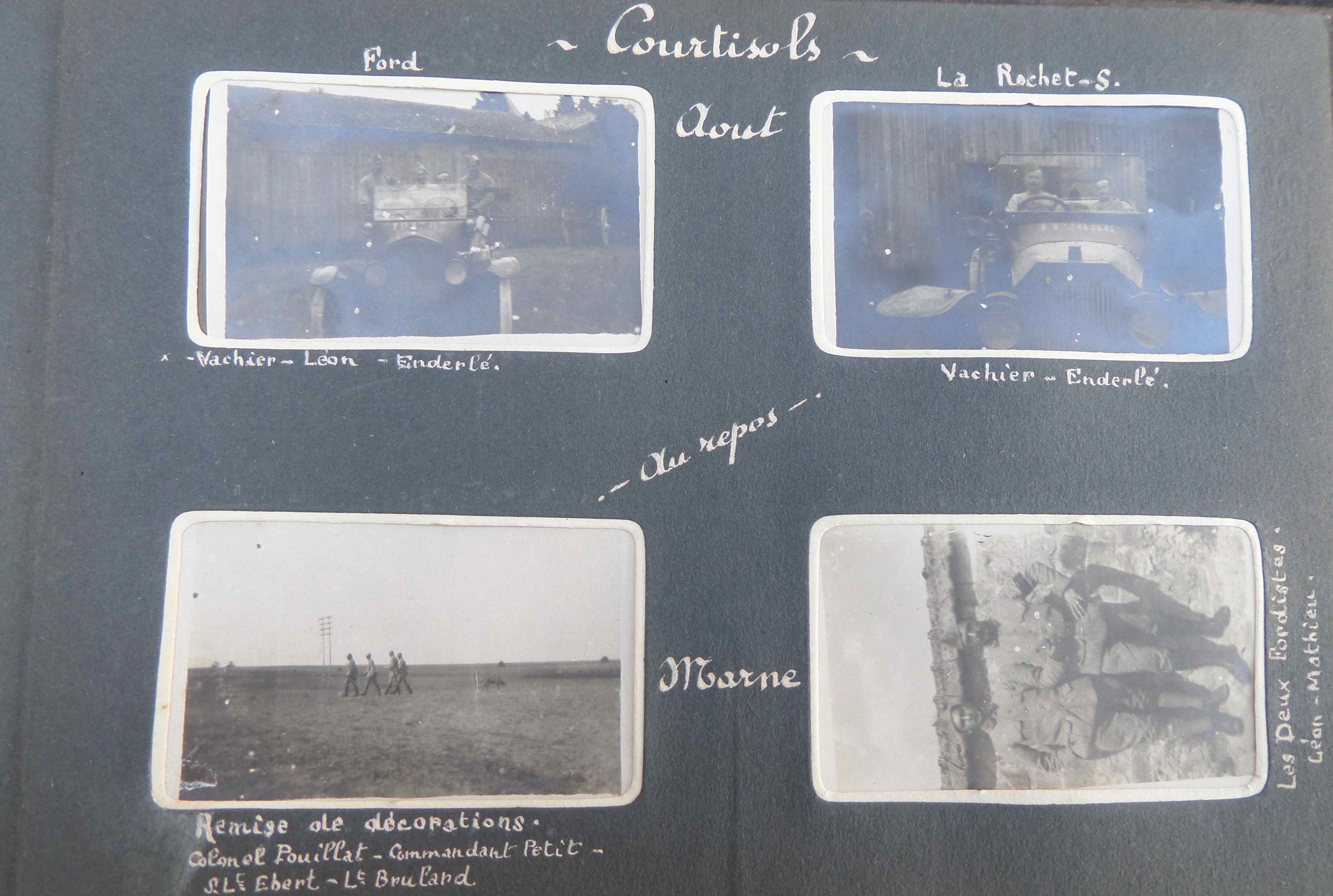 Toujours à Mourmelon, photo de droite, « 14 juillet, les boches font un feu d’artifice avec du 150 sur nos cantonnements ». Puis en-dessous en août 1918, au repos, à Courtisols (Marne) avec 3 belles photos d’une automobile Ford.