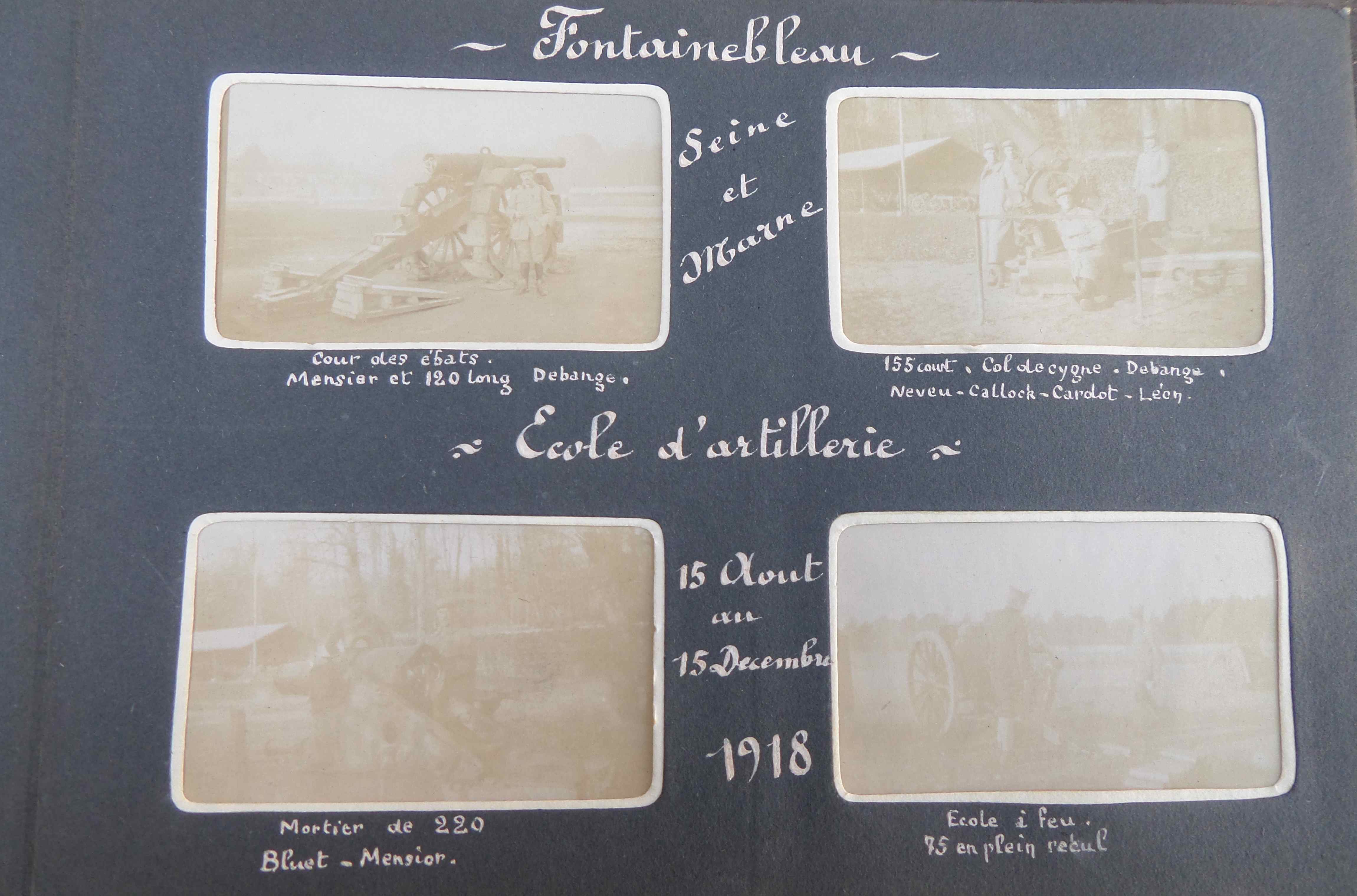 Du 15 août au 15 décembre 1918, le propriétaire de l’album finira la guerre à l’école d’artillerie de Fontainebleau: vues des pièces d’artillerie:
