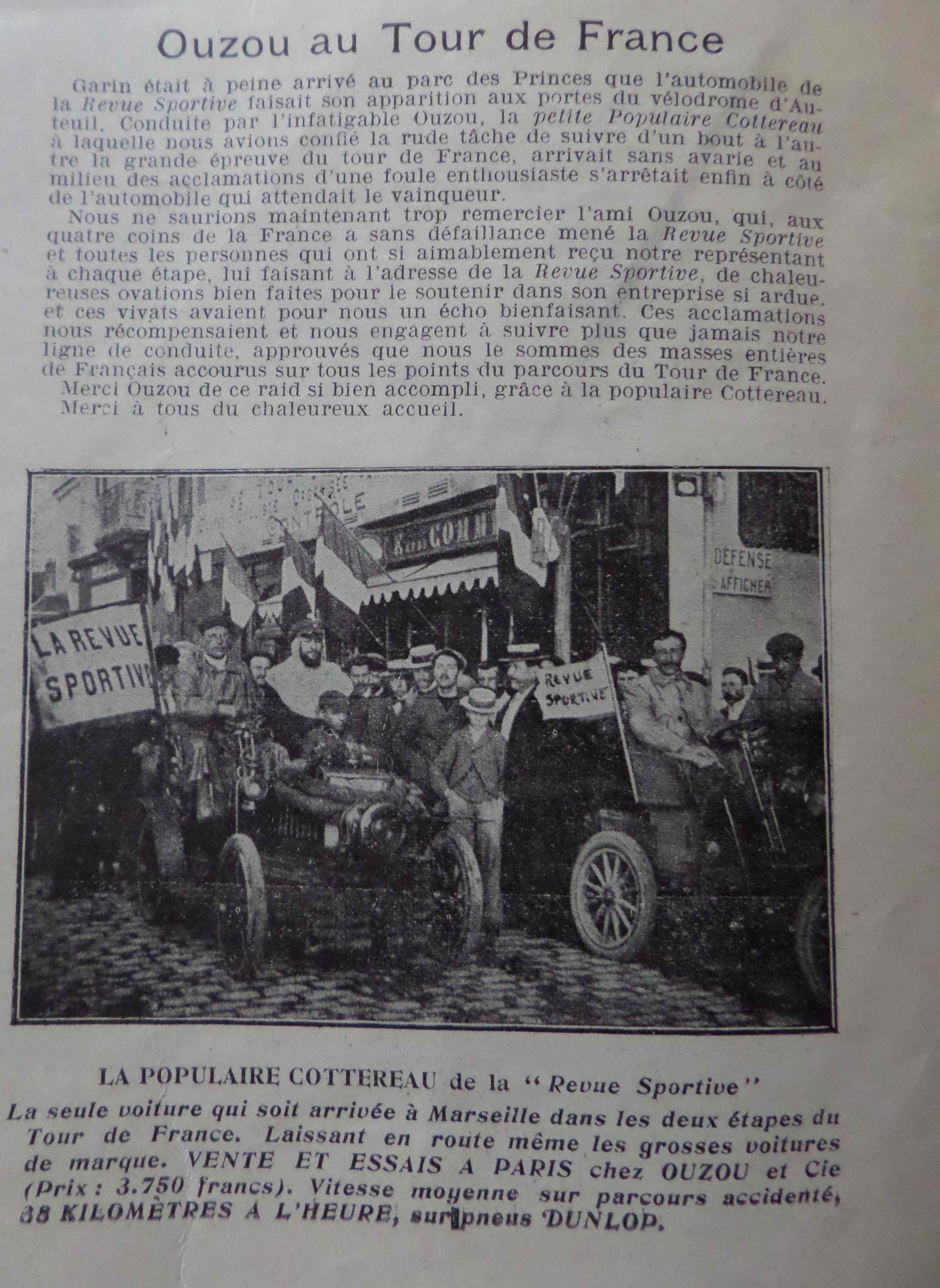 Un article (un tantinet publicitaire) nous apprend que la revue a pu suivre le Tour grâce à une voiture, la petite populaire  Cottereau prêtée et distribuée chez Ouzou à Paris. Ce bolide est le seul à être arrivé à Marseille et pouvait atteindre 88km/h sur parcours accidenté.