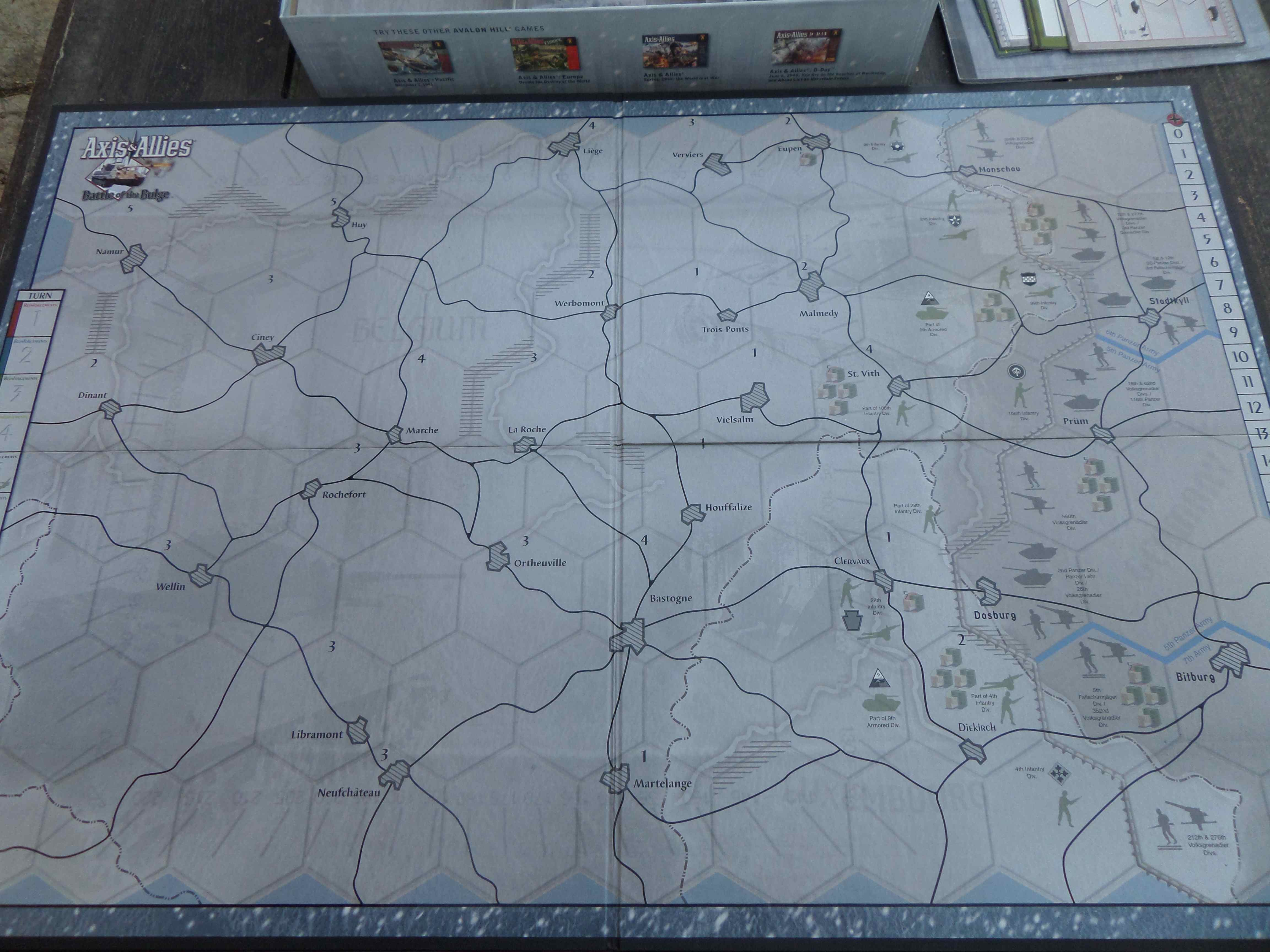 Dans la collection Axis & Allies, un jeu de simulation historique faisant revivre la Bataille des Ardennes en décembre1944-janvier 1945. Edité par Avalon Hill en anglais. Traduction en français déposée sur Ludism.fr, le site de règles.