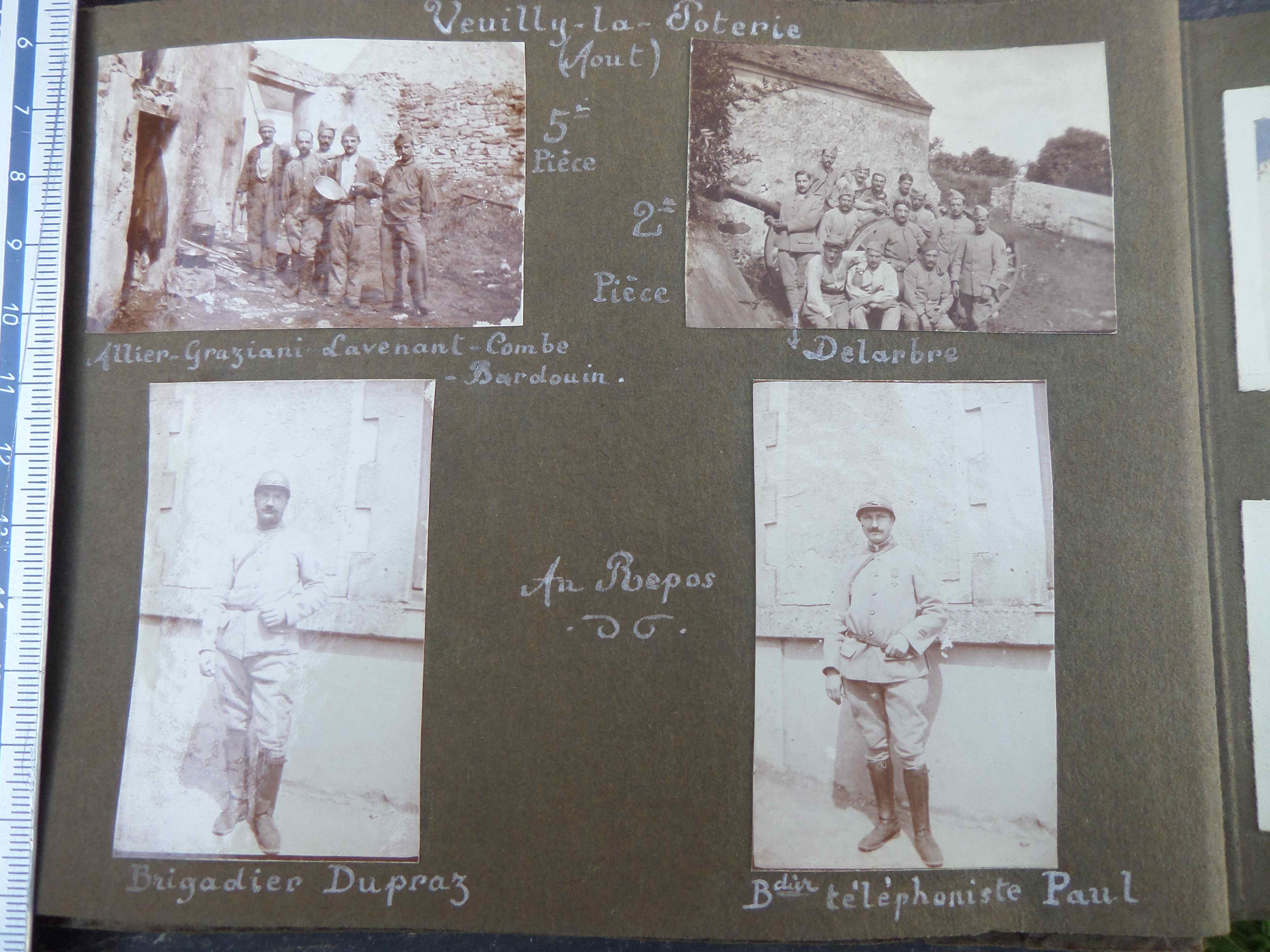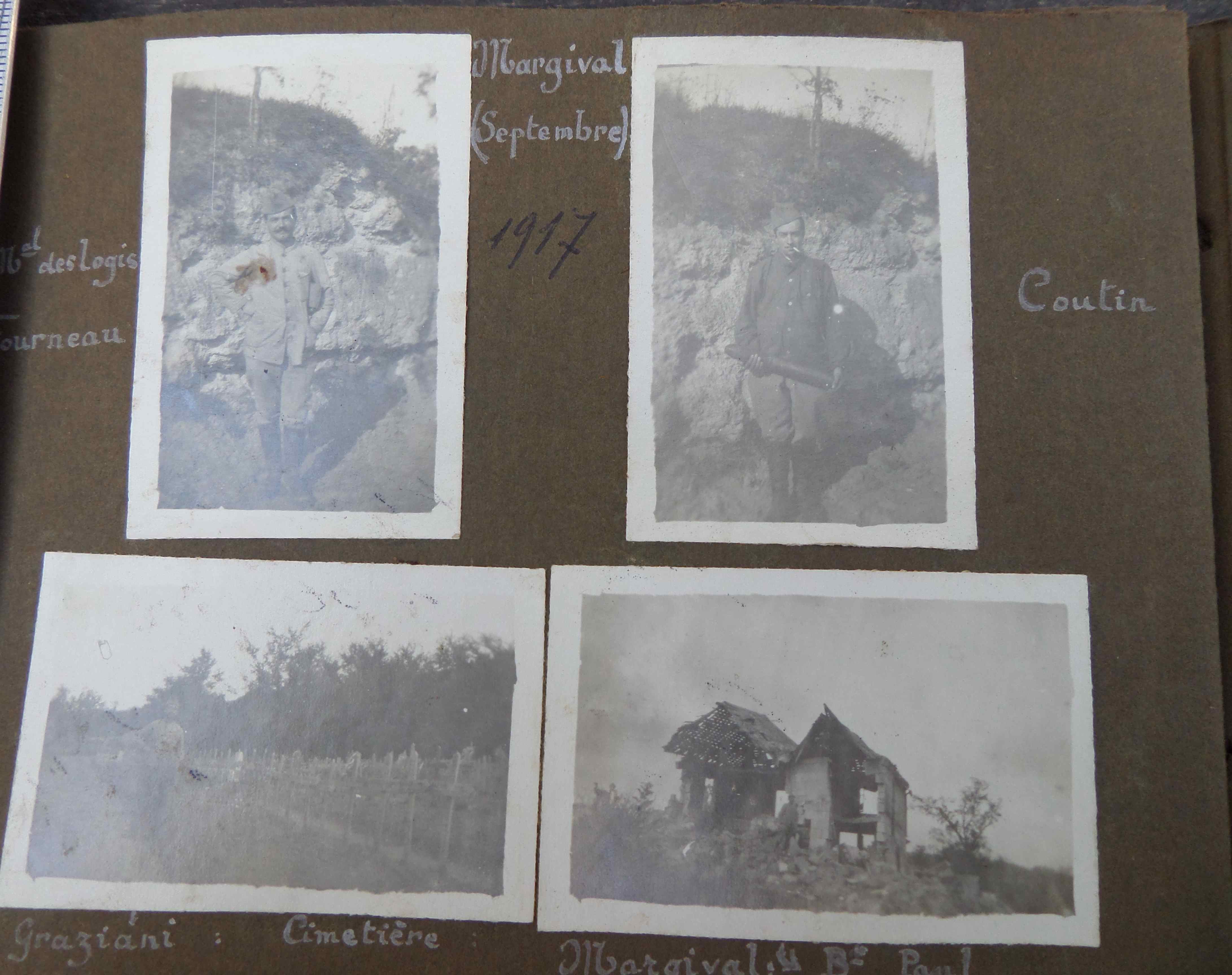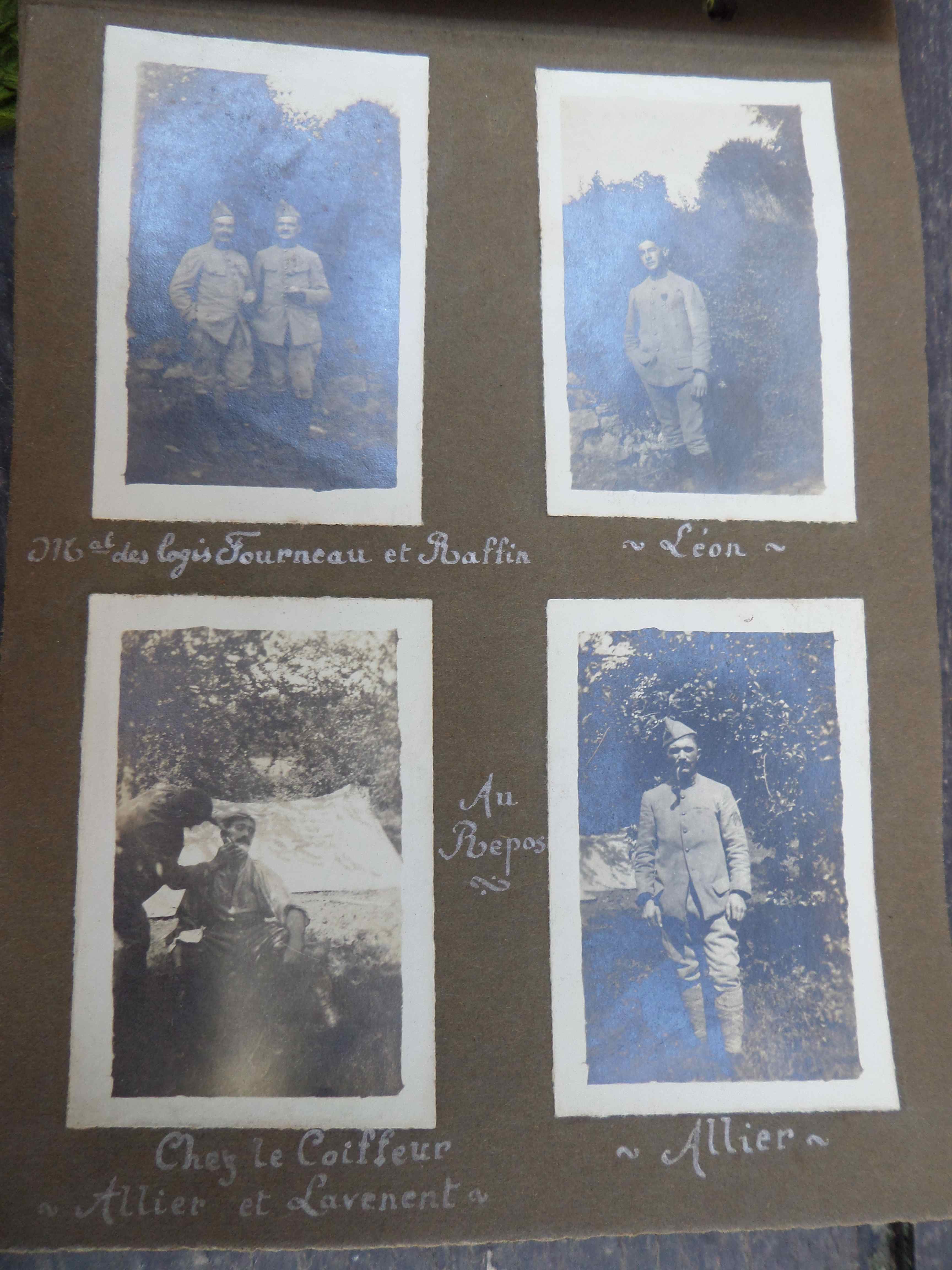 Un petit album-photo de 12 pages (format 19x13cm) avec des tirages (petit format 6,5x4cm) sur la vie dans les tranchées et au repos à l’arrière d’un poilu de 14-18. L’album est commenté avec les dates (de juin à octobre 1917), les lieux (région Laon-Reims-Soissons) et les noms des copains de galère.