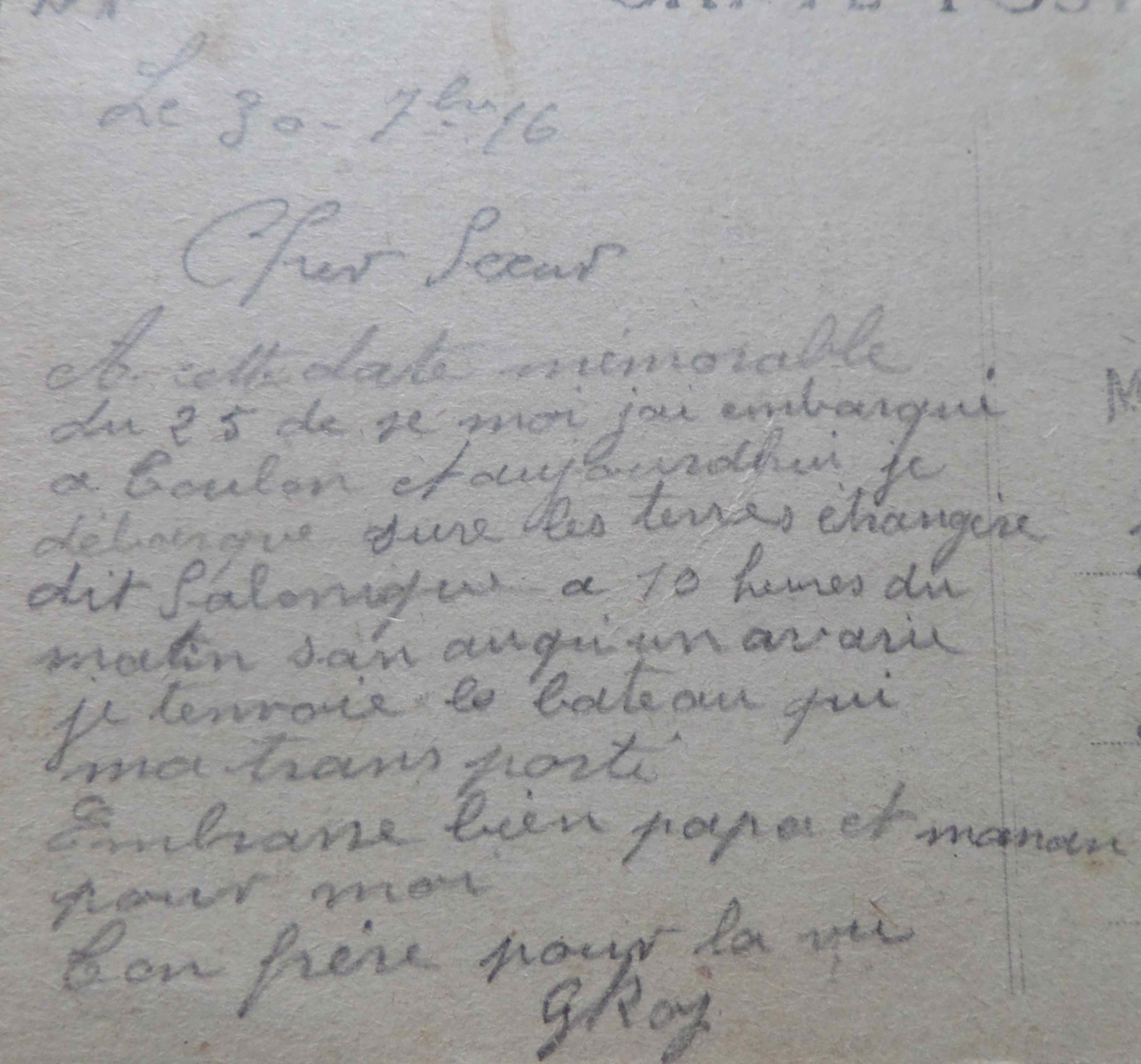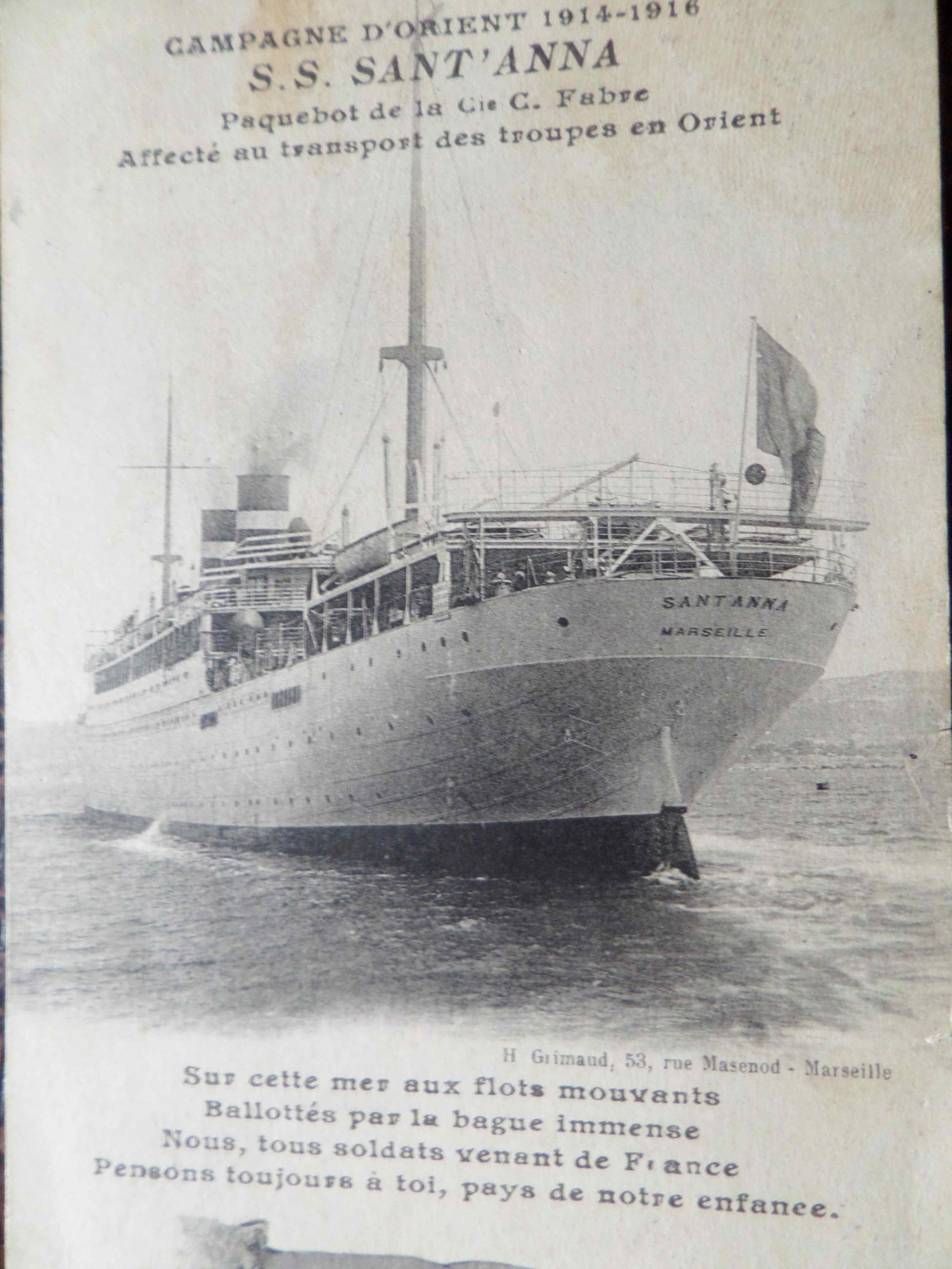 30 septembre 1916: le grand départ dans le paquebot S.S. SANT’ANNA à partir de Toulon… et à destination de Salonique. Le voyage a duré 5 jours. Le petit fils de cheminot de Charente se retrouve en Grèce après un beau voyage lui qui certainement n’avait jamais imaginé cela!