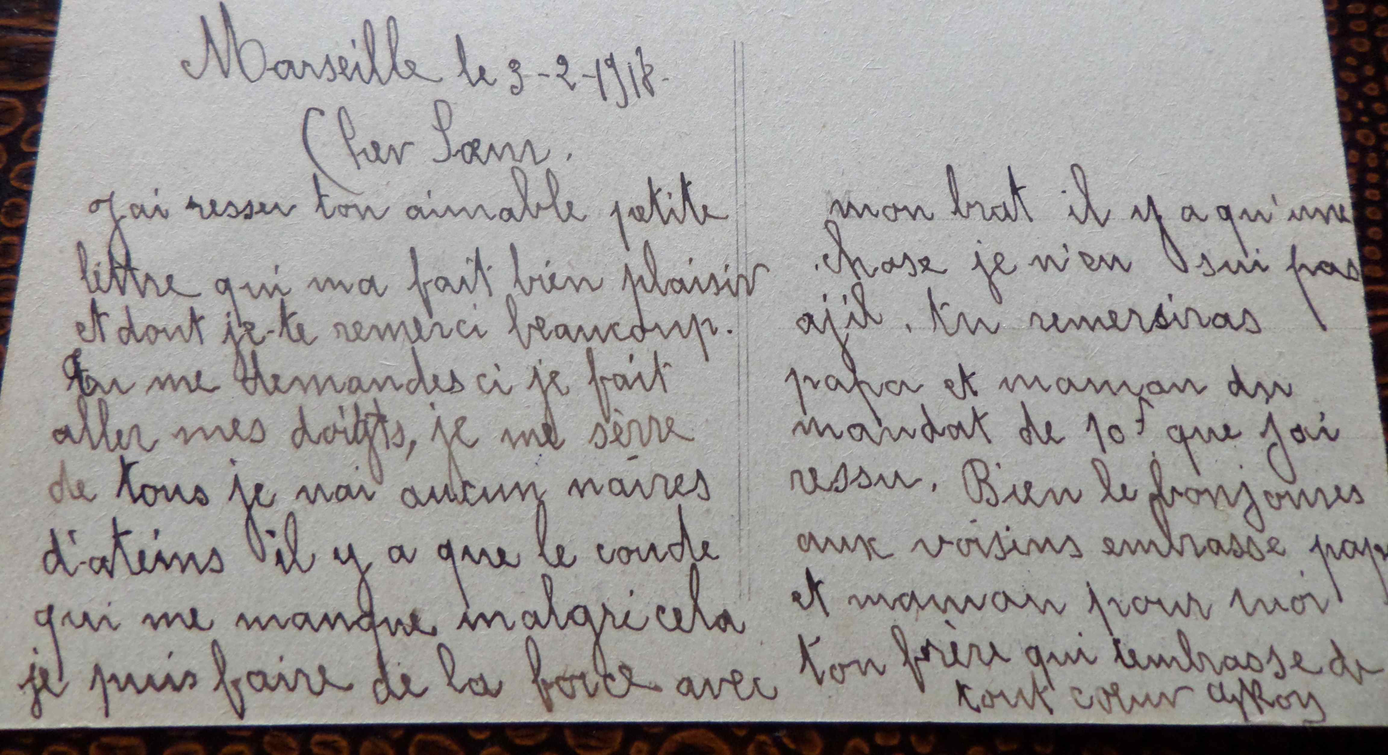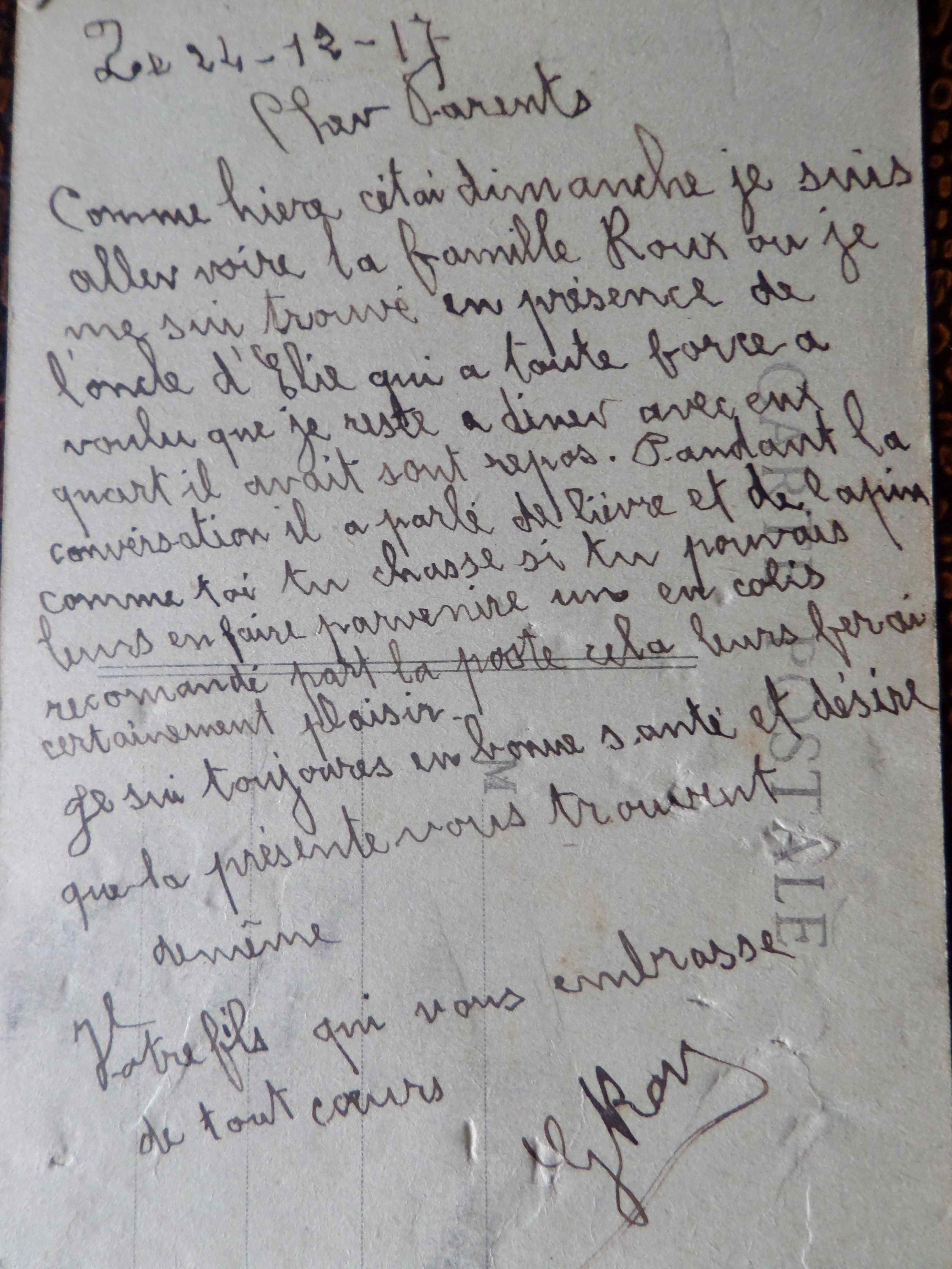 La première chose qui saute aux yeux, c’est l’écriture qui a totalement changé. L’inclinaison de ses lettres est inversée et le trait est beaucoup plus hésitant… comme s’il écrivait avec sa main gauche. Comme il doit plus s’appliquer et mettre plus de temps, il fait beaucoup moins d’erreurs d’orthographe. Dans la première lettre, une phrase lourde de sens pour expliquer qu’il ne va pas rentrer en permission: « … alors j’attendrais d’avoir mon appareil qui j’espère ne tardera pas d’être fini et livré. » Plus légère la lettre du 24 dans laquelle il demande à son père de faire « parvenir un lièvre ou un lapin » à des amis marseillais-les Roux-, « par colis recommandé ».