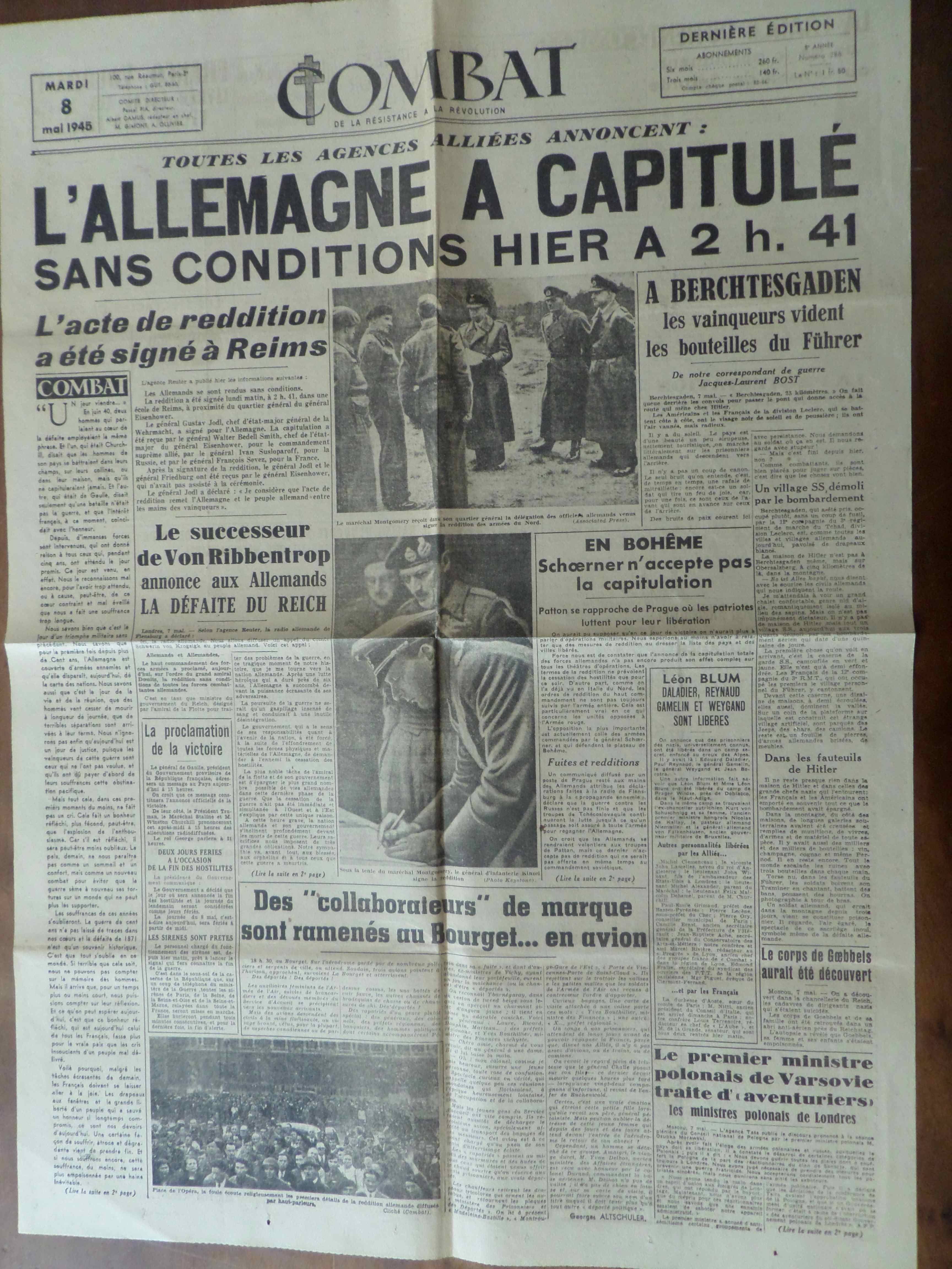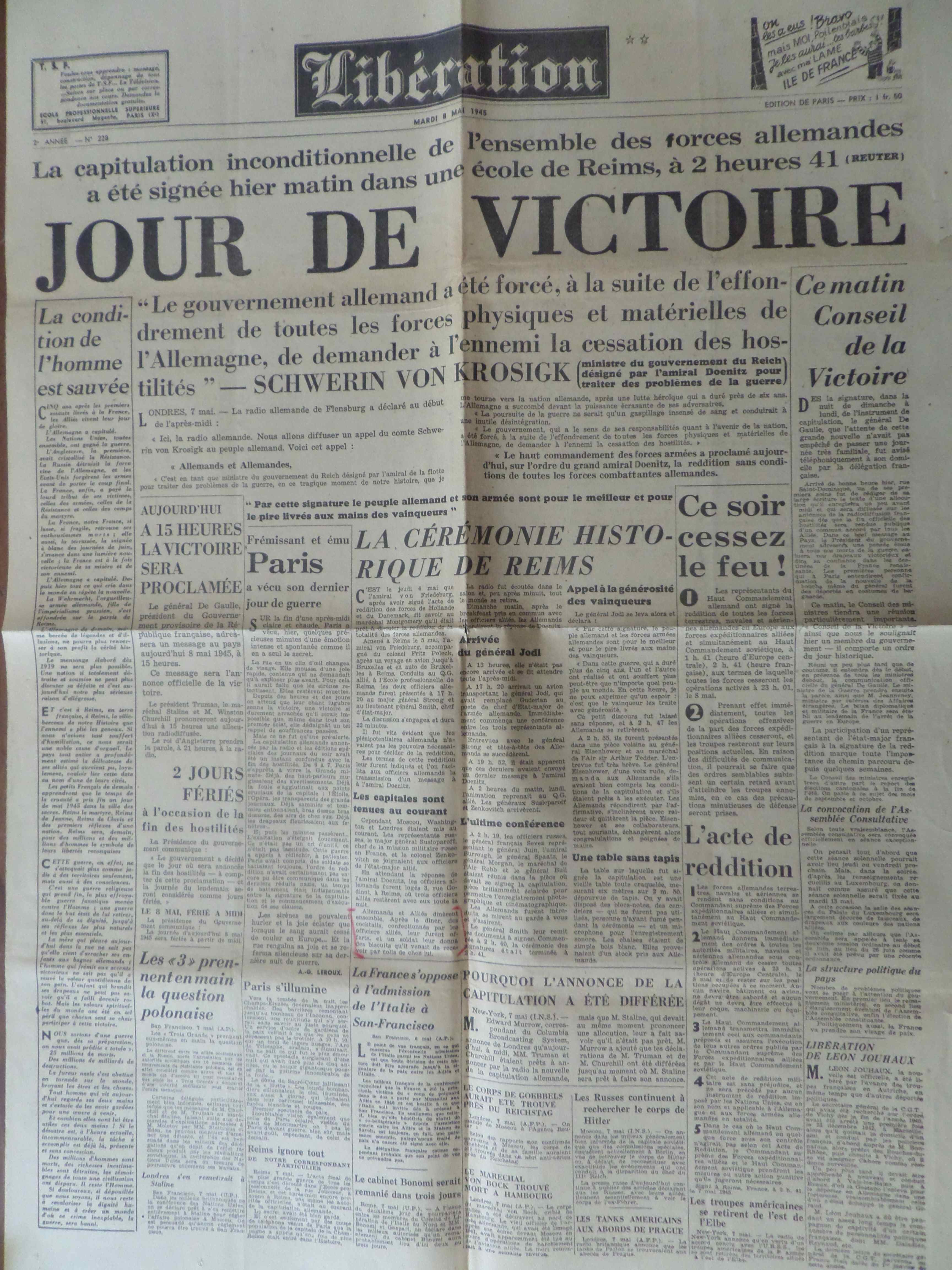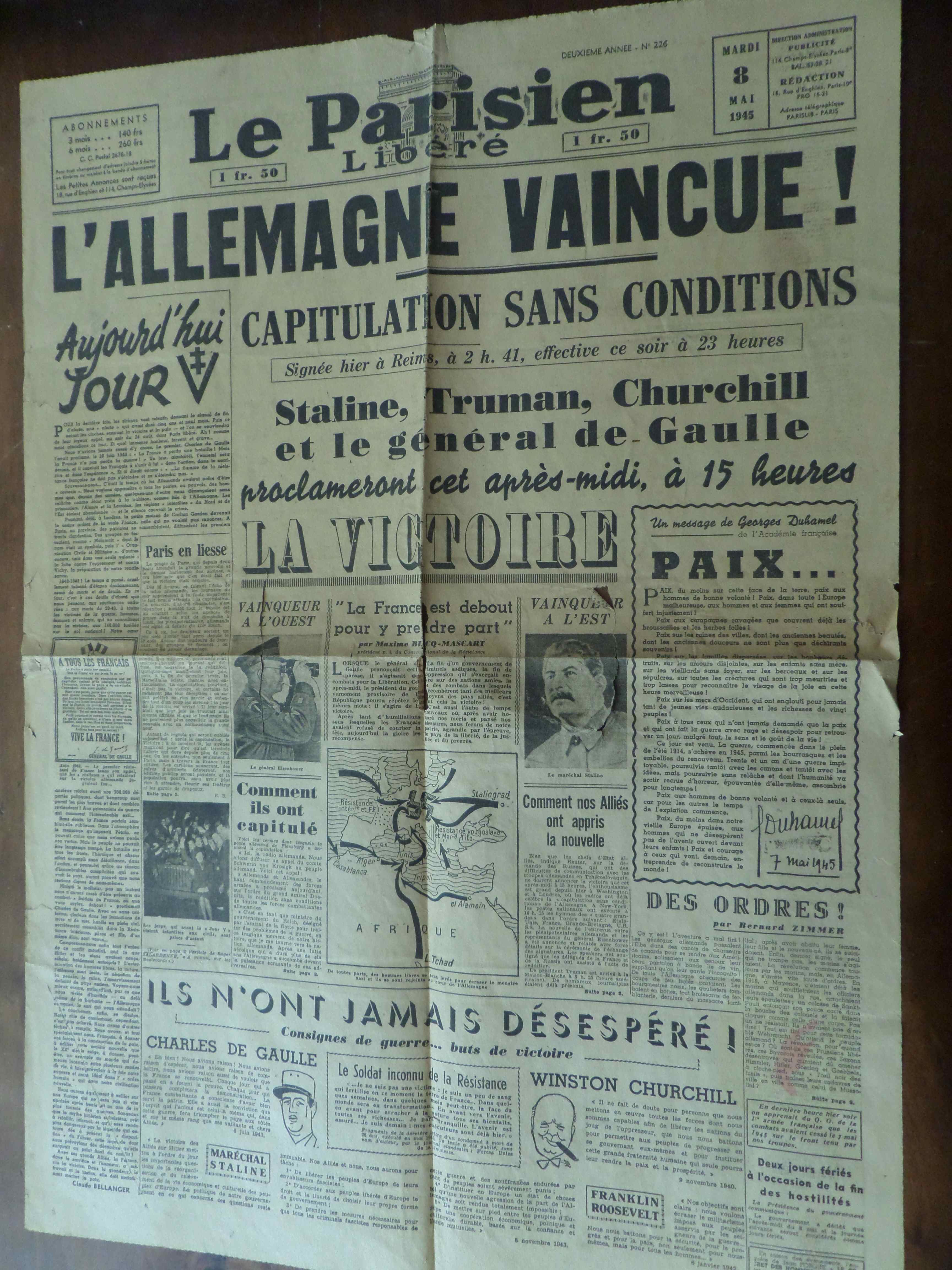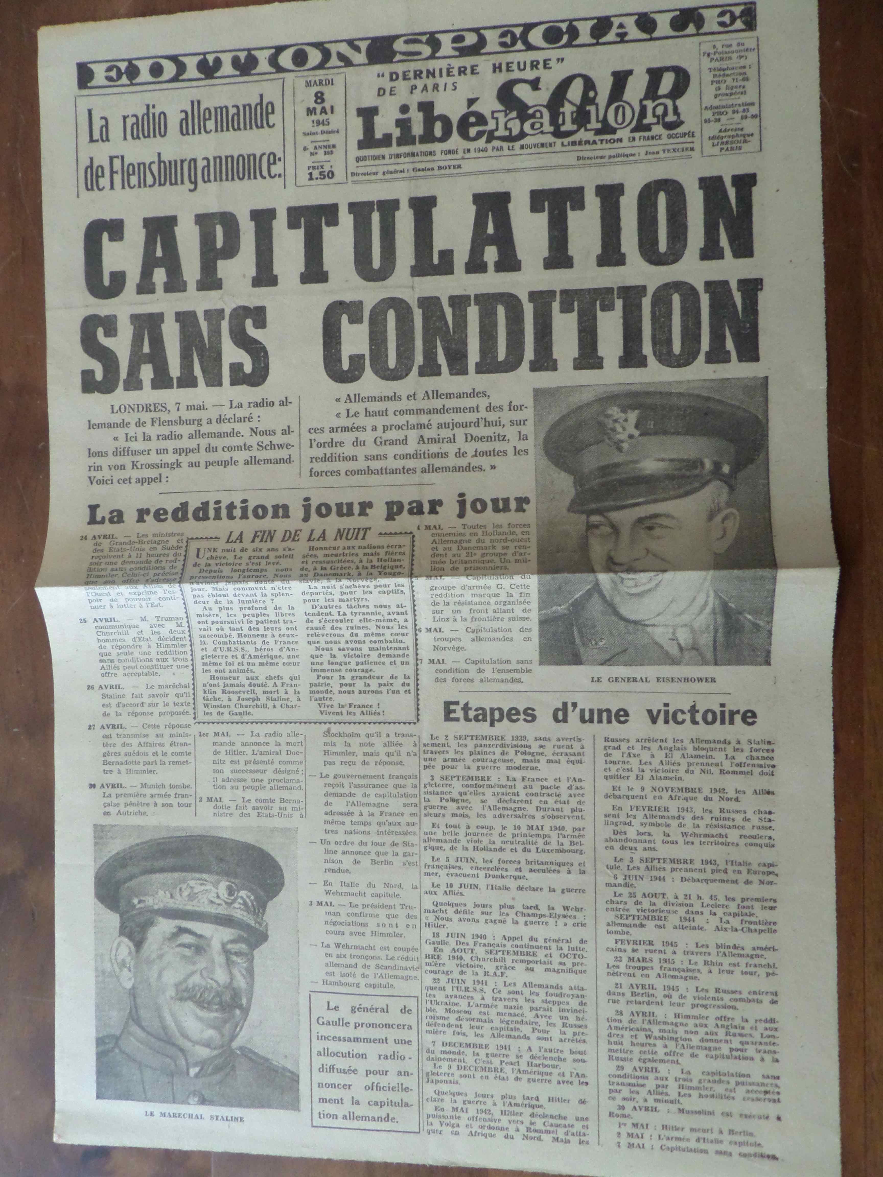 Tout simplement parce que la Capitulation a été signée une première fois à Reims le 7 mai et suite à la susceptibilité de Staline, une seconde Capitulation sera entérinée le 8 mai à Berlin. C’est cette seconde date que l’Histoire retiendra. Au début d’ailleurs (1946, 47), les célébrations de la fin de la guerre s’étalaient officiellement sur 2 jours en France. Pour d’autres journaux du soir, c’est du 8 mai dont on parle.