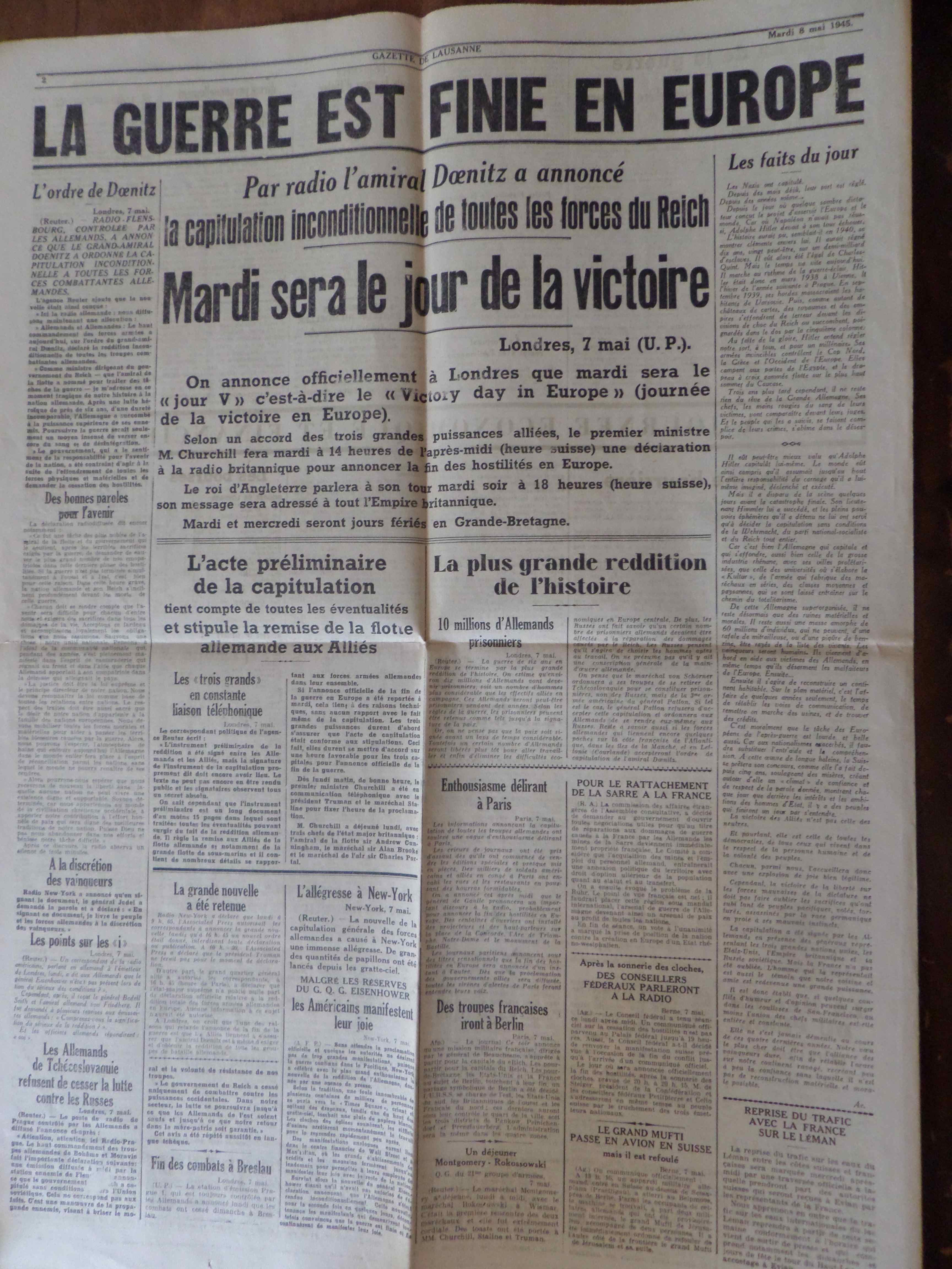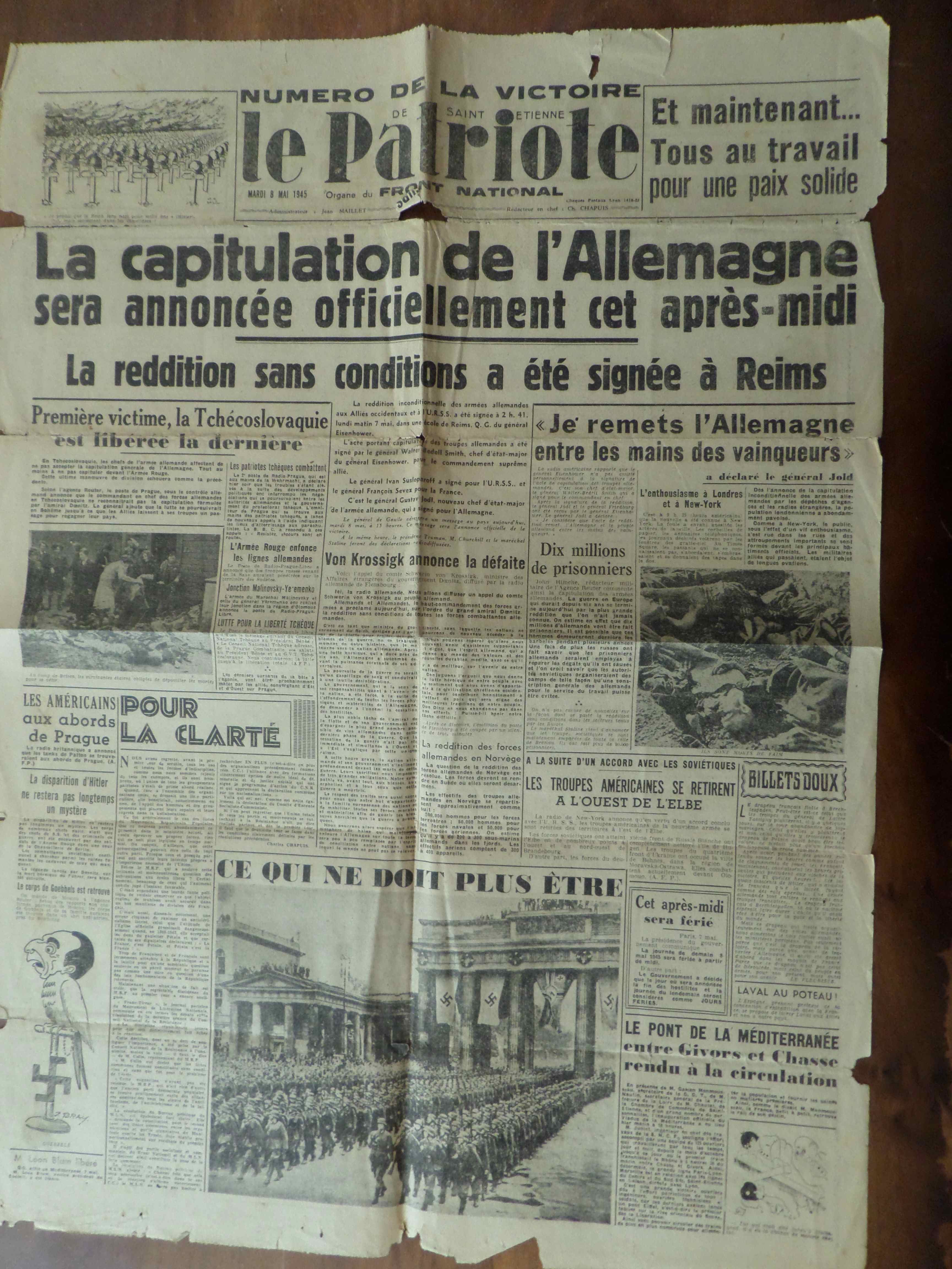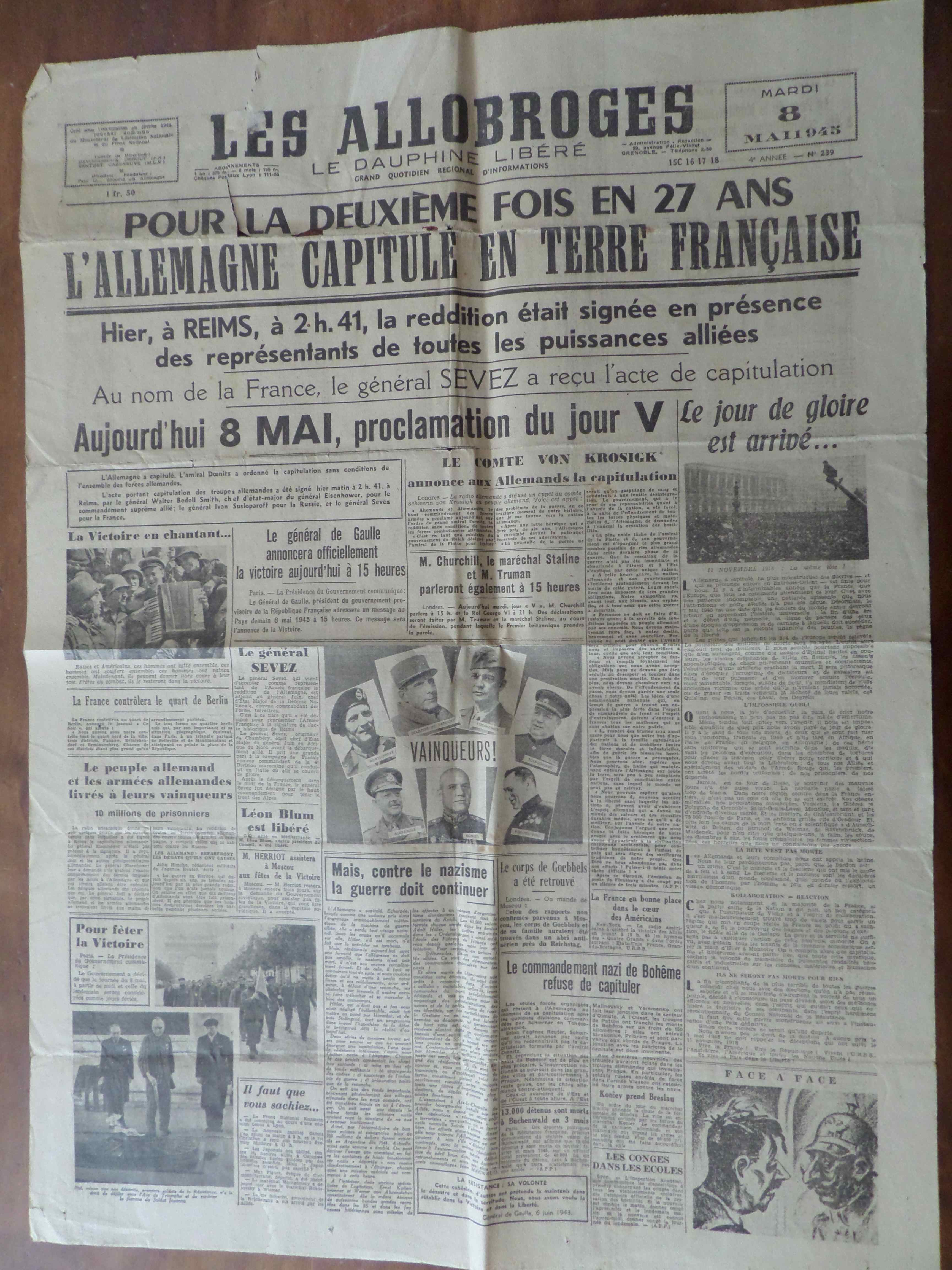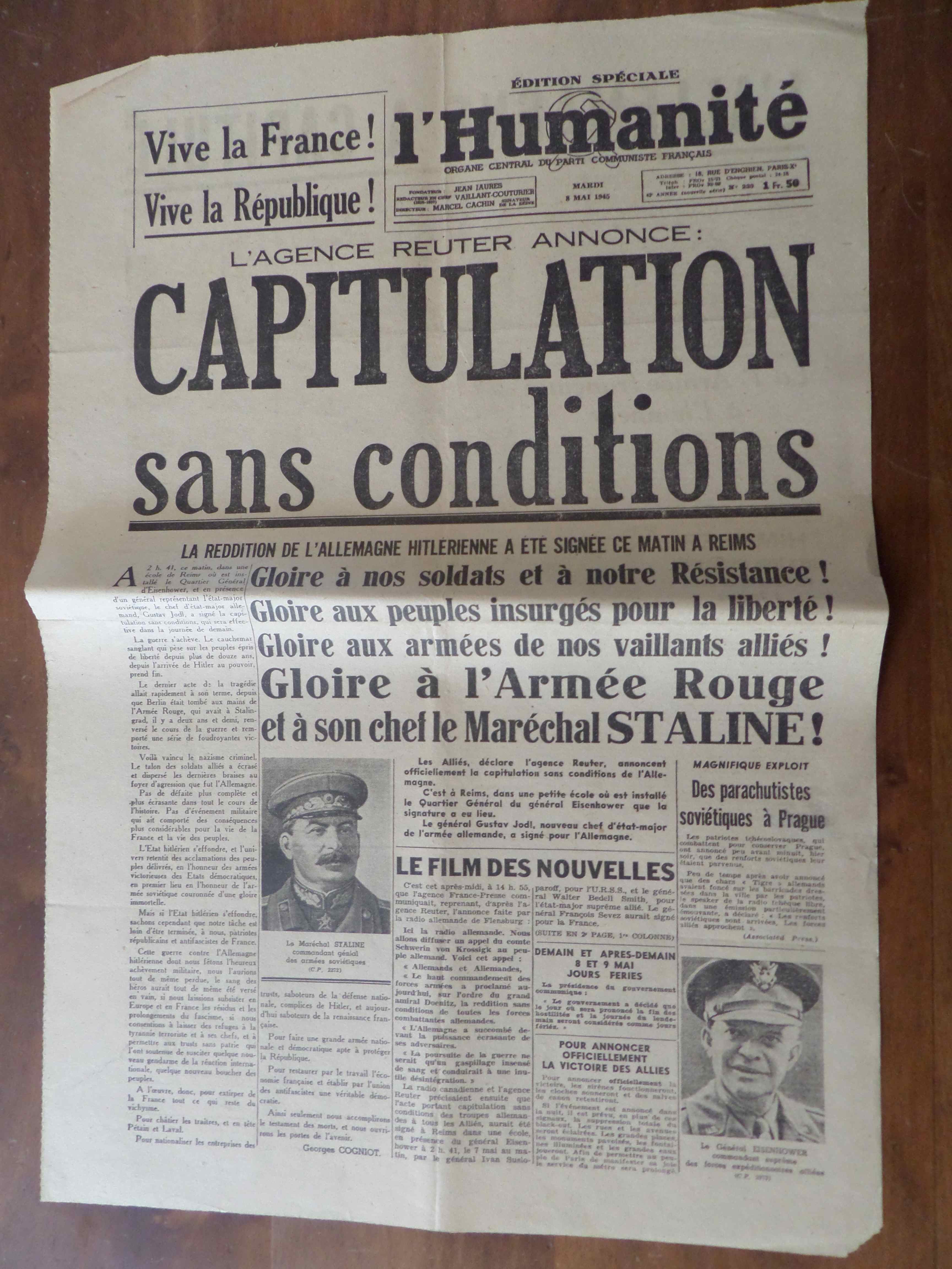 Tout simplement parce que la Capitulation a été signée une première fois à Reims le 7 mai et suite à la susceptibilité de Staline, une seconde Capitulation sera entérinée le 8 mai à Berlin. C’est cette seconde date que l’Histoire retiendra. Au début d’ailleurs (1946, 47), les célébrations de la fin de la guerre s’étalaient officiellement sur 2 jours en France. Pour d’autres journaux du soir, c’est du 8 mai dont on parle.
