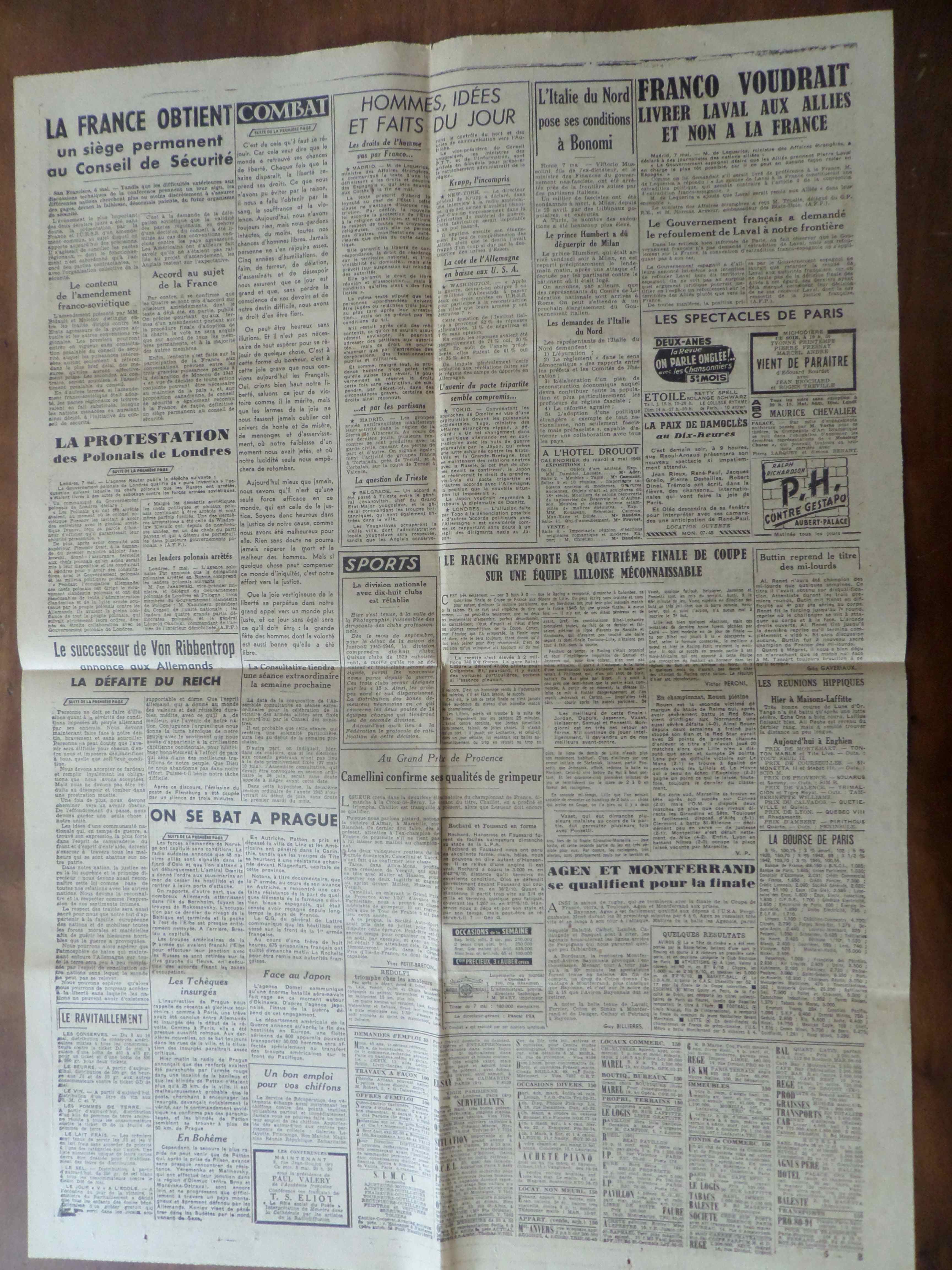 COMBAT (de la Résistance et de la Révolution), titre issu de la clandestinité, dernière édition, 1 page grand format recto-verso