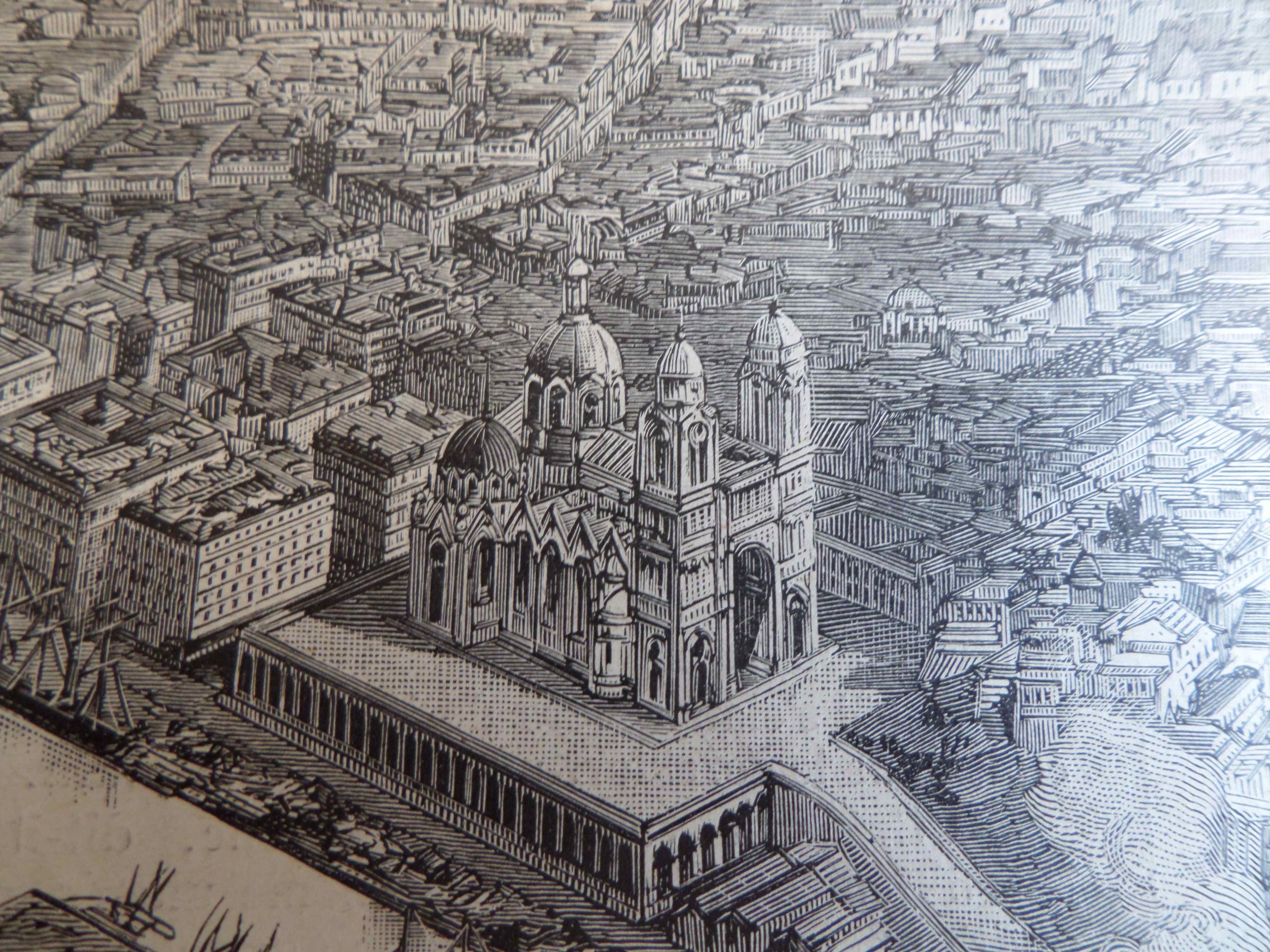 Dans le prolongement de la Canebière, tout au fond, le dessinateur n’a pas oublié le palais Longchamp, un peu disproportionné, et sa fontaine monumentale…