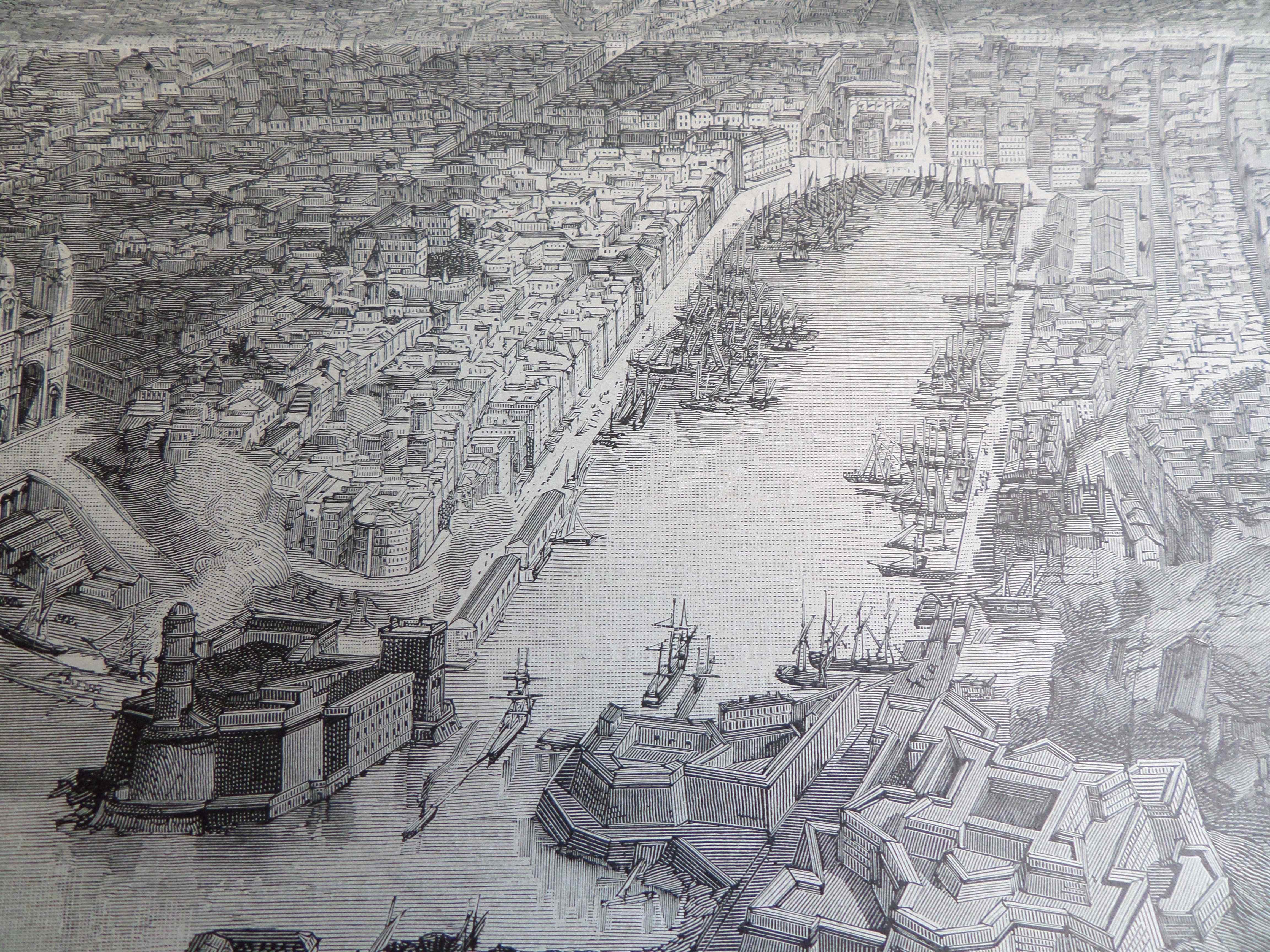 dont l’entrée est gardée par le fort Saint-Nicolas. A noter qu’à l’entrée du port, le pont transbordeur, emblème du Marseille d’avant-guerre ne fut construit que 15 ans plus tard, en 1905.