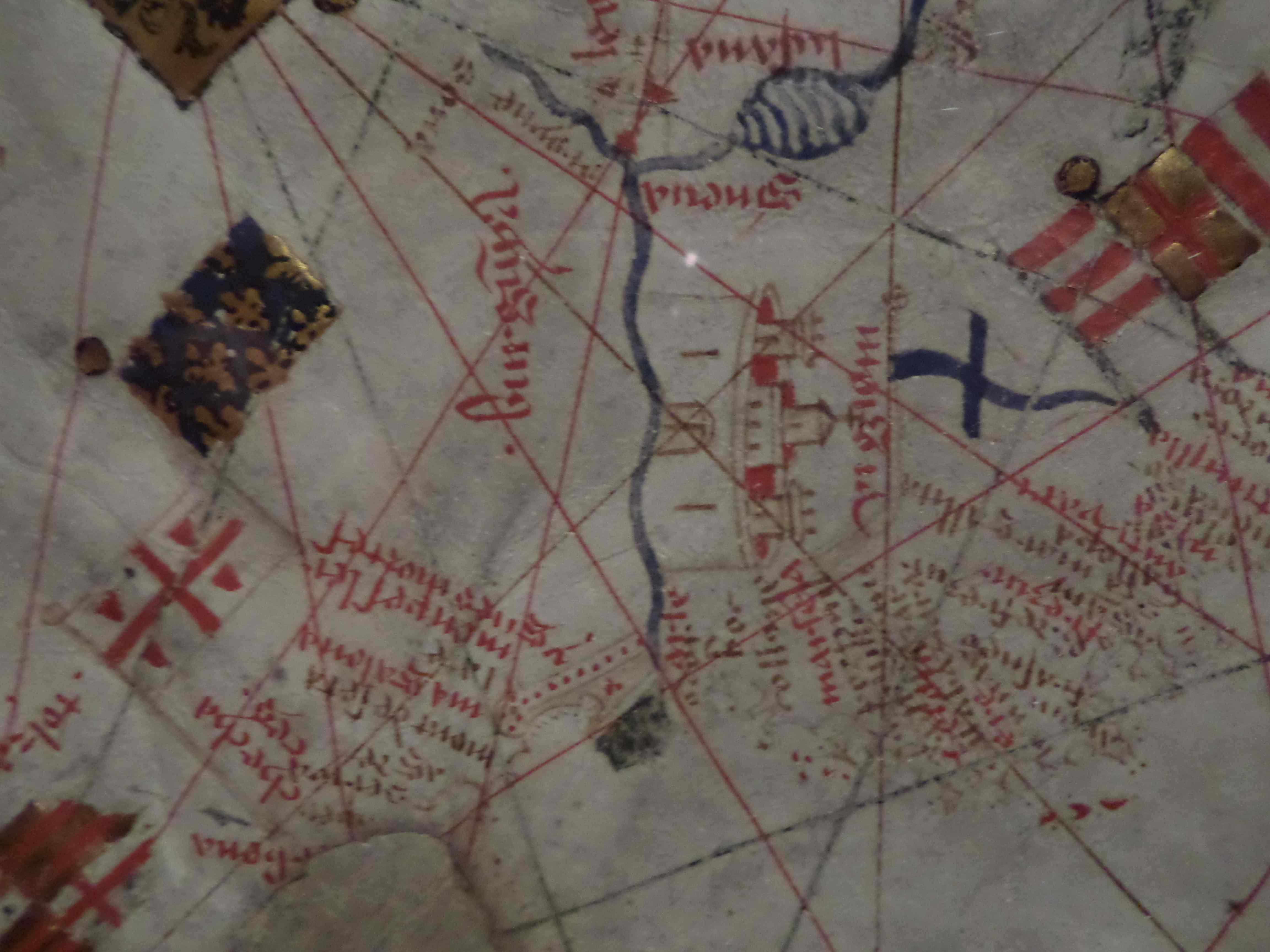 Sur une carte originale du Bassin Méditerranéen datant du Moyen Age, assez difficile à comprendre (les cotes étant représentées non pas par un trait bleu comme d’habitude mais par les noms des ports écrits en parallèle et perpendiculairement à la mer), sur cette carte étaient tracés les chemins empruntés par les pèlerins en mer, en Europe et en Afrique du nord.