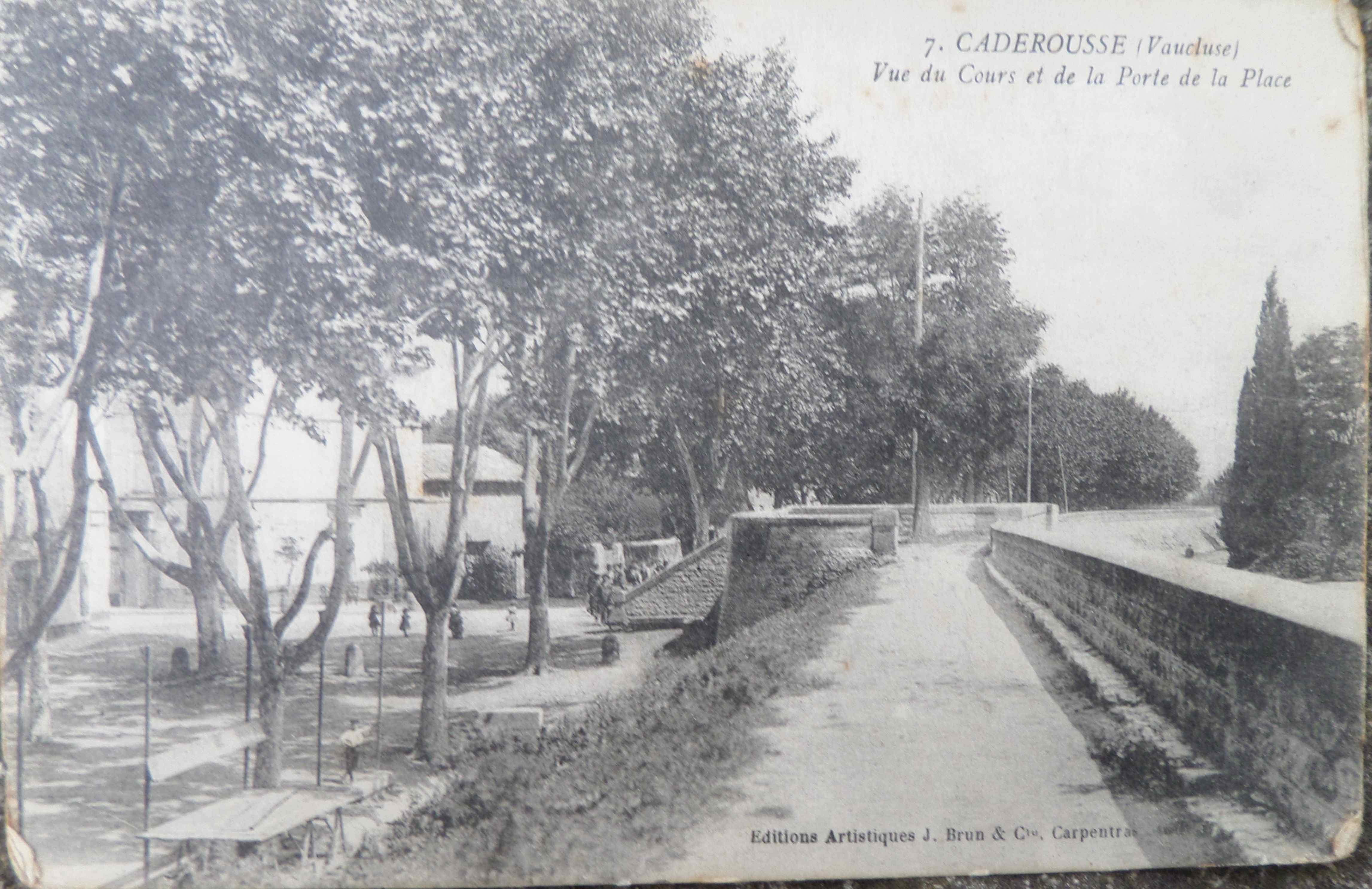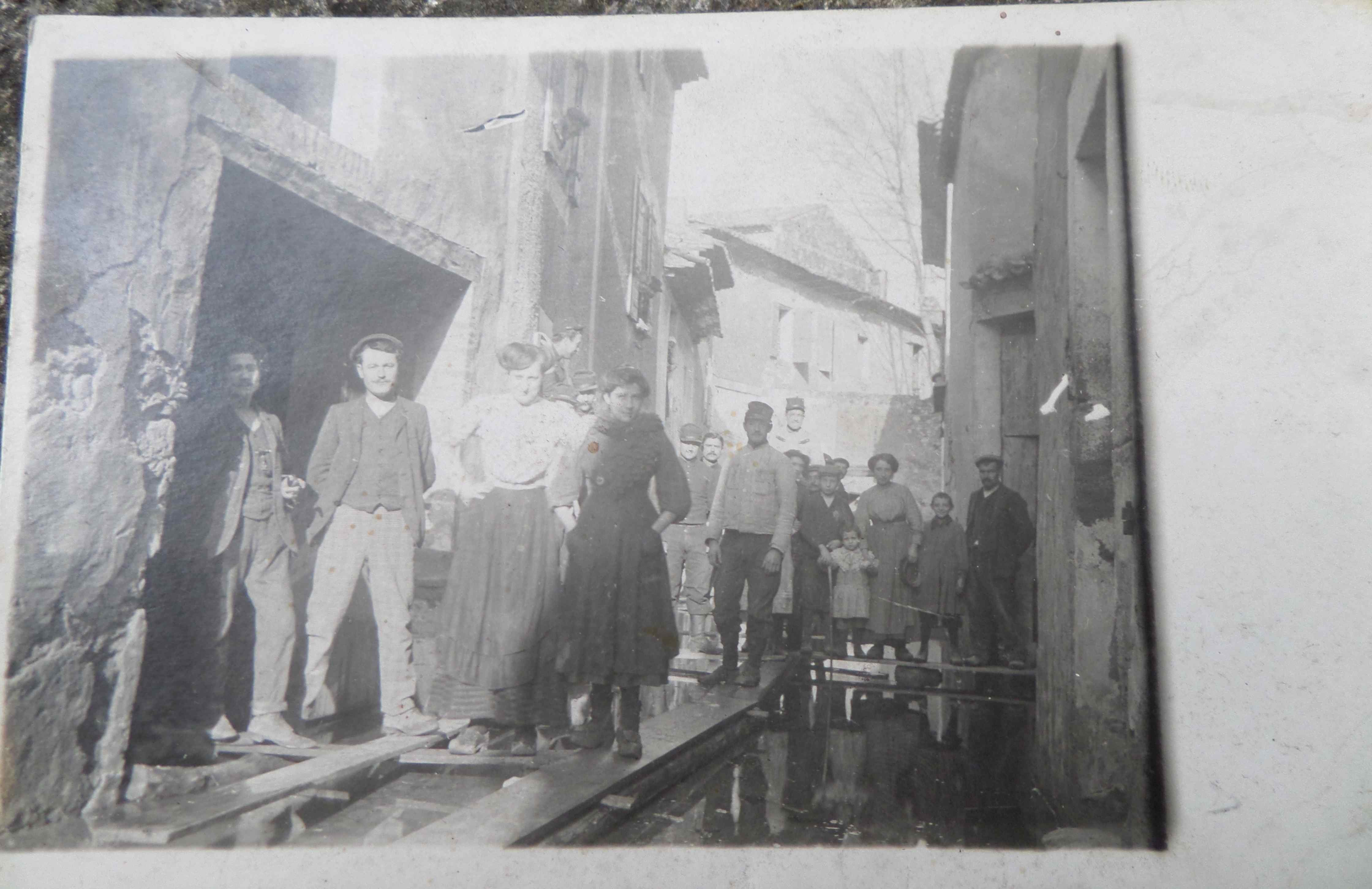 Datée de 1907, l’eau (certainement d’infiltration) stagne dans les rues du village et les caderoussiers ont installé des madriers sur des parpaings pour circuler les pieds au sec. La vue a été prise rue Pied Gaillard, le bâtiment au fond étant l’actuel EHPAD qu’on appelait alors l’Hôpital (comprendre l’Hospice). Les personnes posant sur la passerelle de droite sont certainement Adrien Guérin dont on a vu qu’il allait disparaître en 1915 à la Pompelle (1er à partir de la droite), sa femme Léonie (3ème à partir de la droite). Entre les 2, peut-être Séraphin le frère aîné de mon grand-père (né en 1897 donc âgé de 10 ans). L’enfant habillé en fille était peut-être mon grand-père Gabriel (né en 1901 donc âgé de 6 ans). Beaucoup de militaires (5) apparaissent sur la photo, l’armée devait avoir été envoyée à Caderousse pour aider les habitants. Bien qu’il n’y ait pas plus 15cm, les maisons devaient être particulièrement humides!