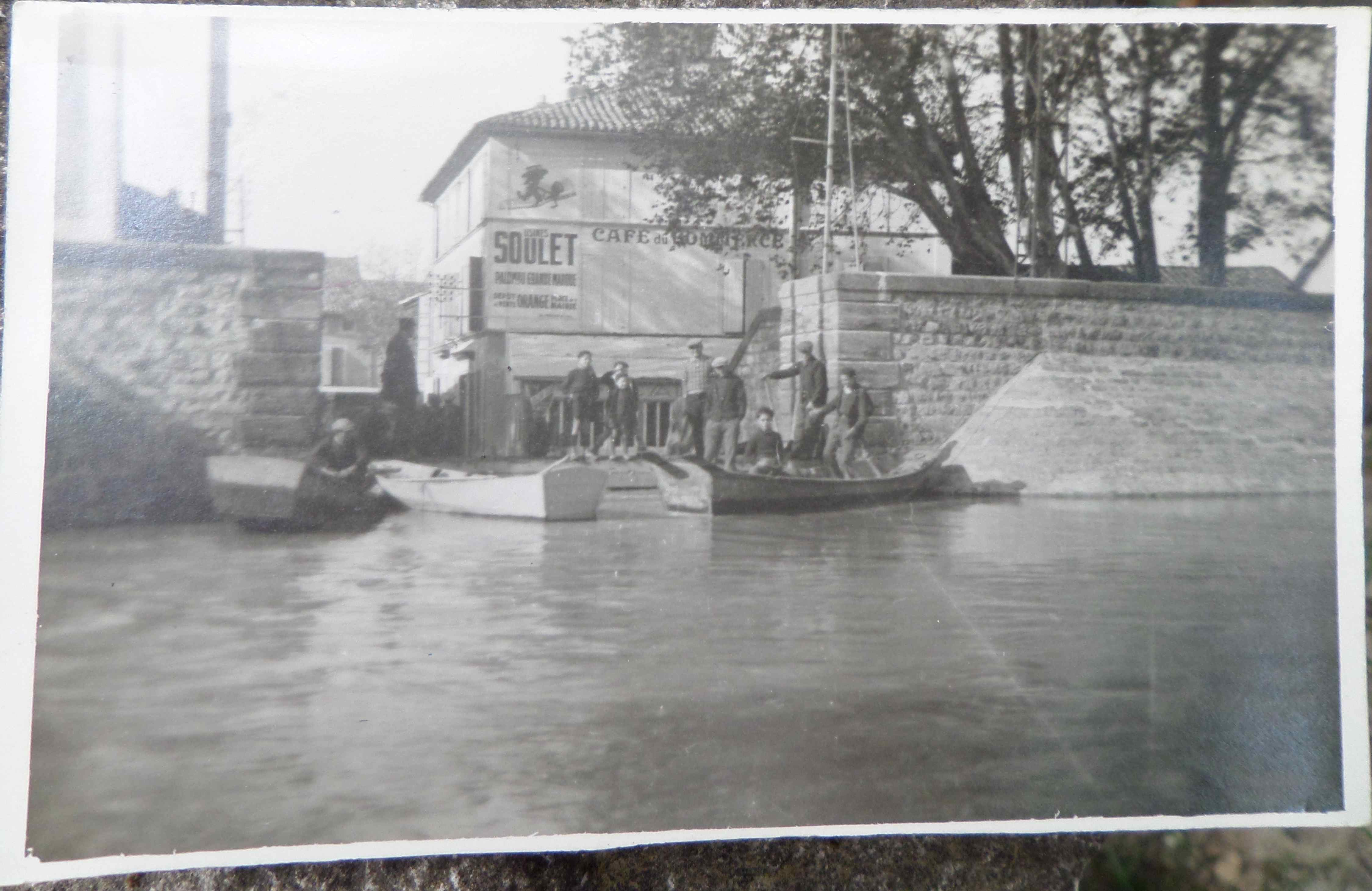Le poids inondé. Ce poids qui existe toujours est à l’extérieur des digues, en face du portail d’Orange (la photo a été prise de cet endroit) et en face de l’actuelle station-service. La route qui part à droite est celle d’Orange. Malgré qu’elle soit relevée, l’eau la recouvre. Les paysans viennent au village en barque. A l’époque, chaque ferme en possédait une qui était consciencieusement entretenue (étanchéité au goudron).