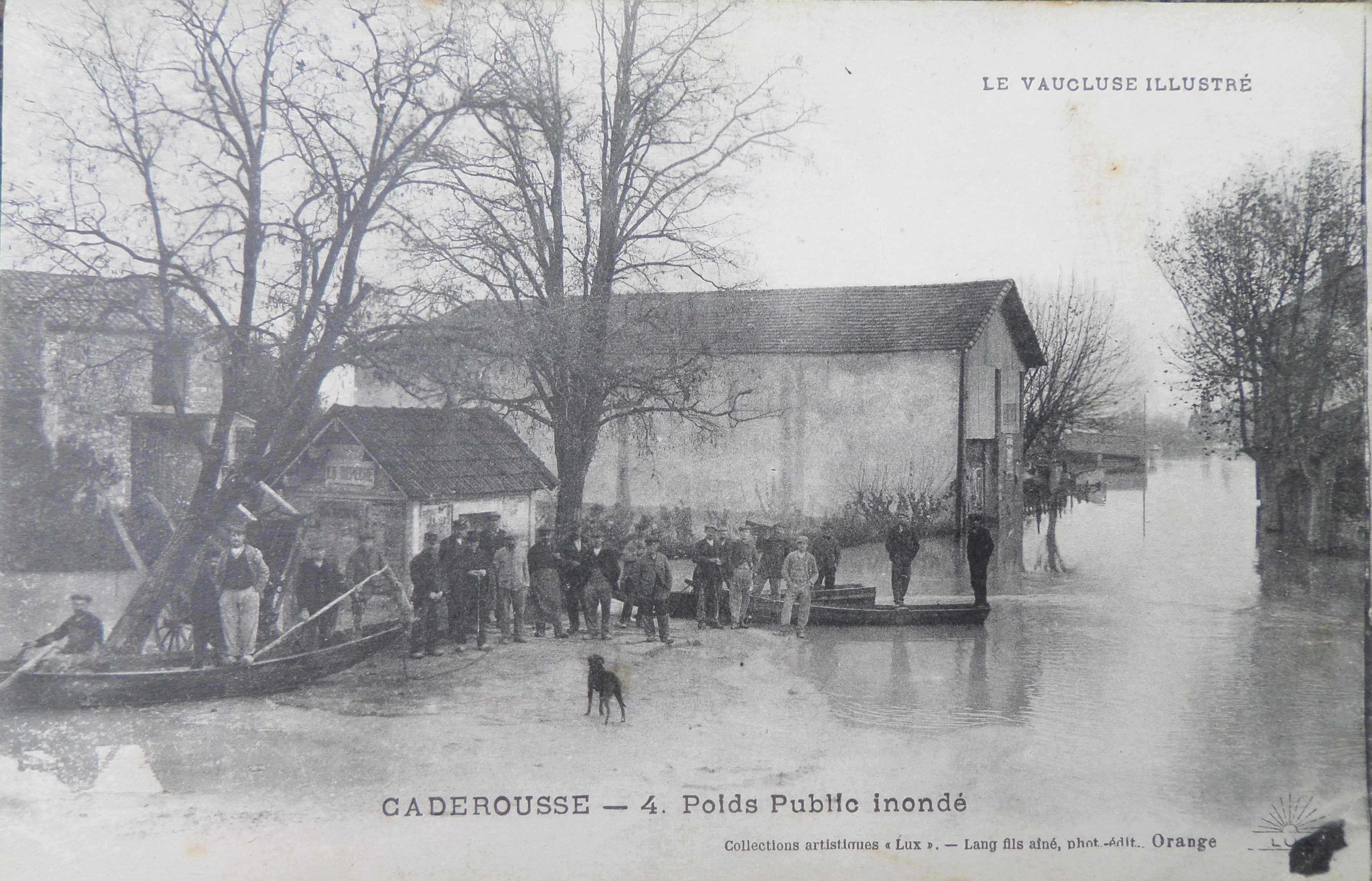 La seconde photo date d’août 1924 et est prise devant un café du cours Aristide Briand (le serveur au second rang posant fièrement pieds nus et plateau à la main!). Les banderoles de drapeaux montrent que c’est la fête du village. On voit les baraques de forains qui baignent à droite. Les tables des cafetiers sont devenues des passerelles pour éviter de se mouiller les pieds. Petit hiatus, la photo date d’août 1924 alors que la fête du village a lieu à la Saint-Michel le 29 septembre. Cette année-là, une expérience malheureuse avait été tentée de l’avancer en août… expérience ratée car un orage dantesque avait tout inondé. Une plaque posée sur le théâtre antique d’Orange indique la hauteur des eaux dans cette ville, submergée par la Meyne. Caderousse, à 8km de là, avait subi le même orage et les digues avaient empêché les eaux de s’évacuer… et le fête votive de se dérouler!