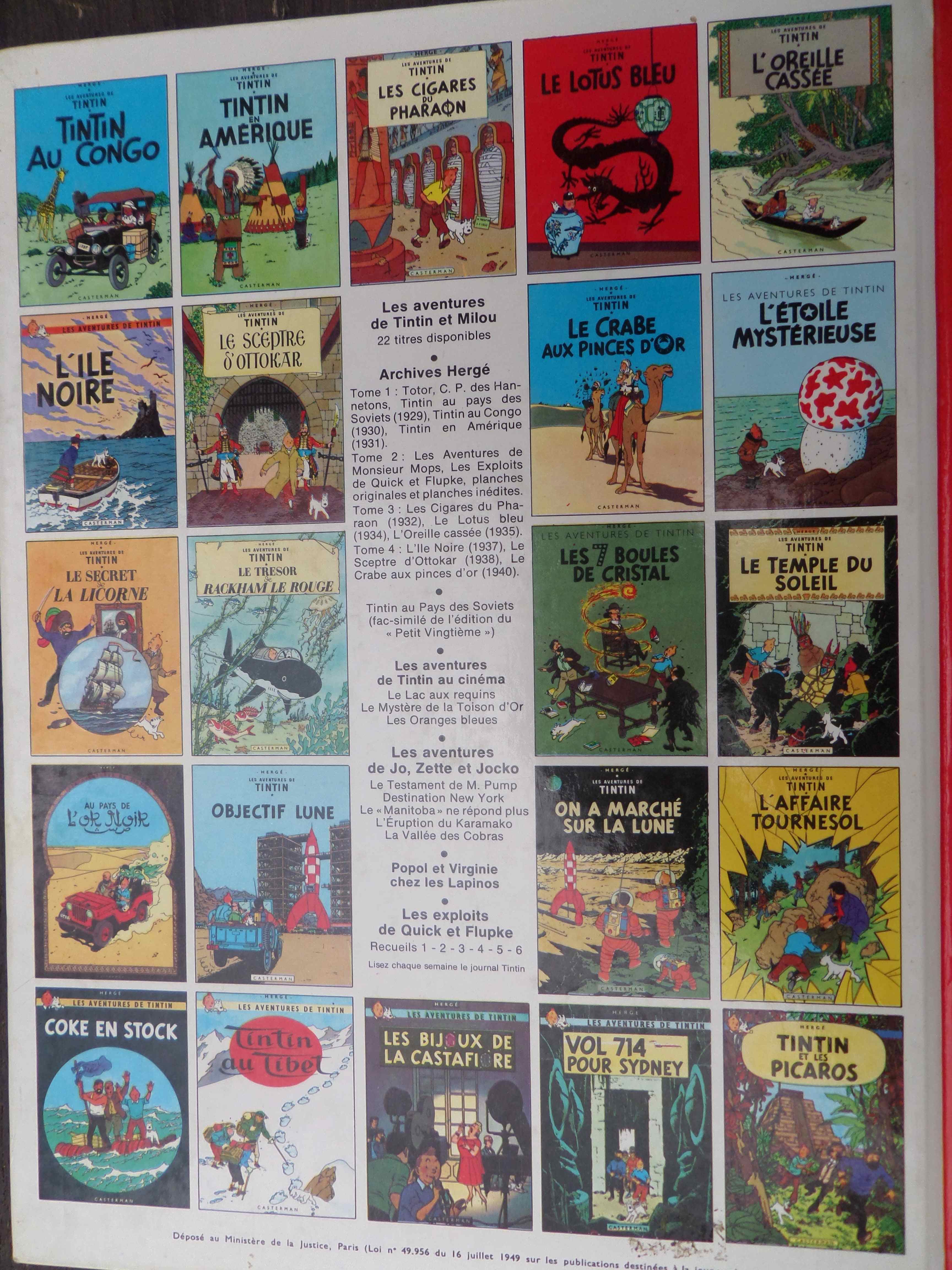 Voici quelques albums de ce titre classés suivant la 4ème de couverture tel que le présente le BDM, la Bible de la BD d’expression française. En effet les copyrights de Casterman étant fantaisistes, seule l’étude du 4ème plat indique l’ancienneté de l’album. En remontant le temps…