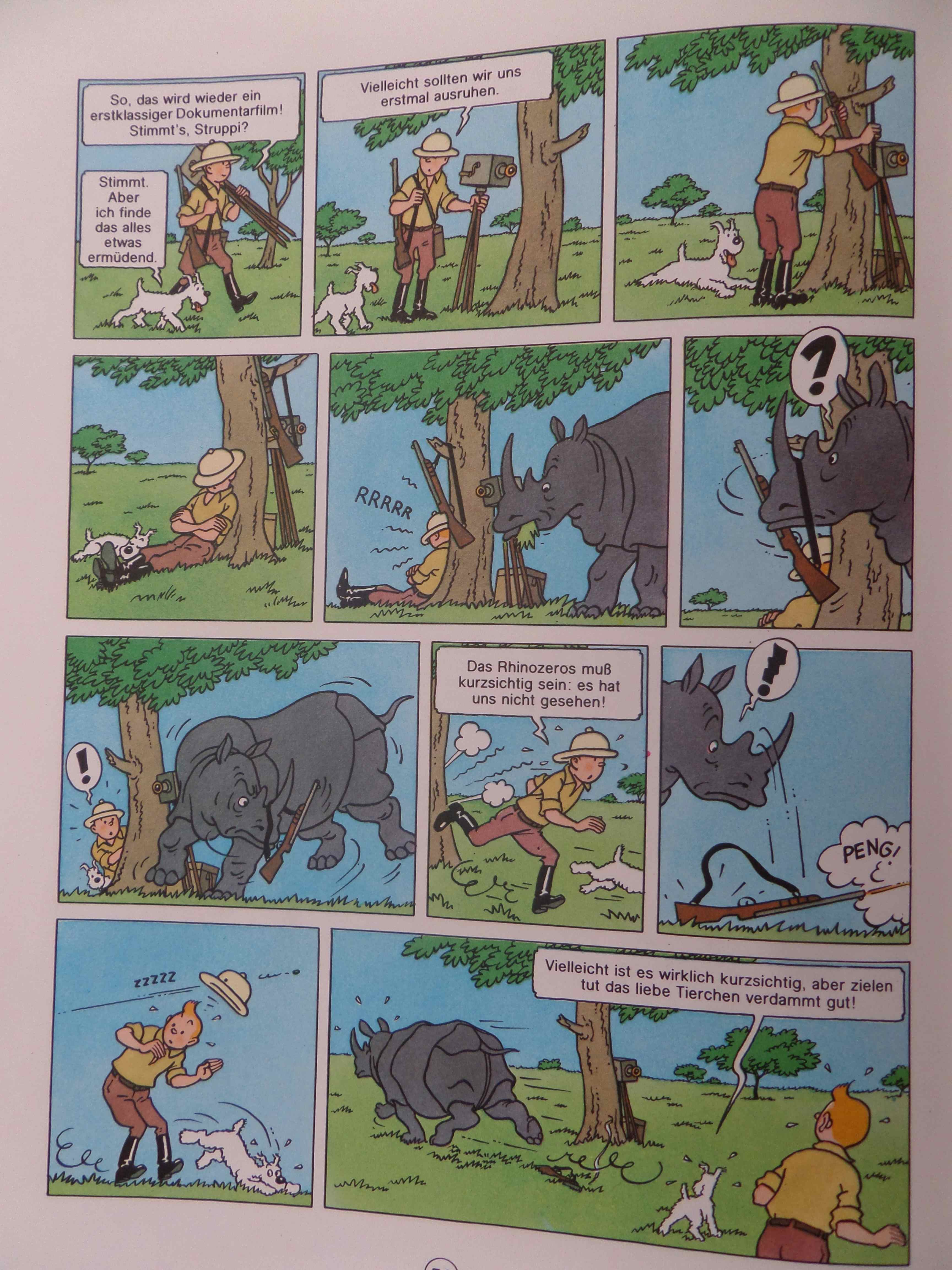 Plus de chasse au gros animaux dans cette version, le rhino s’approche un peu trop près de Tintin assoupi. Il accroche avec sa corne la carabine de Tintin et en se débattant pour s’en débarrasser, la fait tomber au sol. Le coup part qui manque d’atteindre Tintin et, affolé, l’animal fuit. C’est un peu plus malin.