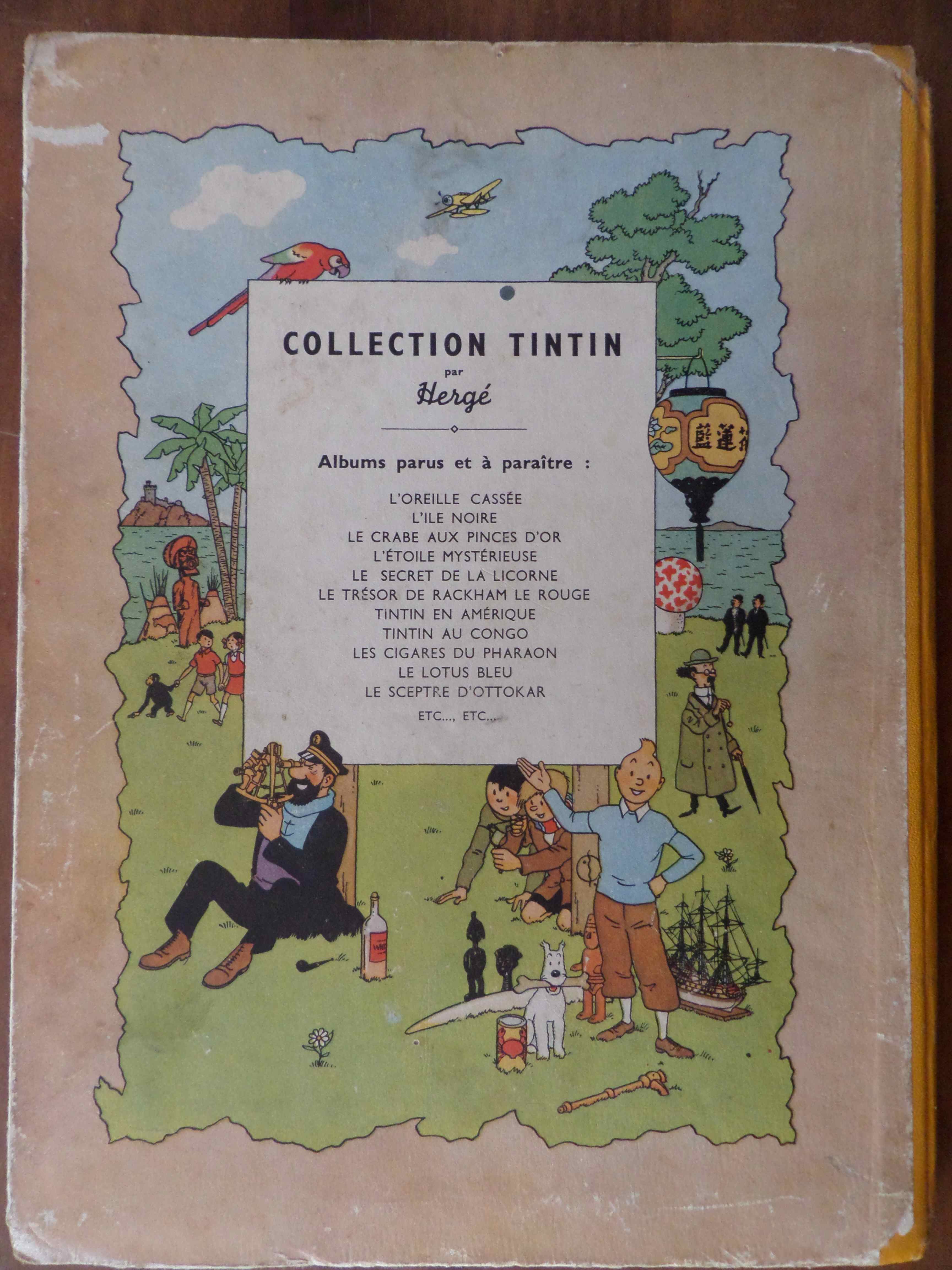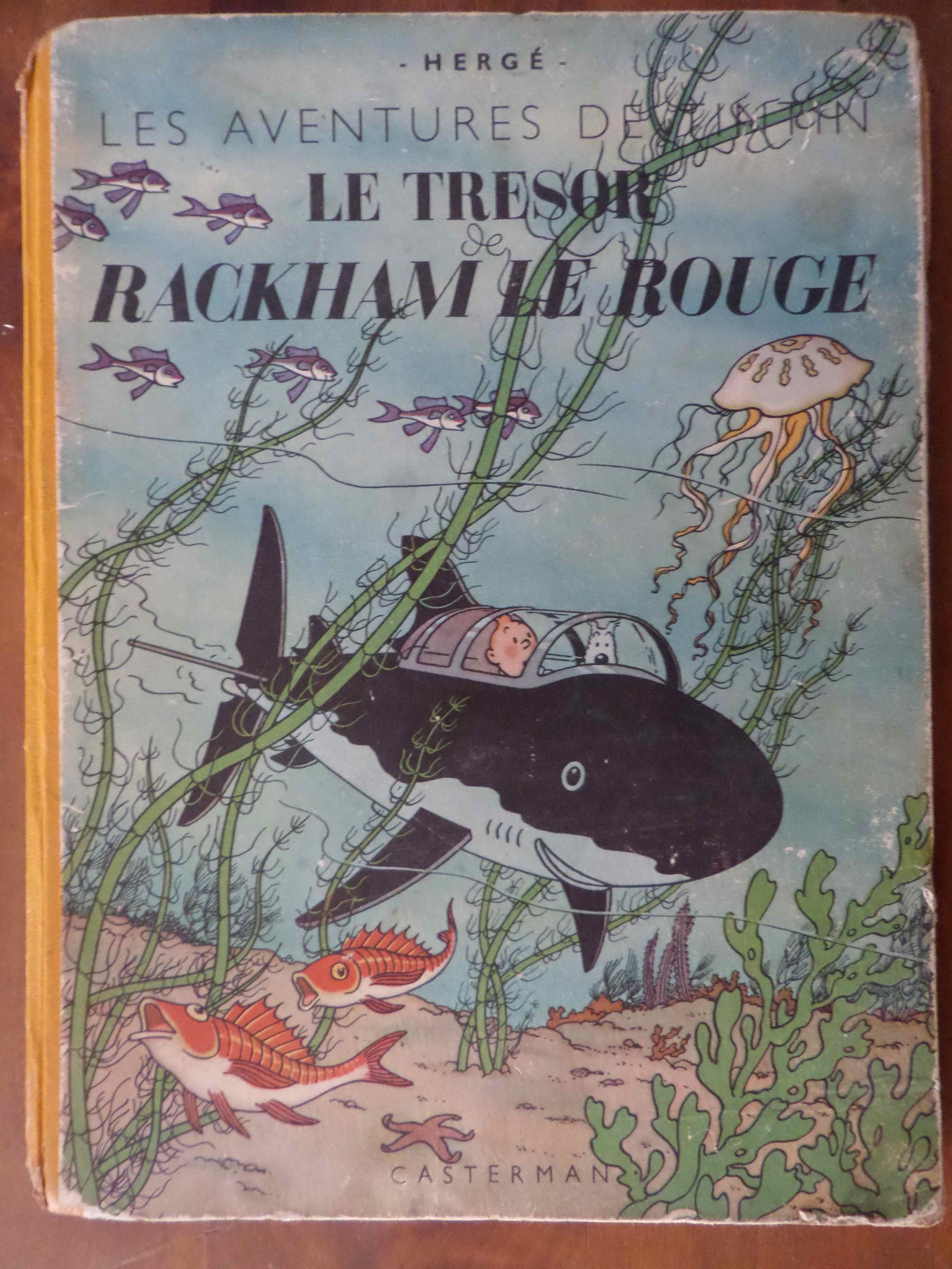 Trouvé aux enchères de Valence, mi-mars, ce Tintin « Le Trésor de Rackham le Rouge ». A la vue du 4ème plat, il s’agit d’une B1 suivant le BDM. A y regarder de plus près, ce doit être un exemplaire de 1947 soit pas tout à fait l’EO avec Dos Jaune.Exemplaire tirée à 18 000 ex. et côté 350 euros. Moins celui-ci, un tantinet fatigué.