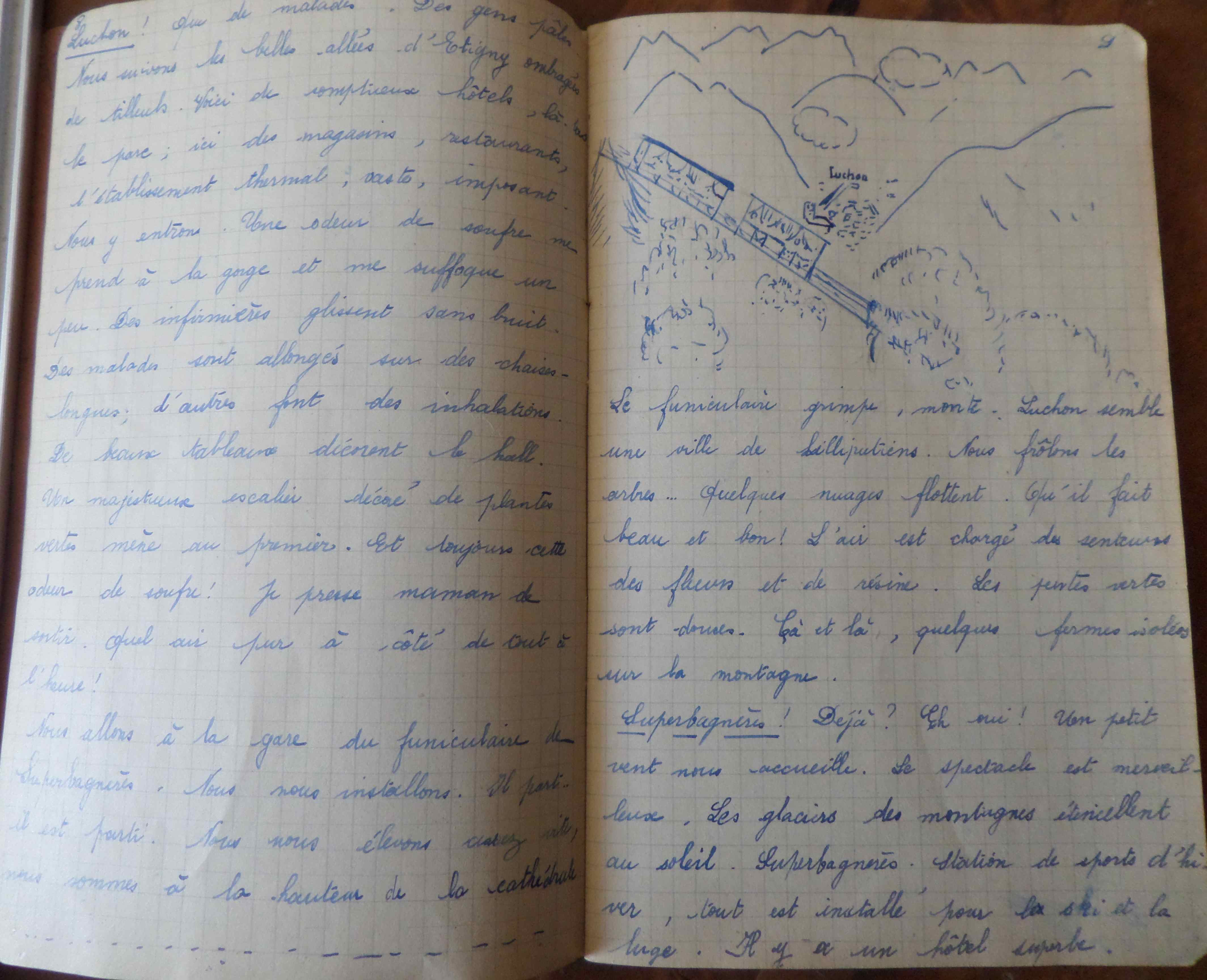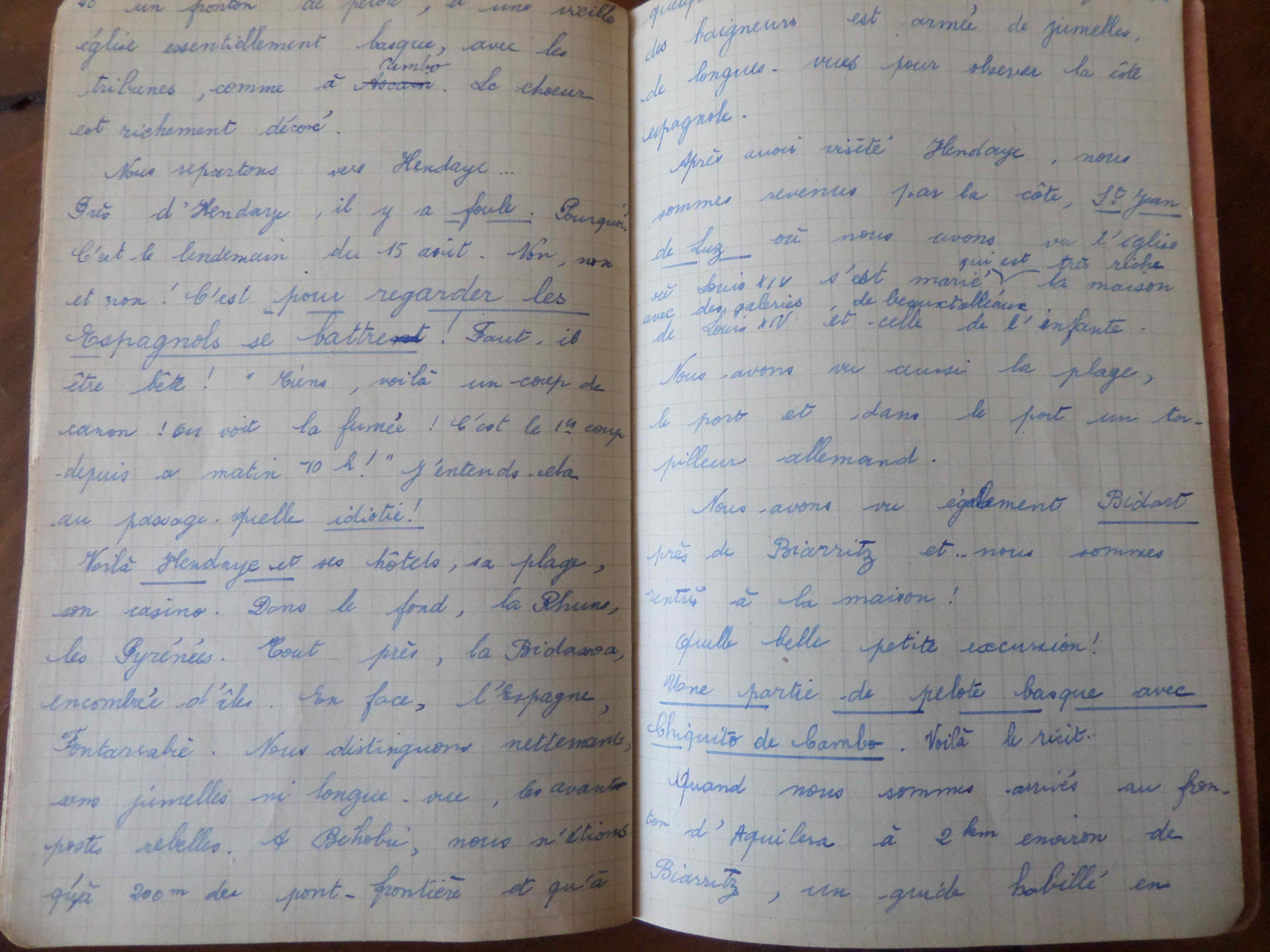 1936, les remiers congés payés. Pour un couple et leur fille, c’est un voyage dans les Pyrénées, en transport en commun de Cahors jusqu’à Biarritz. Ce sont certainement des gens aisés car ils s’attardent plusieurs jours à Biarritz, station huppée. C’est la fille Micheline Moritz la fille qui raconte dans un petit carnet leur voyage. L’écriture est élégante, le style est simple et correct, je pense que c’était une élève de lycée. Ce carnet a été trouvé dans un vide-grenier de la région.
