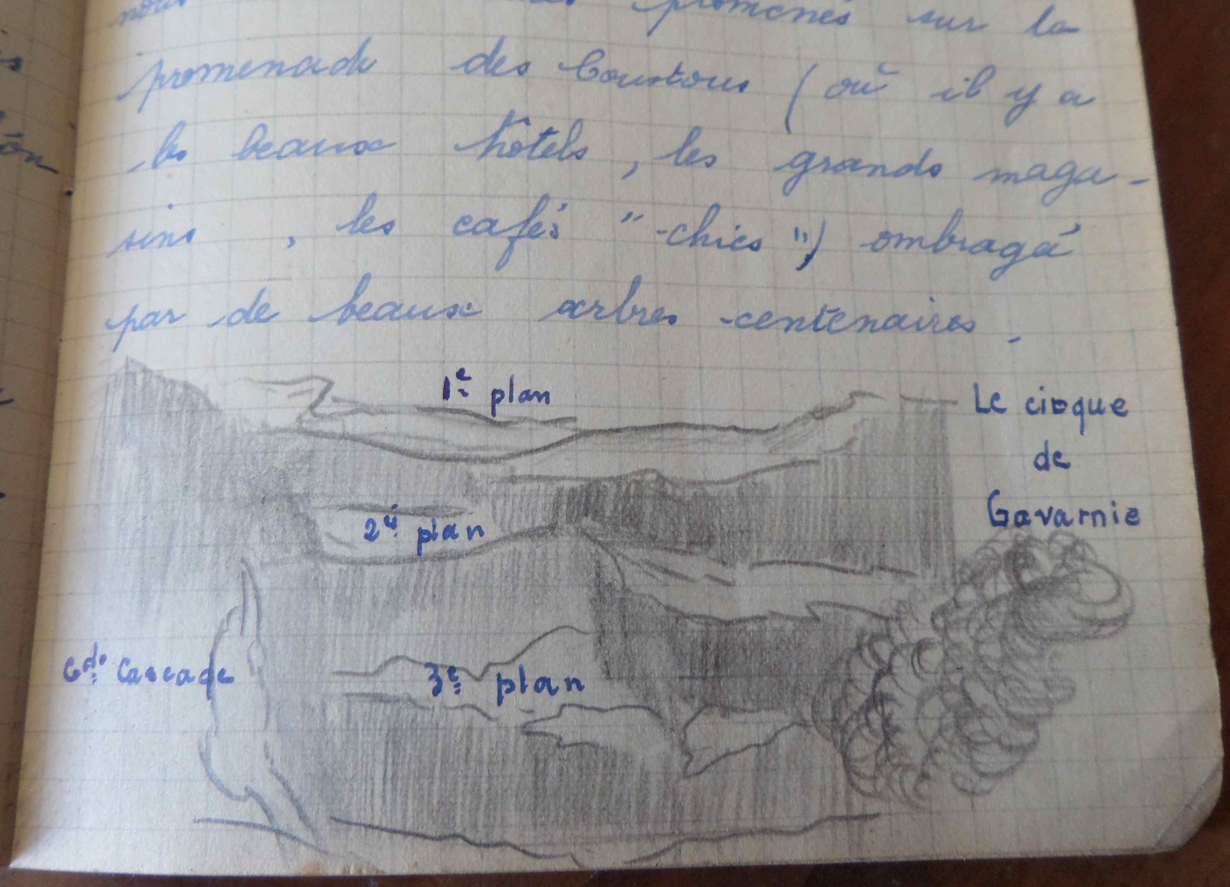 Excursions autour de Lourdes, bien sûr, la grotte sacrée, les malades et la procession mais aussi les grottes de Bétharram racontées en détail avec les noms que donnent les guides pour des concrétions ressemblants à des objets, un circuit au Tourmalet et jusqu’au pic du Midi de Bigorre où pendant le pique-nique de midi des vautours tournent dans le ciel, un voyage à Cauterets et Gavarnie jusqu’au cirque que la jeune fille croque aussi…