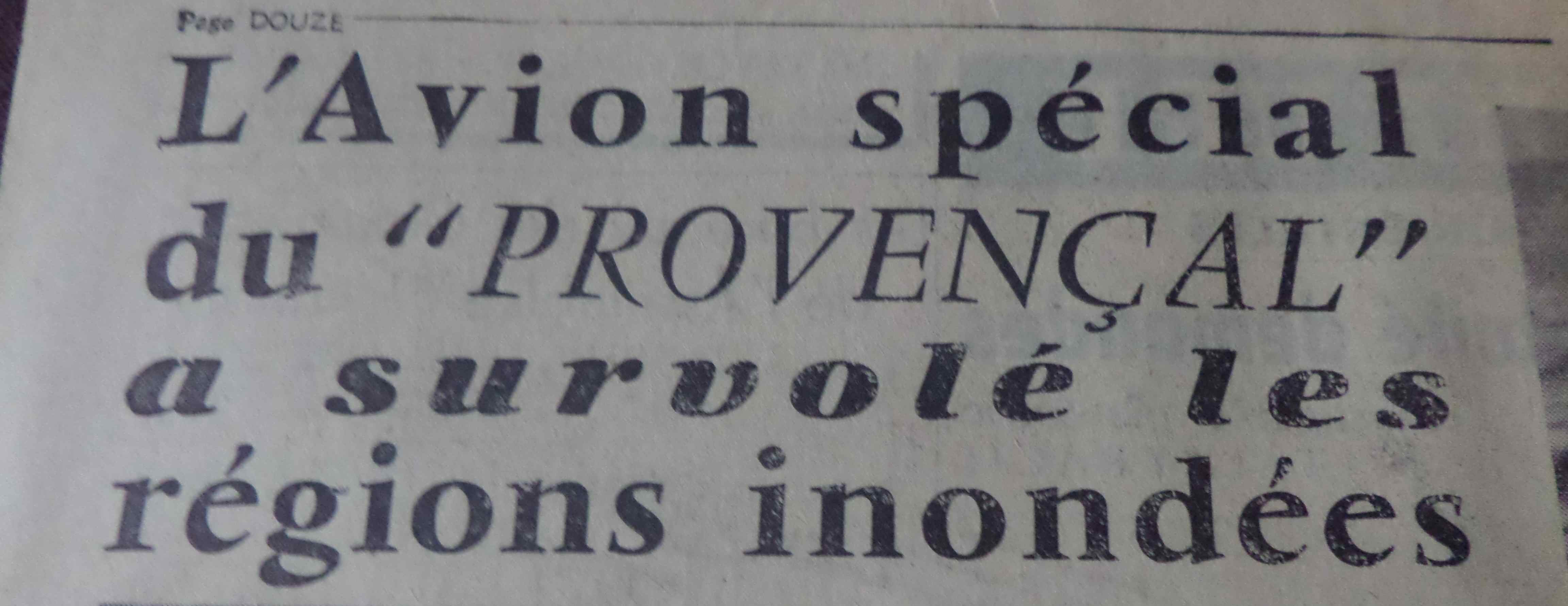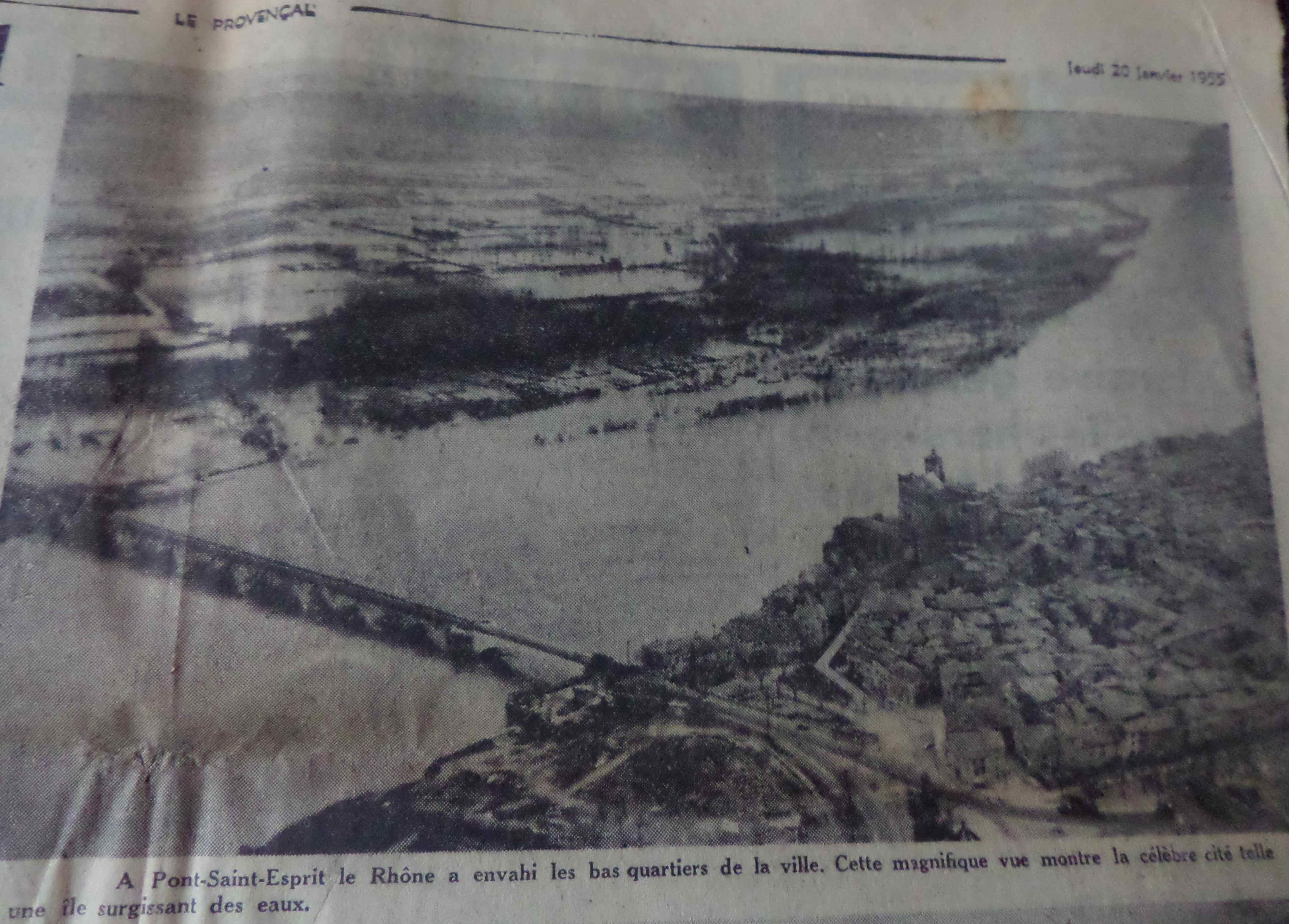 J’ai (re)-découvert dans une caisse la page du Provençal (quotidien régional) qui traite de cette crue et est datée du jeudi 20 janvier 1955. C’est donc une crue d’hiver, pas si rare que cela, assez importante pour mobiliser les médias.