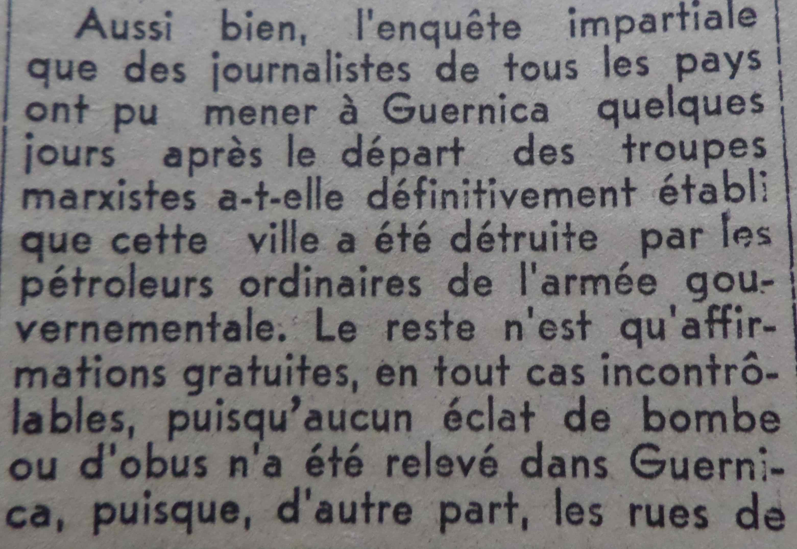 (NB: le bombardement de Guernika a eu lieu le 26 avril 1937 soit un mois jour pour jour avant l’article, texte d’autant plus impardonnable que les faits étaient avérés à cette date.)