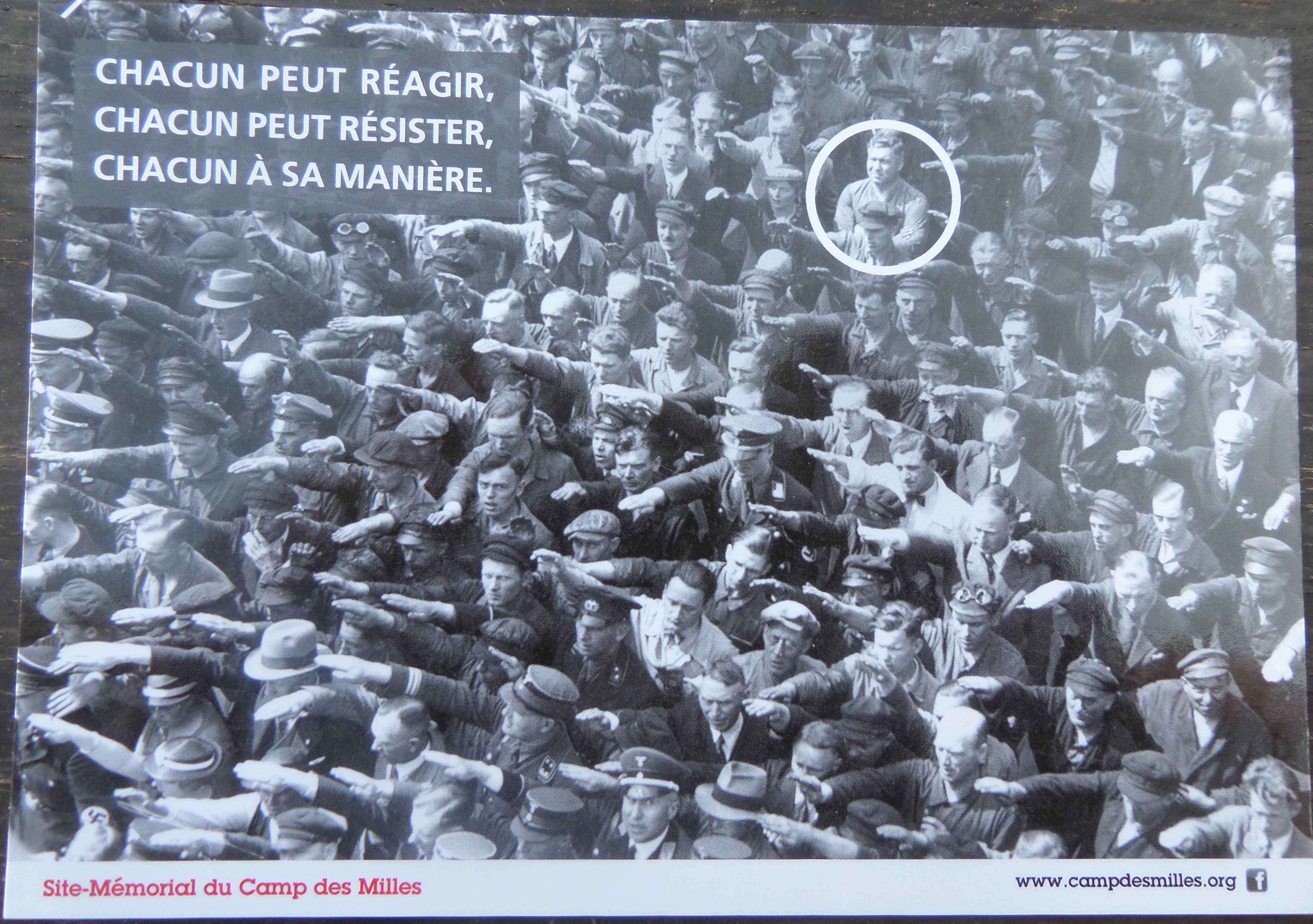 Cette photographie prise à Hambourg le 13 juin 1936 est le symbole du Camp de Concentration des Milles, proche d’Aix-en-Provence. Cette foule de travailleurs de l’arsenal Blohm & Voss assistent à l’inauguration d’un vaisseau de guerre de la Marine allemande, le Horst Wessel en présence du Fürher. Un seul homme refuse d’effectuer le salut nazi, il s’agit d’August Landmesser. Il sera détenu pour être marié une femme juive et sera tué en février 1944 dans les rangs de la Wehrmacht quand l’armée allemande qui avait besoin d’hommes était moins regardante (une autre version le fait mourir de mort naturelle en 1949).