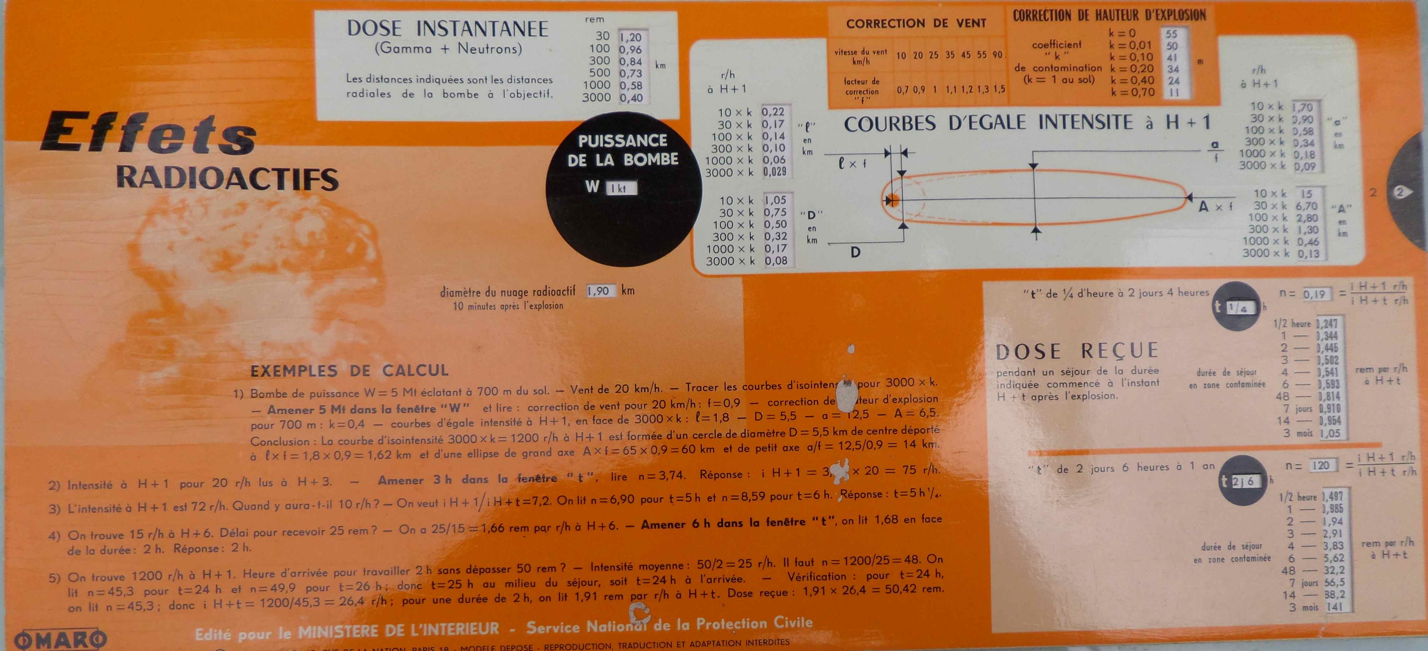 Celui-ci est vraiment original. Il est daté de 1961 et était édité par le Ministère de l’Intérieur qui s’occupe de la Protection Civile. Intitulé « Effets radioactifs », il détermine les conséquences d’une explosion nucléaire suivant sa puissance et sa hauteur.