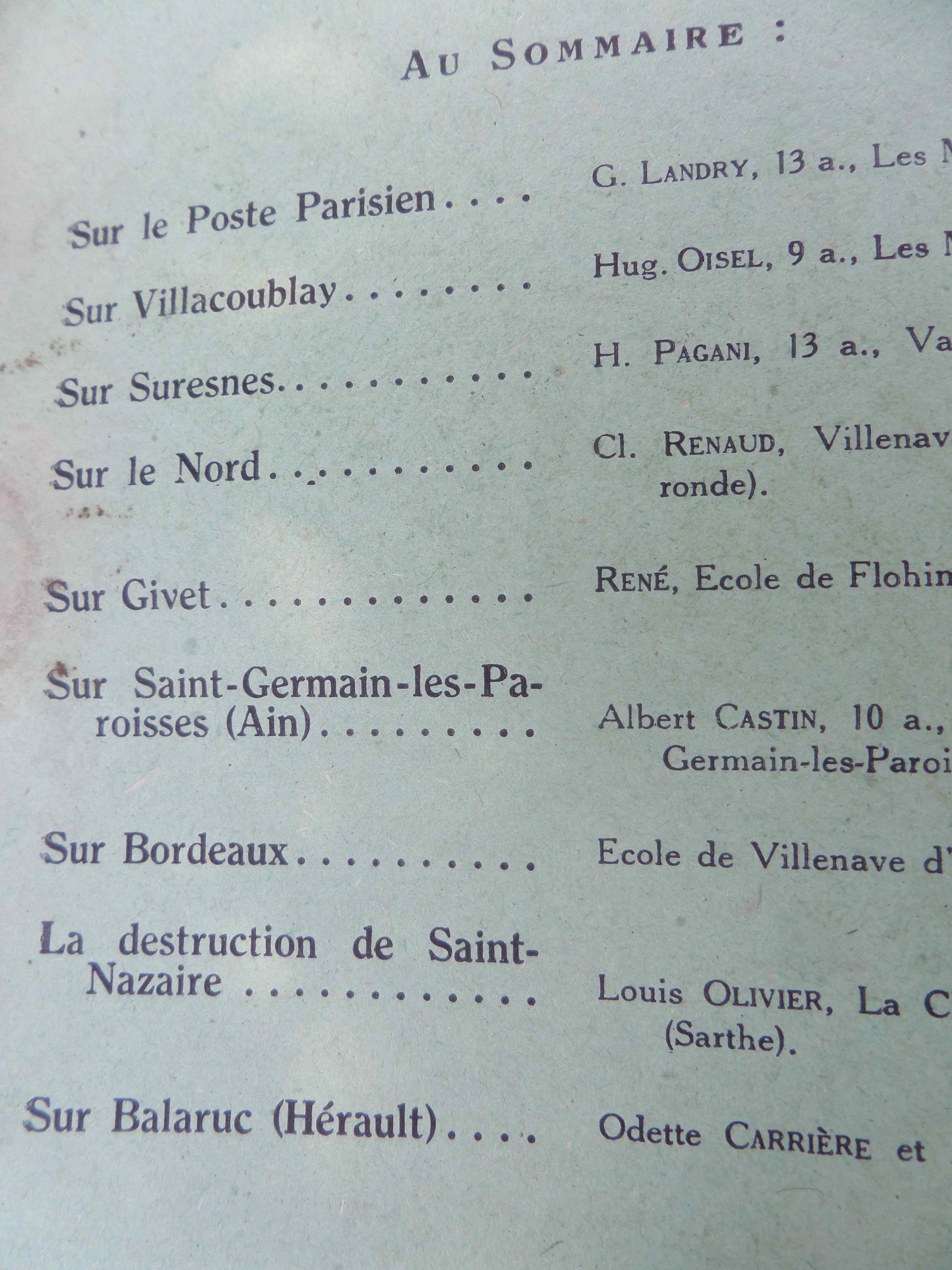 Textes écrits par des élèves des écoles des Molières (ex- Seine-et-Oise (aujourd’hui Essonne), Vareilles (Creuse), Villenave d’Ornon (Gironde), Flohimont (Ardennes), Saint-Germain-les-Paroisses (Ain), La Chapelle-Saint-Rémy (Sarthe), Balaruc (Hérault).