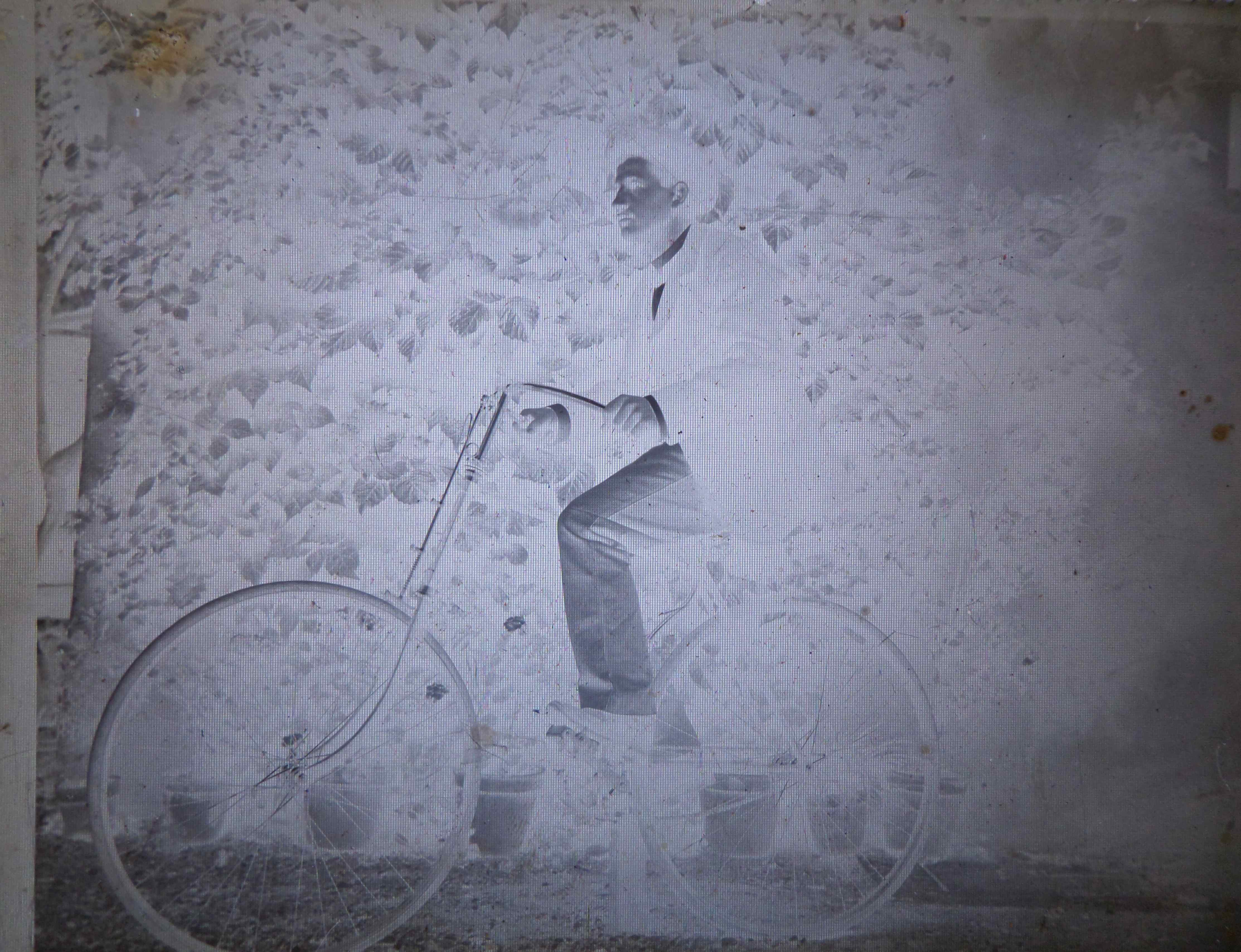 Un homme posant sur une bicyclette… qui date: le guidon plat, un freinage à tringles de métal, pas de garde-boue. Ce vélocipède est bien antérieur aux années 20, la série dans cette boîte (d’où vient aussi la promenade en barque) est bien plus ancienne (avant Grande Guerre).