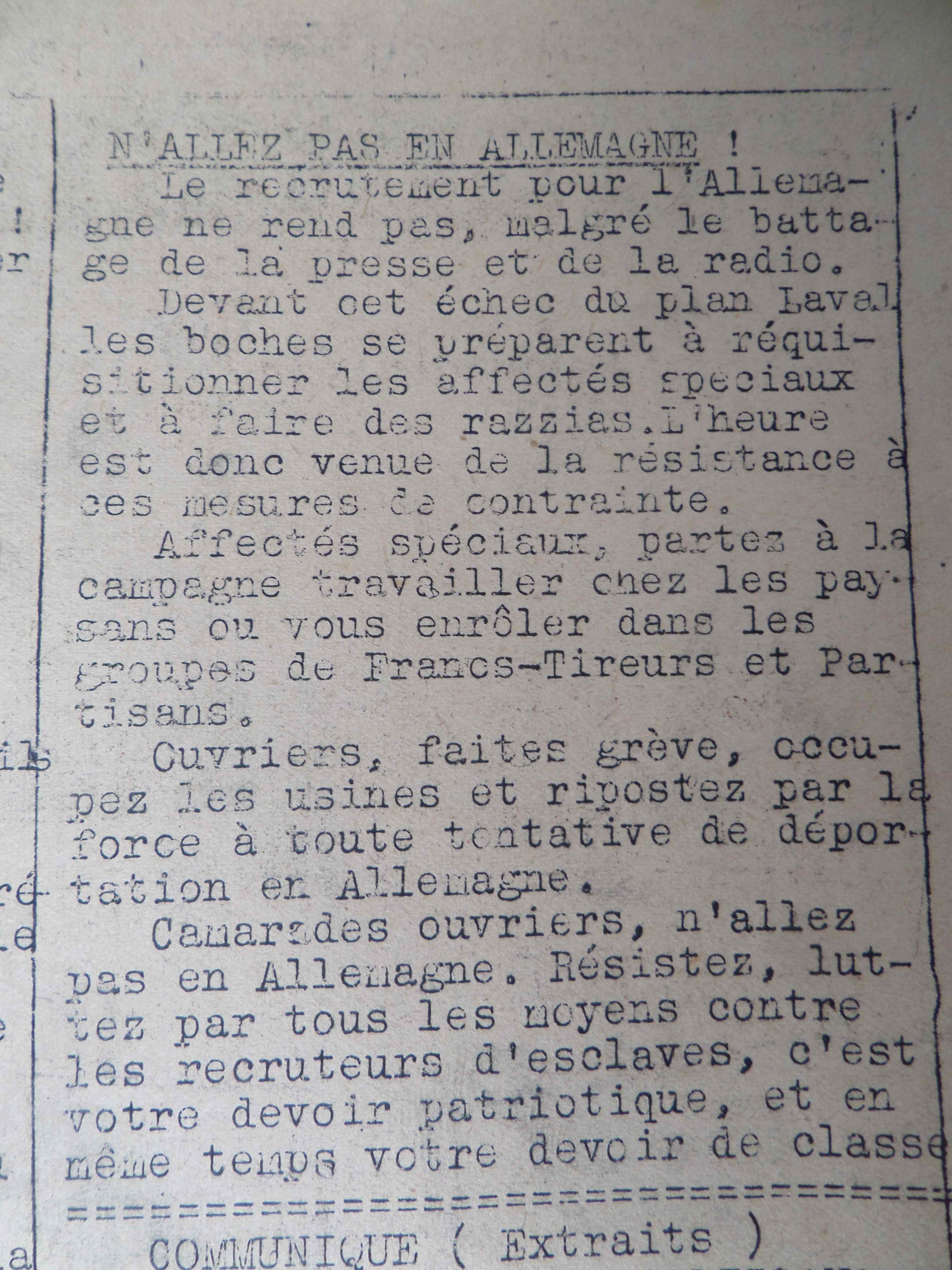 en première page ne dessous de la Une sur Jaurès et en seconde page, un appel aux jeunes français de refuser le STO (le travail obligatoire en Allemagne) et donc d’entrer en clandestinité et en résistance…. ce qui se produira, l’instauration du STO ayant eu pour conséquence de remplir les maquis de réfractaires.