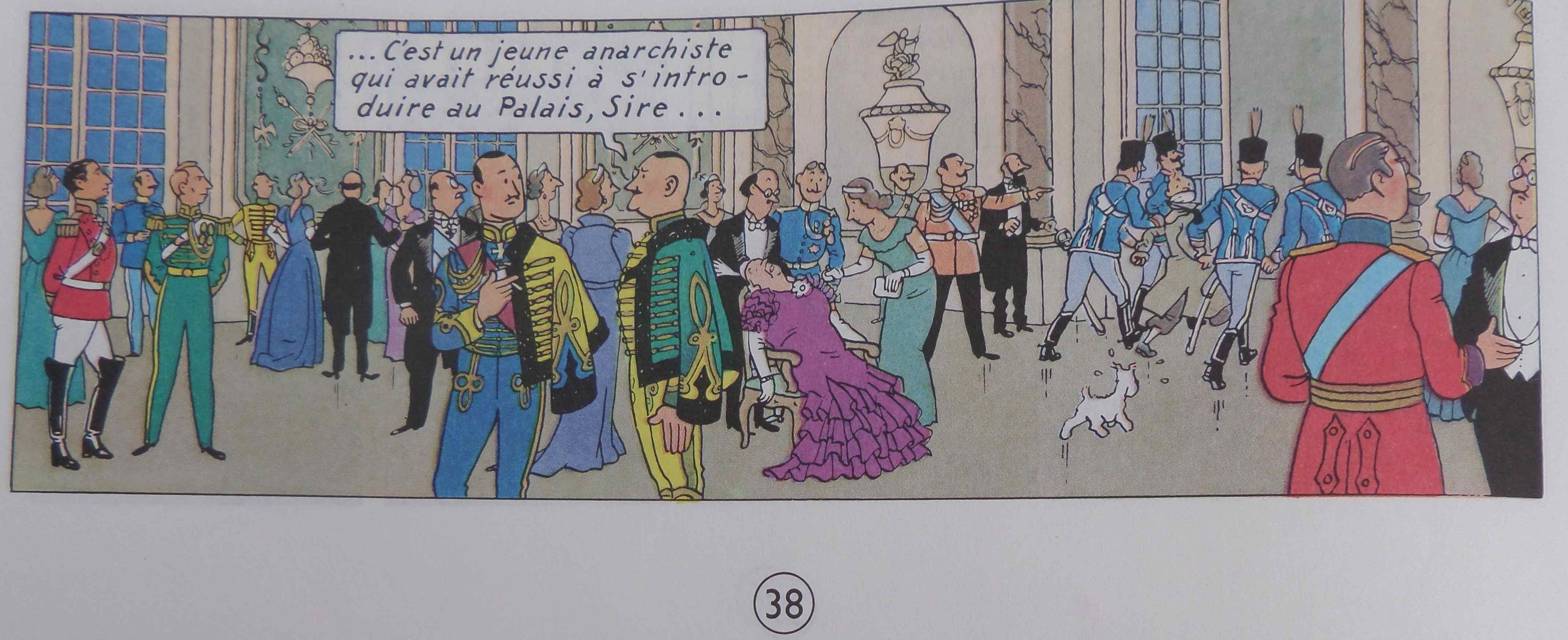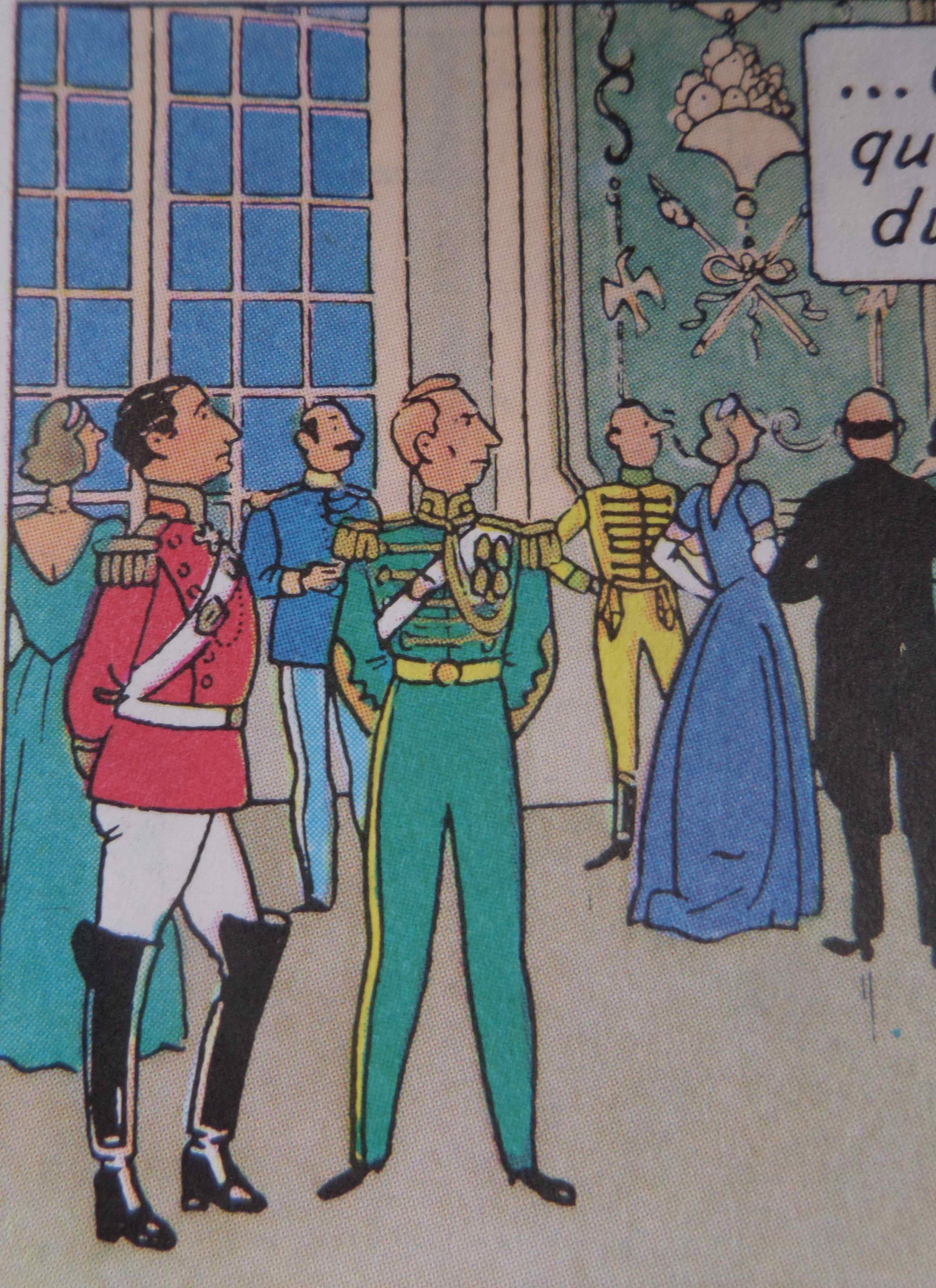 A la fin de cette même histoire, page 59, à la cour du même Muskar XII, Tintin est accueilli en héros après avoir sauver la Syldavie de l’Auschluss de son voisin. Une grande réception réunit toute la cour pour la Saint-Wladimir .