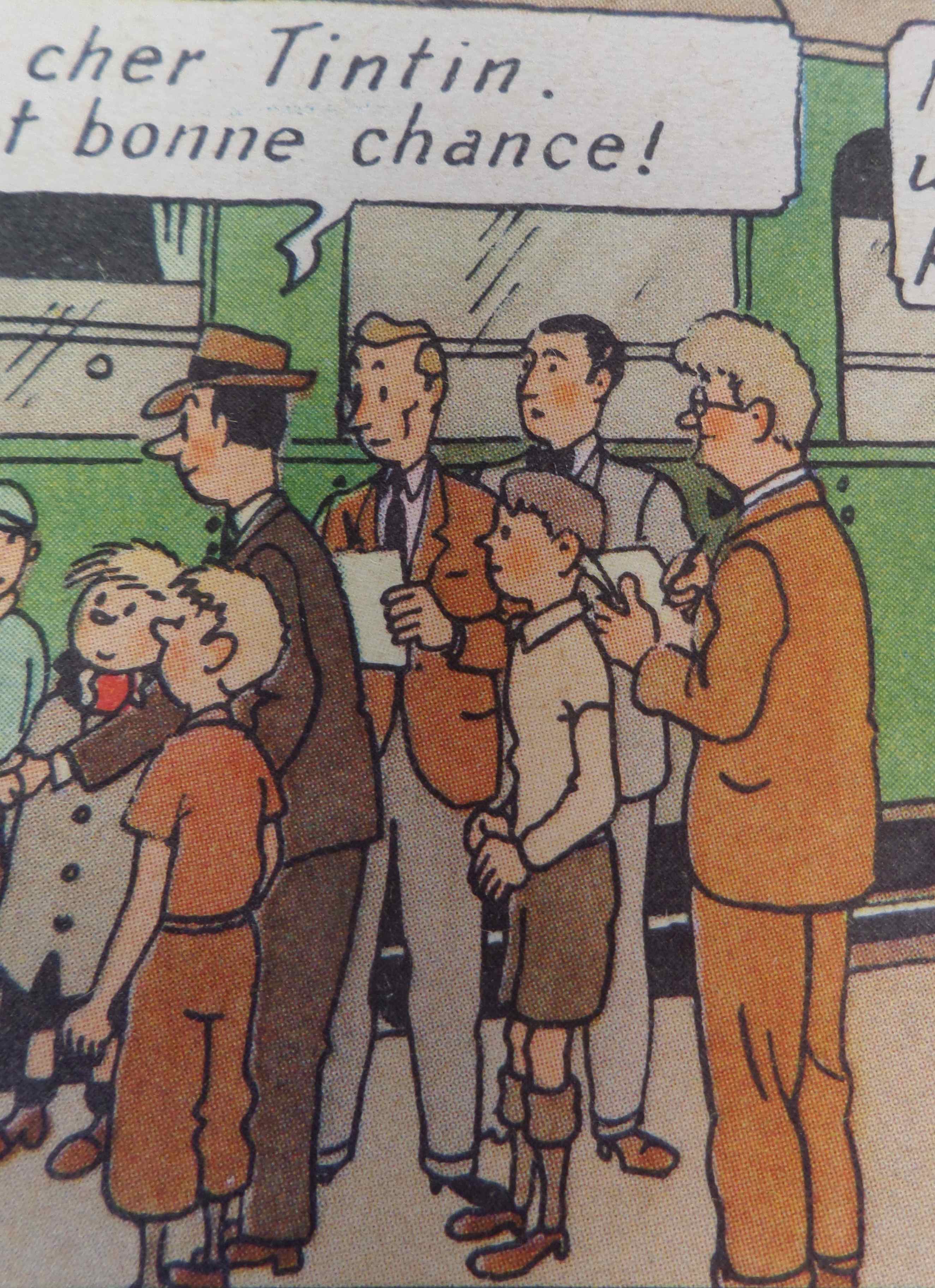 Un scout est là (Hergé était proche du mouvement scout catholique, il dessinait dans Le Petit Vingtième proche de la droite catholique), Quick et Flupke (d’autres héros de Hergé) l’entourent. On voit aussi au fond les Dupondt qui n’apparaîtront dans les histoires de Tintin en tant que personnages importants que plus tard, mais n’oublions pas que Hergé a repris ses premiers albums pour modifier les séquences, les moderniser ou ajouter des détails.