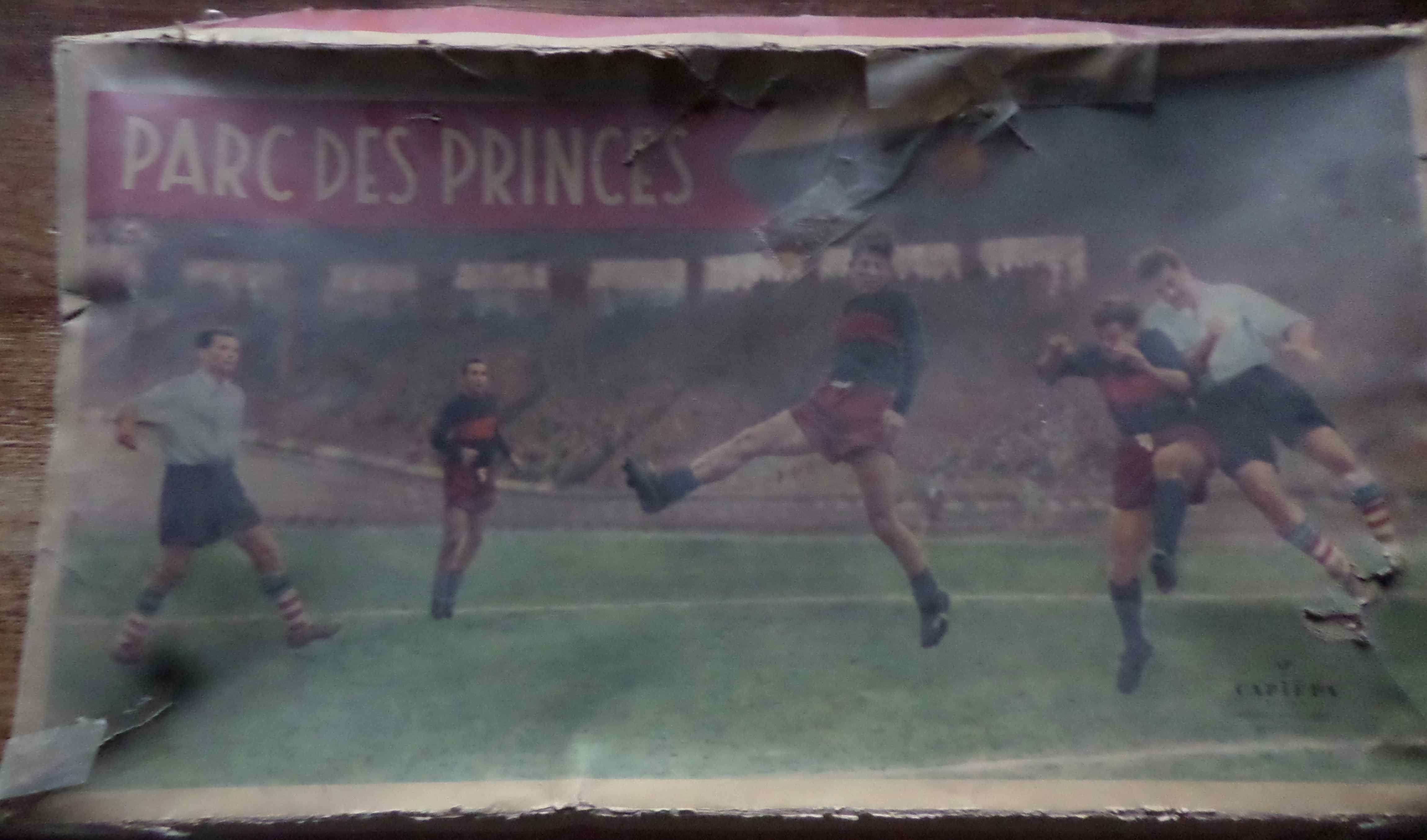 En dessous du couvercle ayant souffert quelque peu, un jeu édité par Capiépa. Il porte un copyright de 1954, à l’époque où le Parc des Princes était occupé par le Racing Club de Paris ou le Stade Français, juste avant que le grand Stade deReims y vienne jouer ses matchs importants (dont la première finale de ce qu’on appelle aujourd’hui la Ligue des Champions). D’ailleurs l’image du couvercle est peut-être celle du derby Stade Français-Racing en barrage de descente-montée L1-L2 en 1953.
