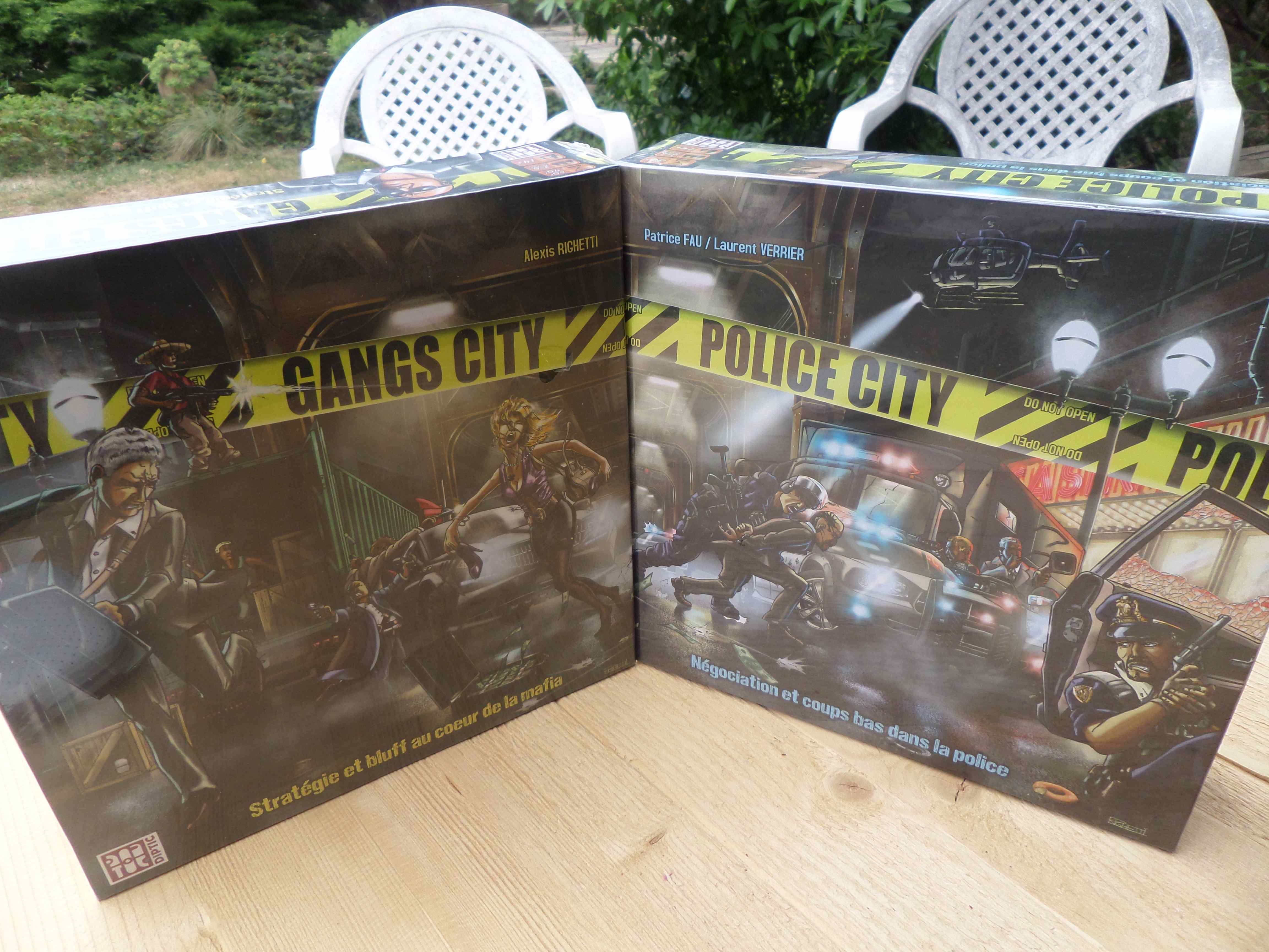 après un bon mois de parties-test de sa nouvelle création Explorers (qui devrait être éditée dans un an). Comme j’en avais parlé dans un article du 23 juin dernier, Gangs City (d’Alexis) et Police City (de Patrice Fau et Laurent Verrier) sont 2 jeux à part entière qui une fois bien maîtrisés peuvent être réunis pour en faire un 3ème. Quand à Explorers, c’est une histoire de quête de ressources sur une planète inconnue… jeu qui fonctionne très bien et que nous achèterons avec plaisir.