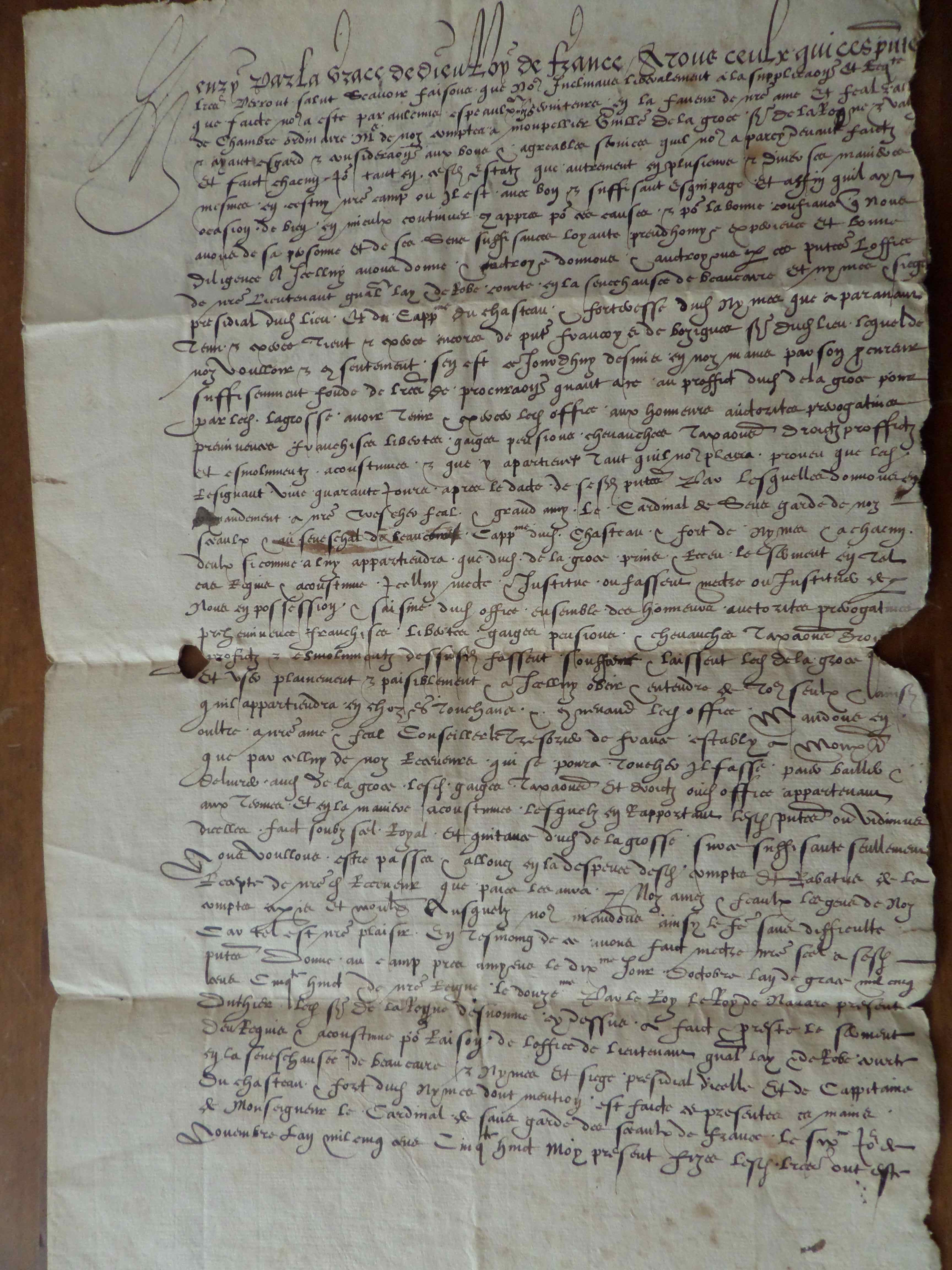 « Henri par la Grace de Dieu, Roy de France… » tels sont les premiers mots de cet acte officiel. Le roi en question est Henri II, le fils de François 1er qui régnera de la mort de celui-ci (1547) à sa propre mort (1559).