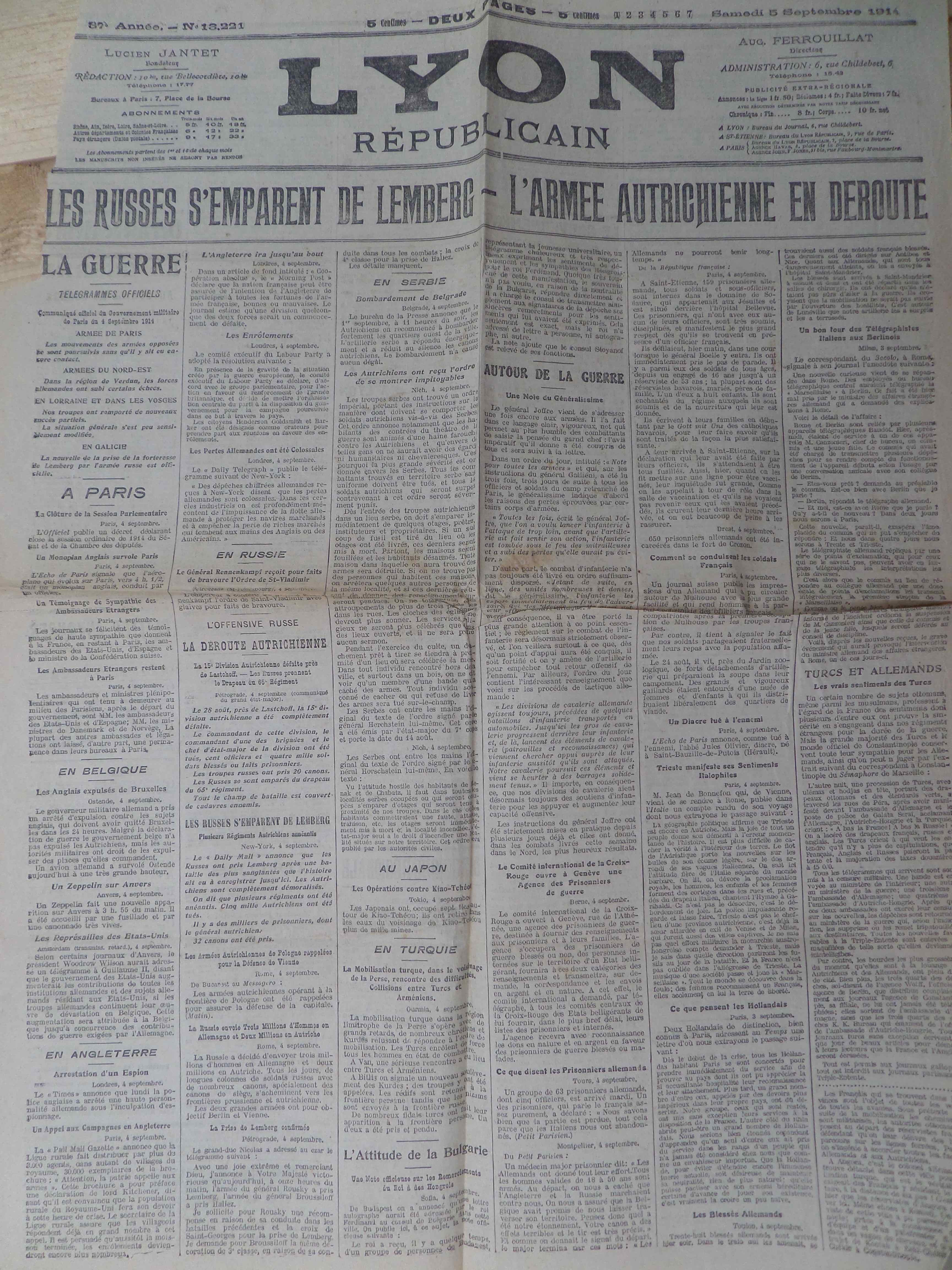 Originalité pour ce samedi 5 septembre, mes anciens avaient acheté et gardé Lyon Républicain en lieu et place du Petit Marseillais. Ce journal pourtant complet est encore plus réduit que l’autre titre puisqu’il ne comporte que 2 pages (une feuille recto-verso).
