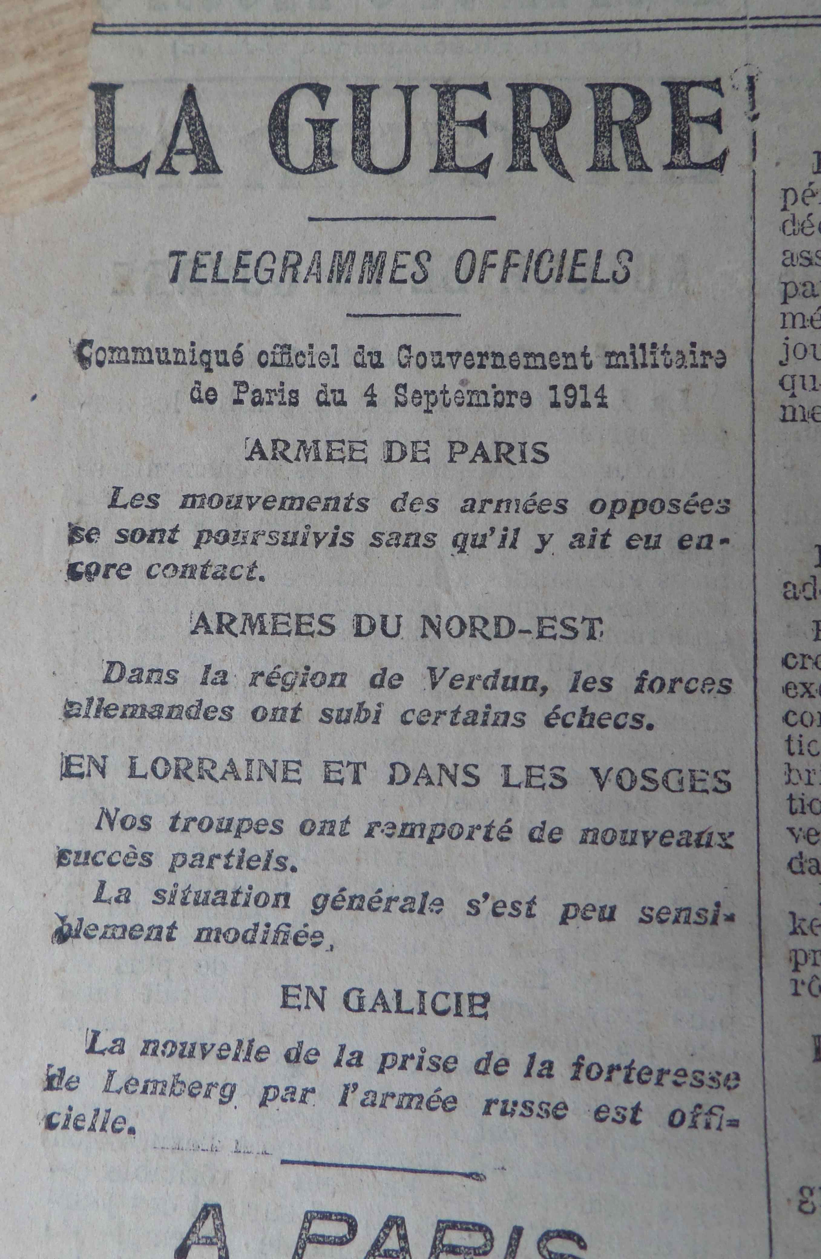 Ce 5 septembre correspond dans les livres d’histoire au premier jour de la contre-attaque française de la Marne ou première bataille de la Marne comme on le dit maintenant ou l’épisode des taxis de la Marne comme on disait jadis (épisode sympathique au demeurant mais peu déterminant au point de vue militaire). Bien entendu, le journal n’en fait pas encore état.
