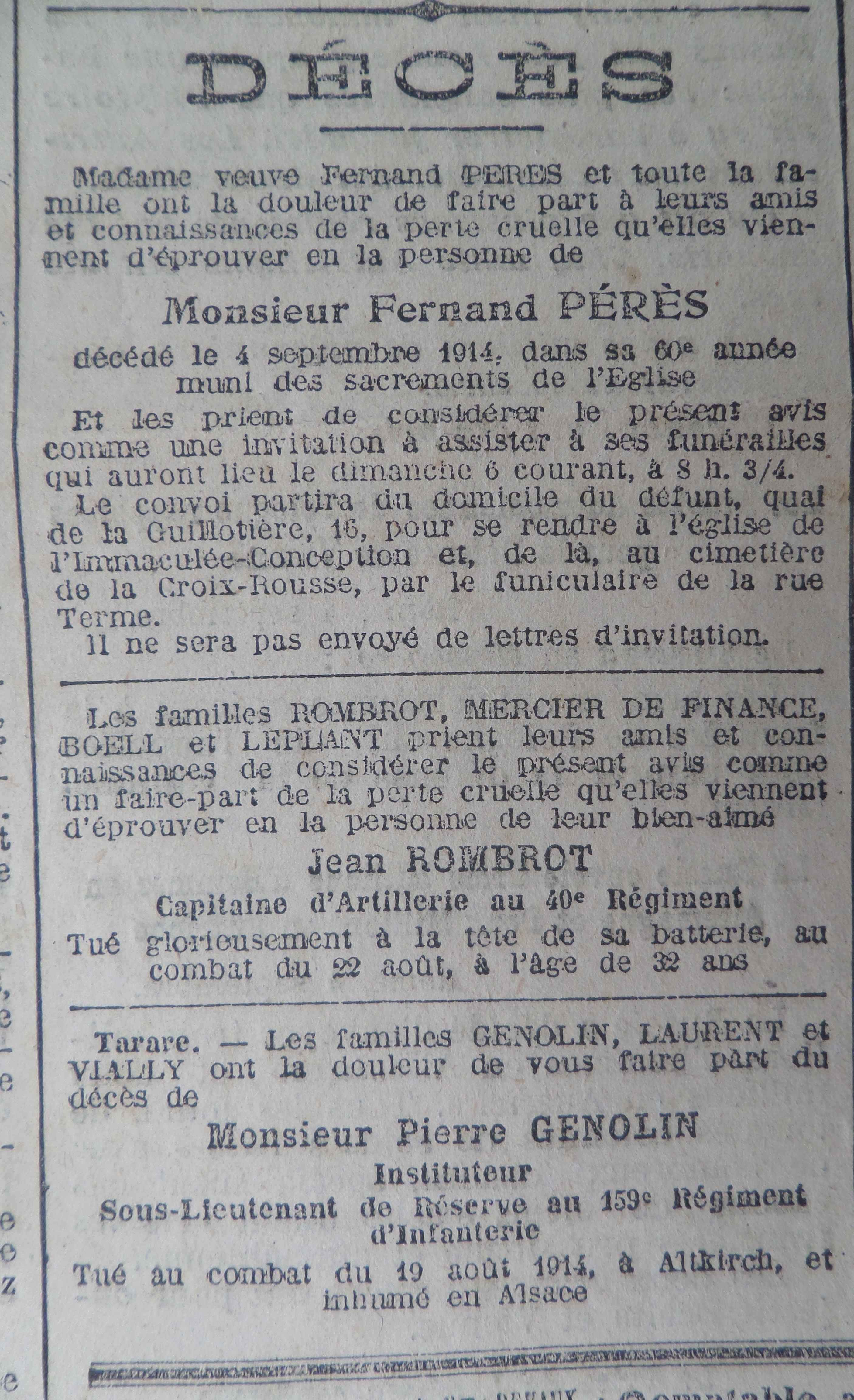 Les funérailles prévues à Lyon ce samedi sont moins parlantes, puisque seuls 2 convois sur 14 concernent des soldats morts au combat. Par contre, le nombre d’enfants qui vont être mis en terre ce jour-là est considérable: 5 enterrements d’enfants de 5 semaines, 7 mois, 10 mois, 6 ans et 11 ans! Impensable de nos jours et la preuve des progrès de la médecine infantile, de la prévention et de l’hygiène.