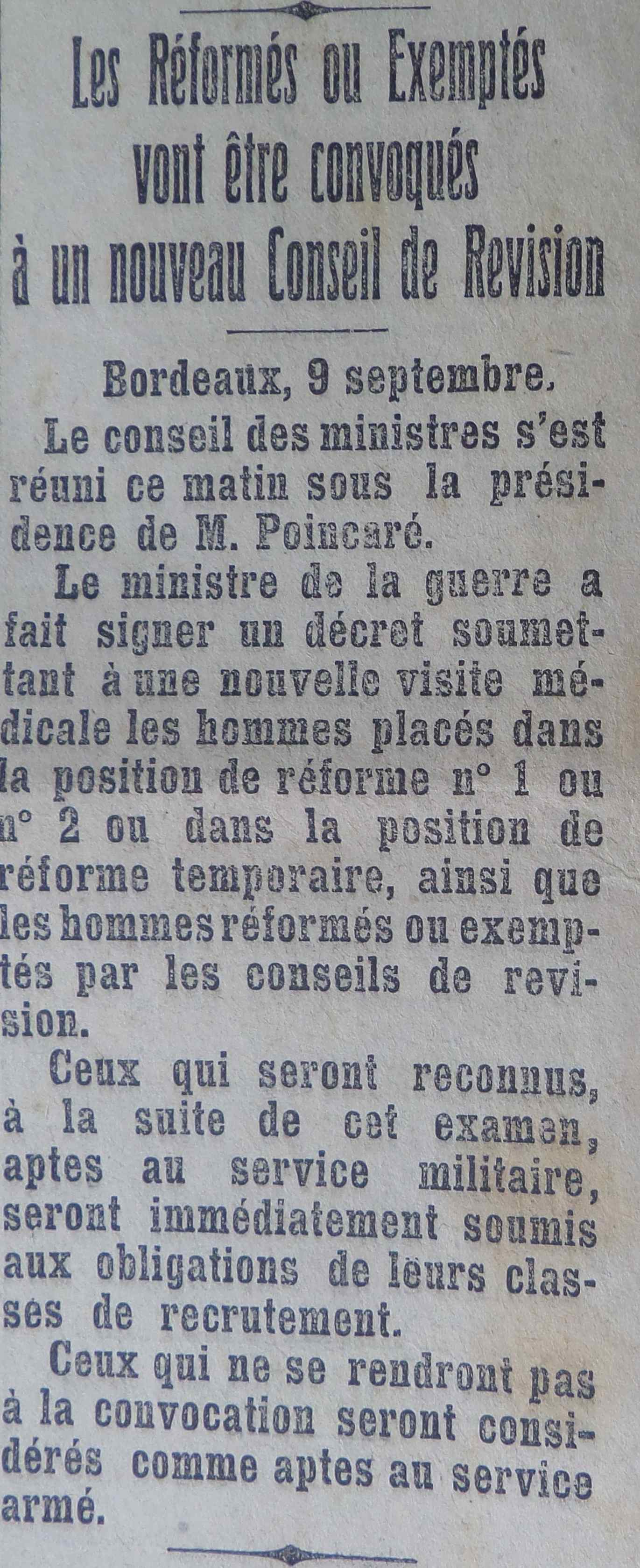 On va revoir les conditions de réforme et d’exemption des jeunes hommes qui ont été jugés inaptes au Service Militaire lors de leur passage en Conseil de Révision. Un nouveau Conseil va les revoir et statuer à nouveau sur leurs cas… et certains vont se retrouver au front, pour sûr. C’est que l’Armée a besoin de toujours plus d’hommes après les pertes d’août 1914.