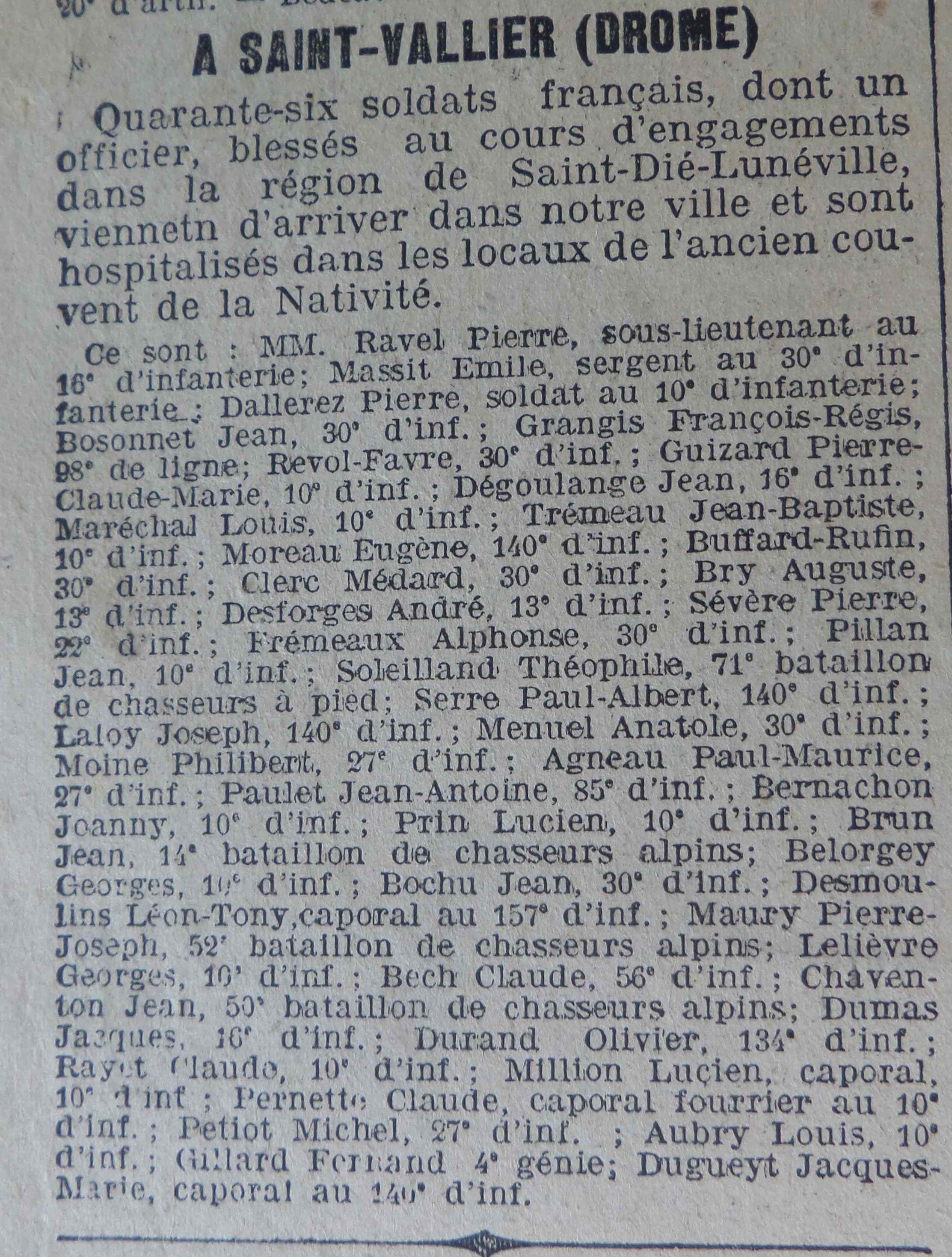 Beaucoup moins, cette nouvelle liste de blessés admis dans les hôpitaux marseillais et… à Saint-Vallier dans la Drôme où là les malheureux sont soignés dans un ancien couvent.
