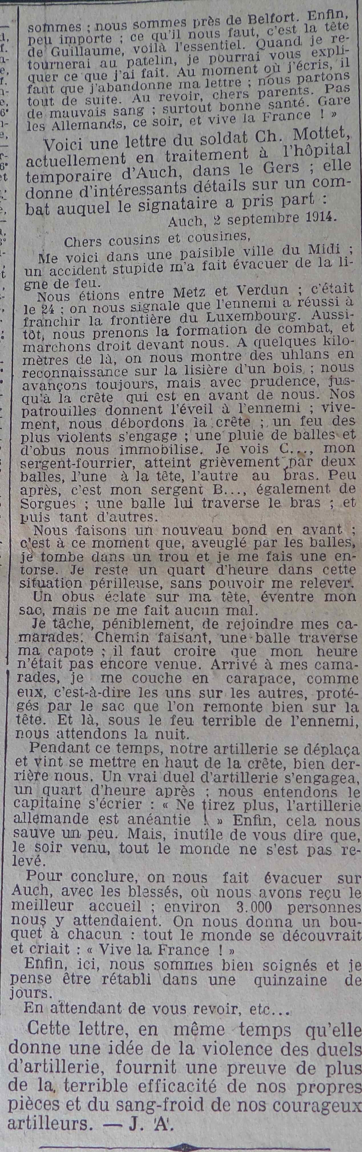 celle d’un jeune de Puy-Saint-Martin et d’un autre de Cléon d’Andran. Des lettres patriotiques tandis que la troisième, plus longue, d’uncertain Ch. Mottet (pas un ancien cycliste) soigné à Auch pour une blessure ne cache en rien la dureté des affrontements.