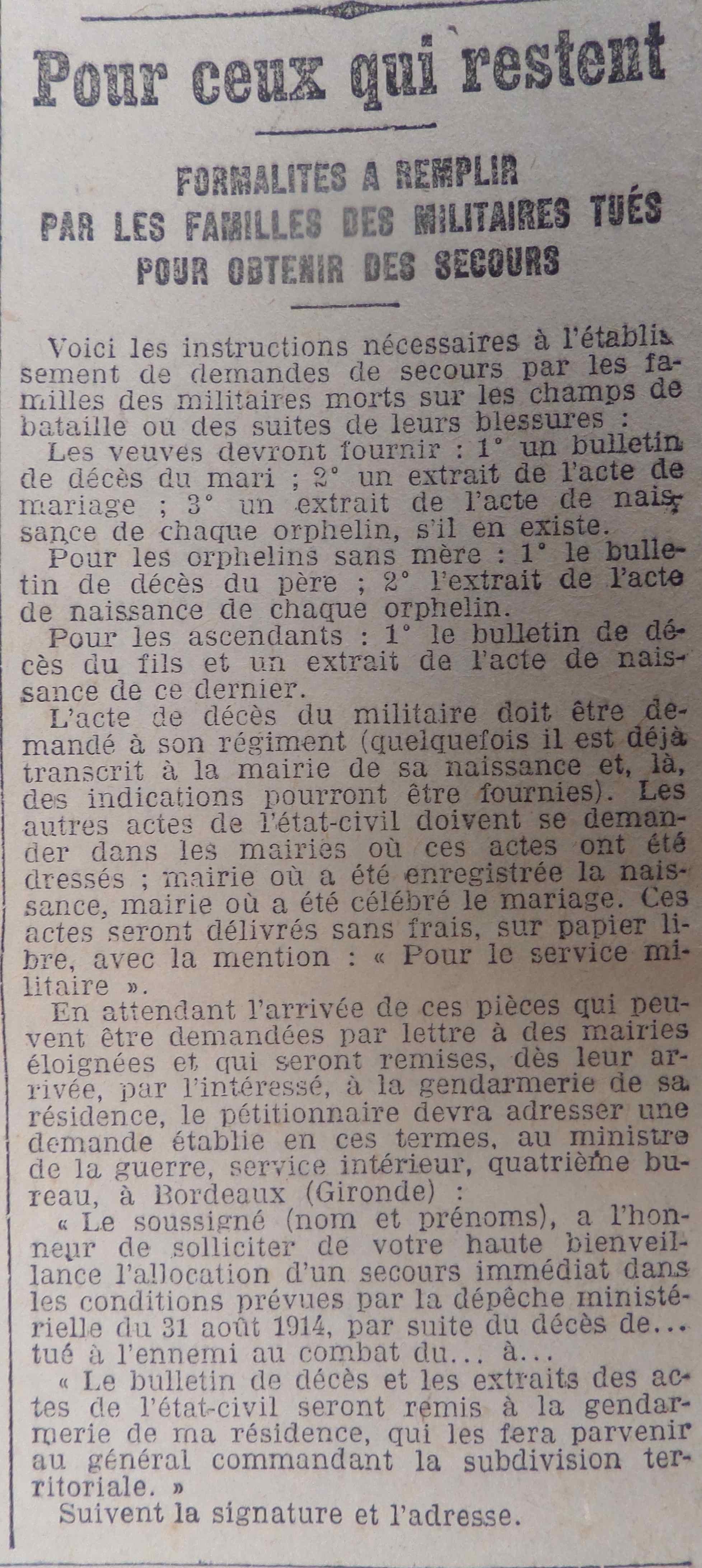 Quant aux morts le journal n’en fait jamais cas, sauf si ce sont des Allemands (ou dans des articles locaux pour rendre hommage à un concitoyen mort pour la France), un article officiel indiquant les démarches que doivent entreprendre les familles pour obtenir en aide.