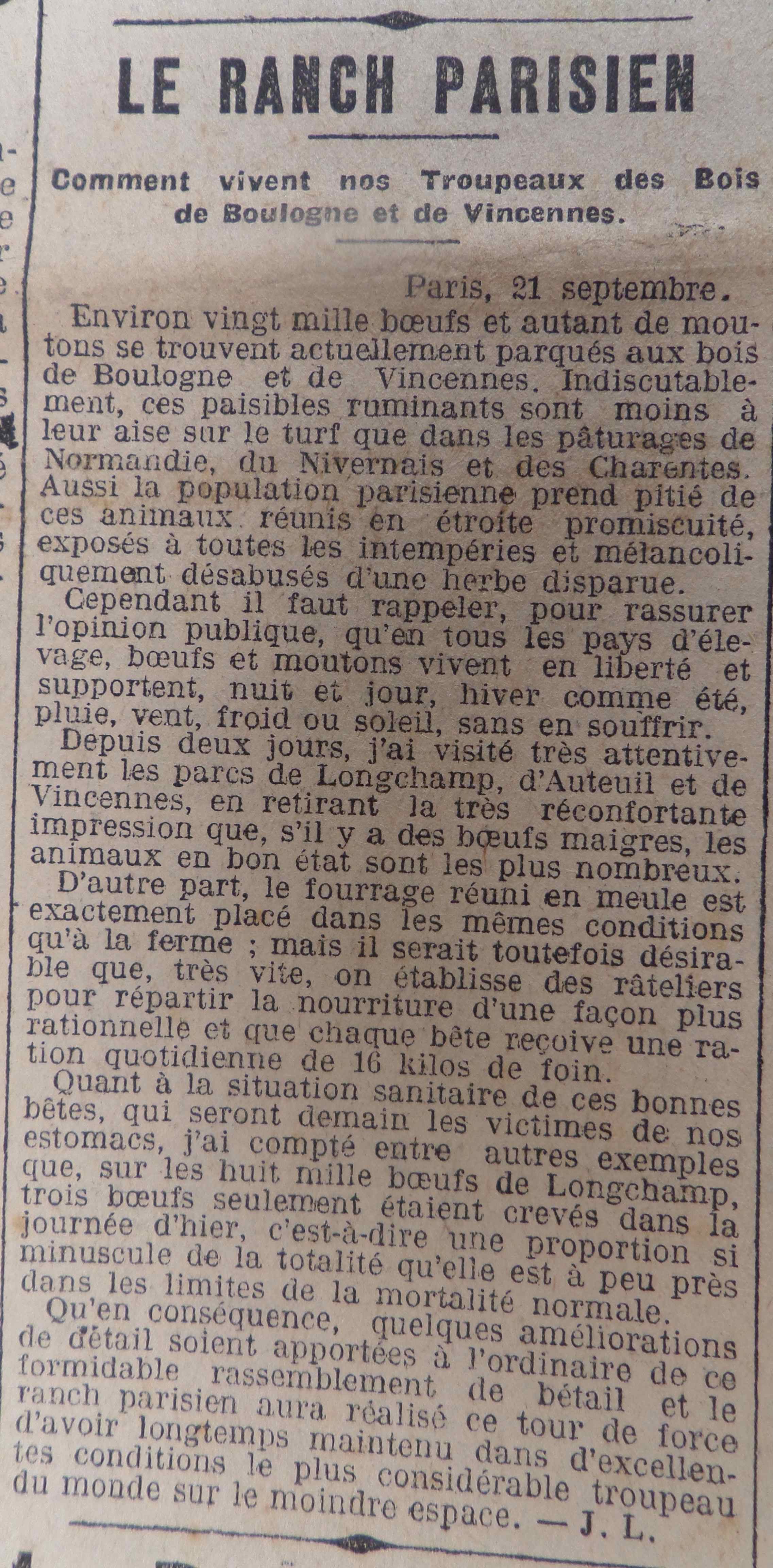 20 000 boeufs et 20 000 moutons ont été amenés dans le hippodromes parisiens de Longchamp, Auteuil et Vincennes pour permettre à la population de soutenir un nouveau siège, celui de 1870 ayant laissé un terrible souvenir à ceux qui l’ont vécu (ou ceux qui ont entendu des récits), les assiégés étant réduits à manger les animaux des zoos et les rats de égoûts (le squelette d’un rhinocéros du zoo de Vincennes qui a fini dans les assiettes des parisiens est visible au Museum d’Histoire Naturelle).