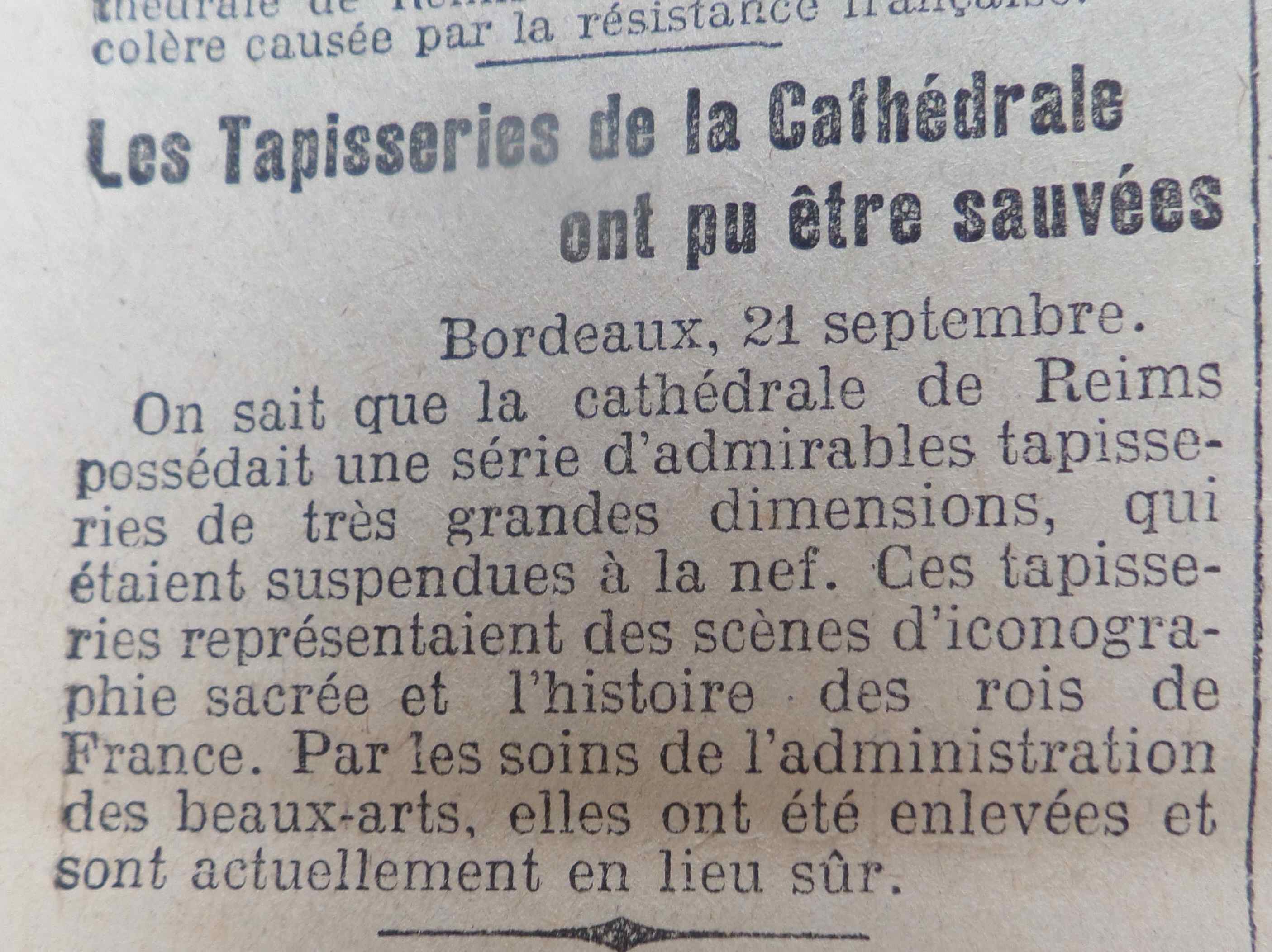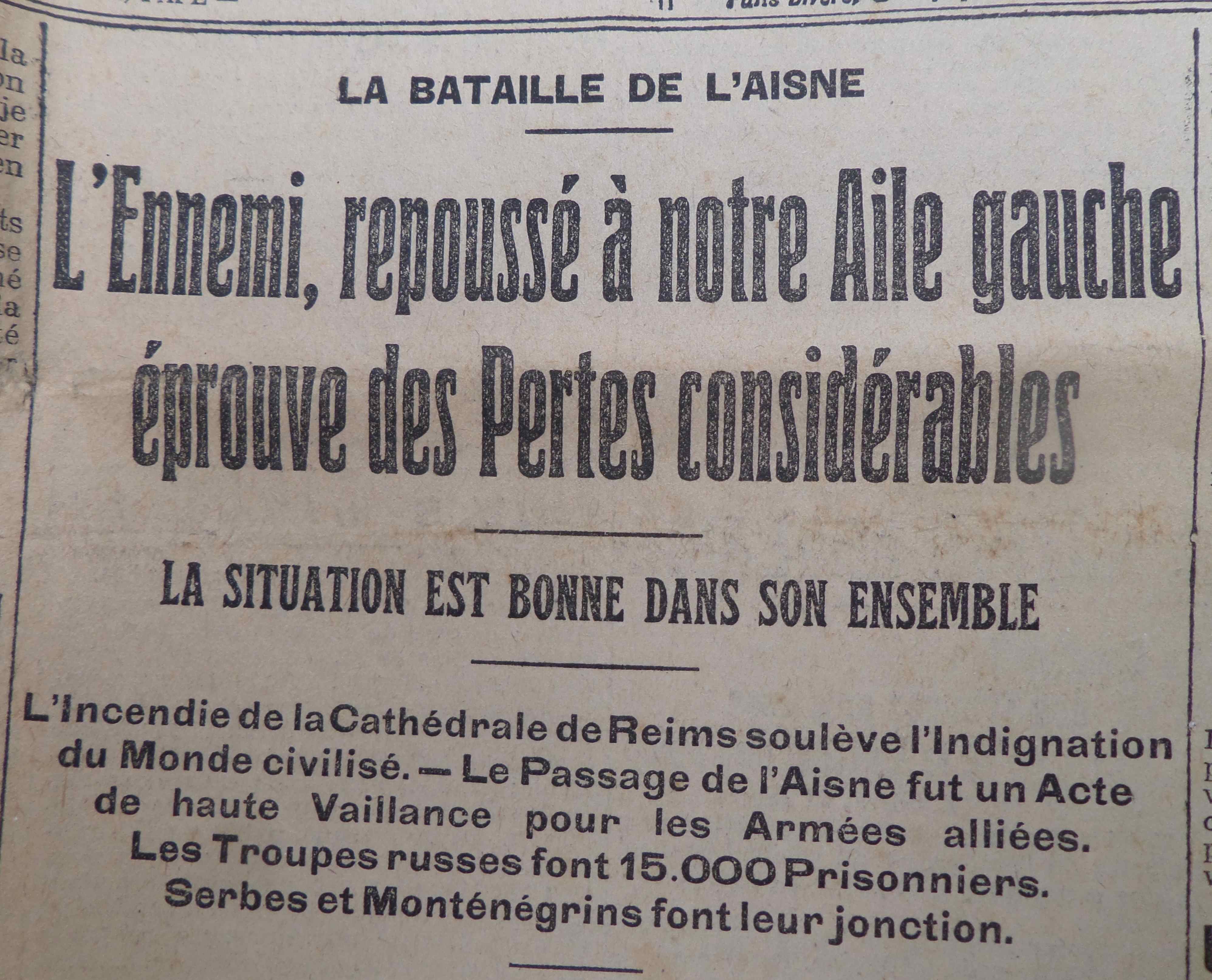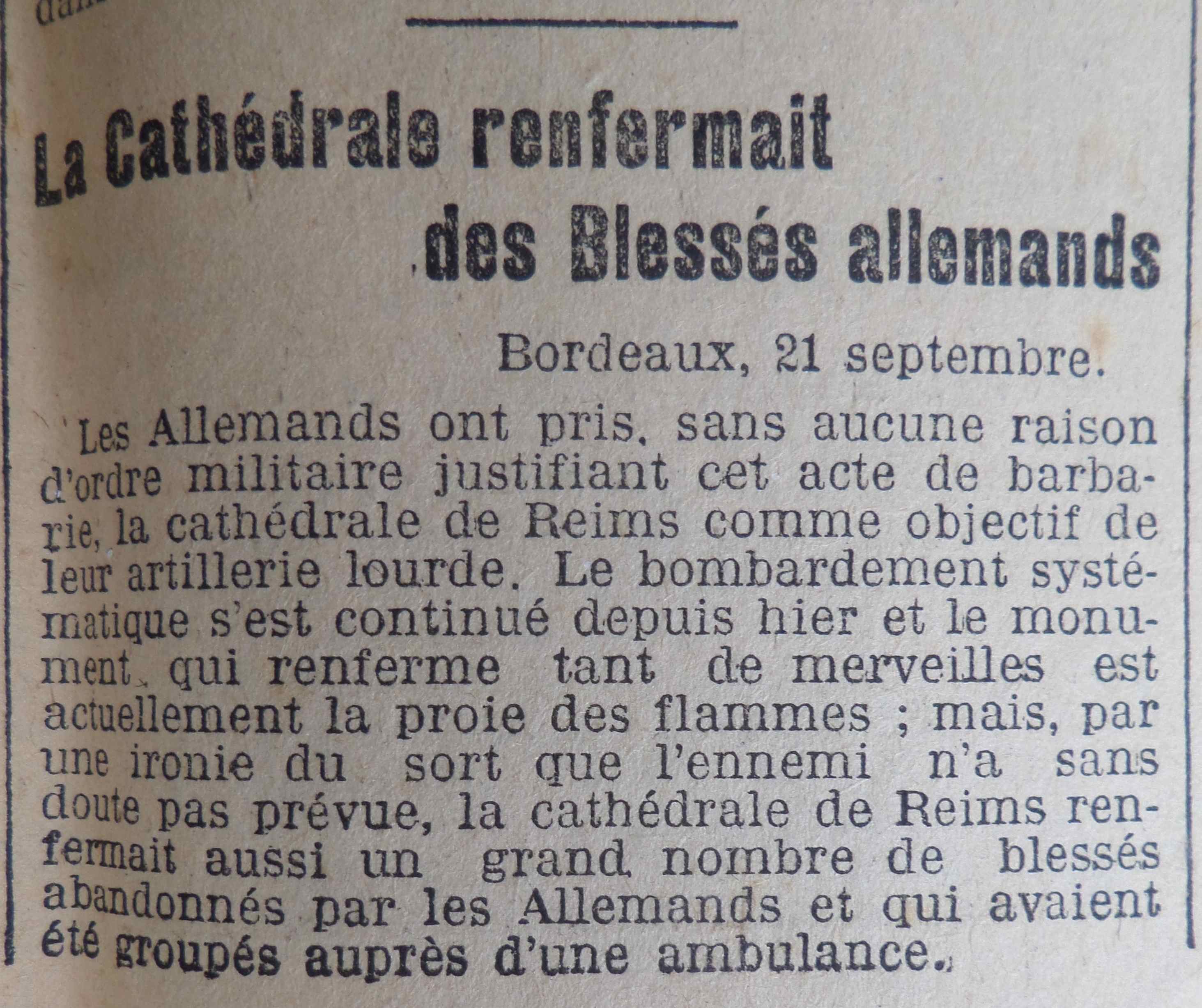 L’incendie de la cathédrale de Reims suite à un bombardement allemand après la reconquête de la ville par les Français fait beaucoup écrire. Dans la une militaire