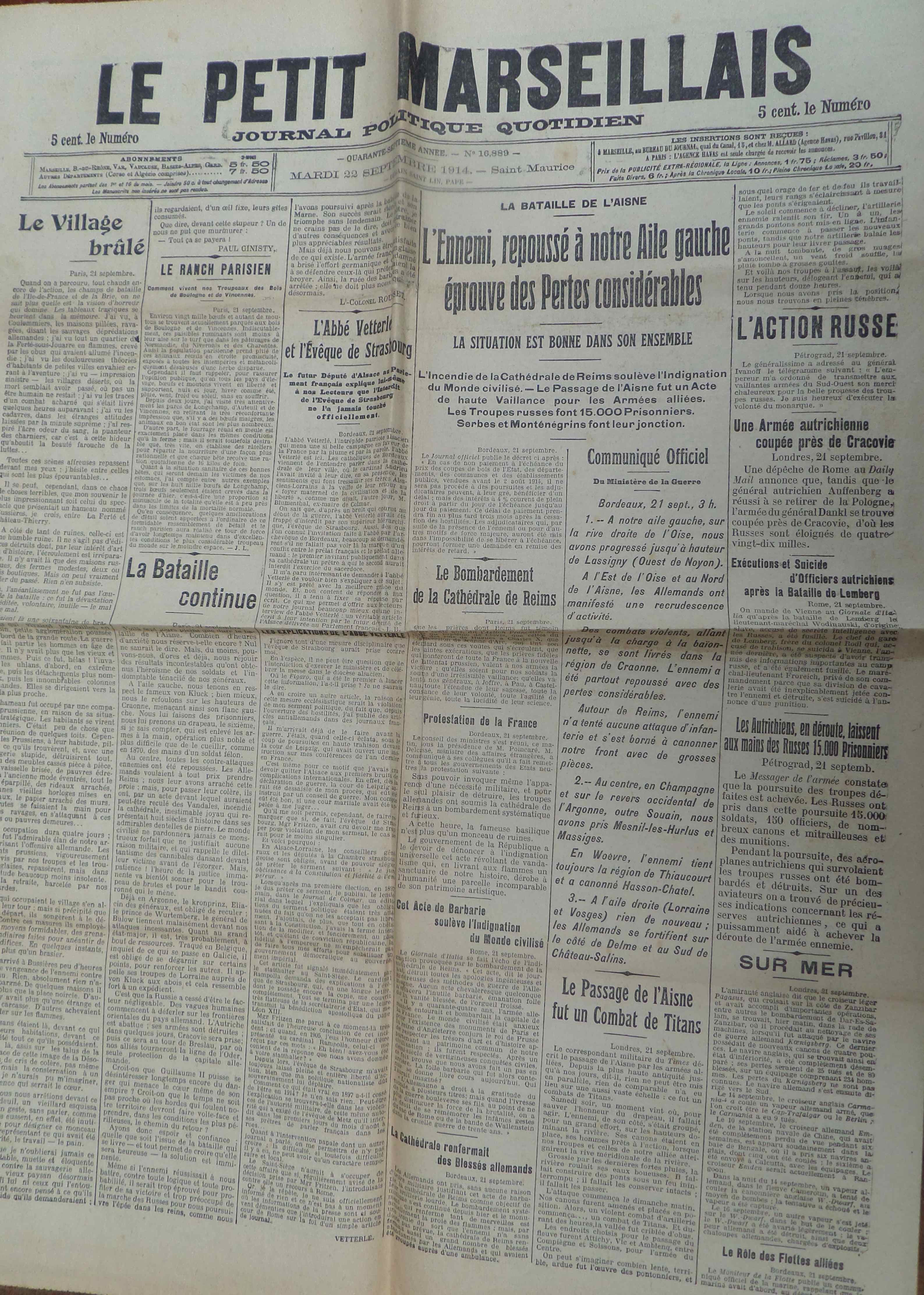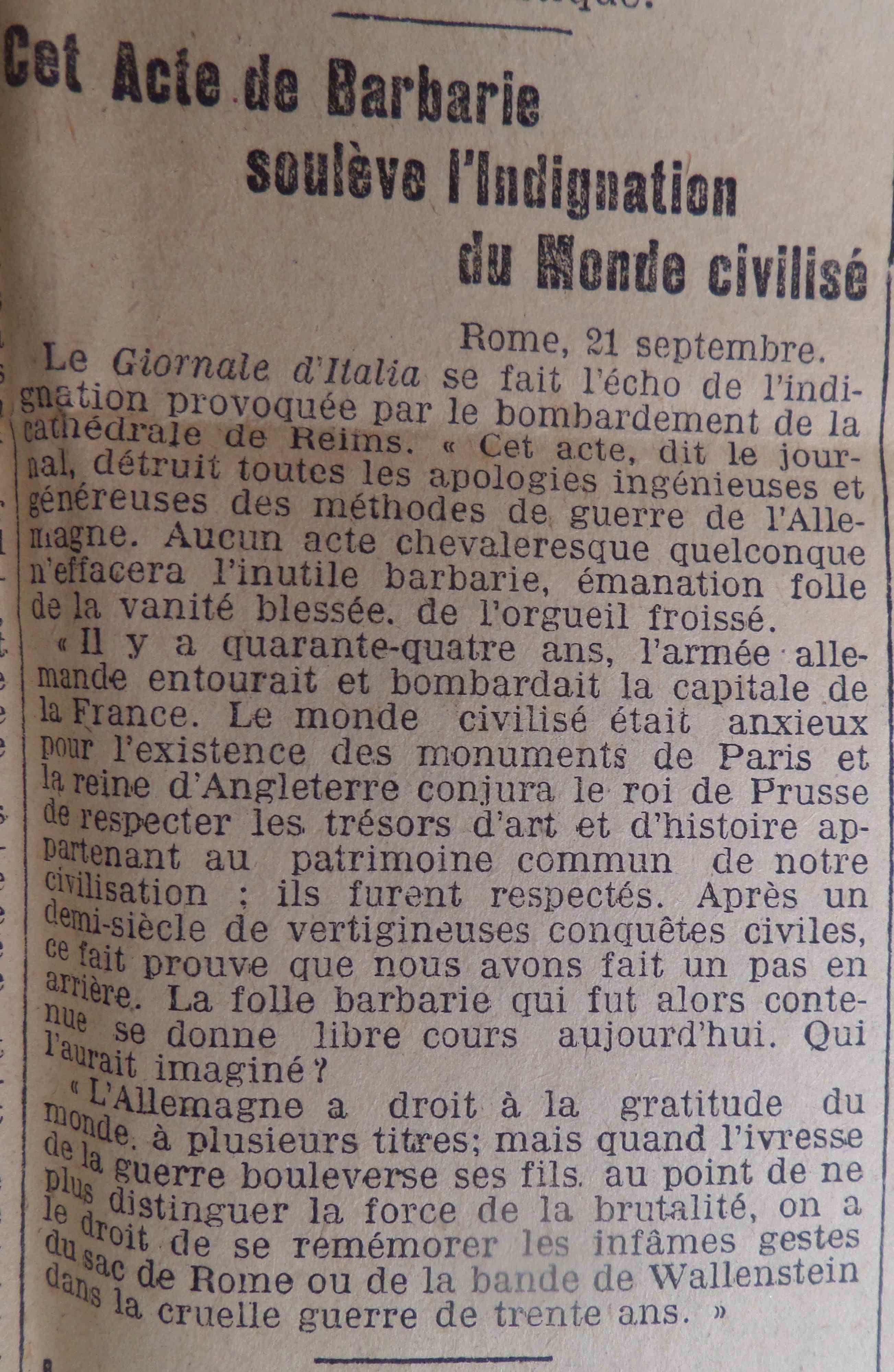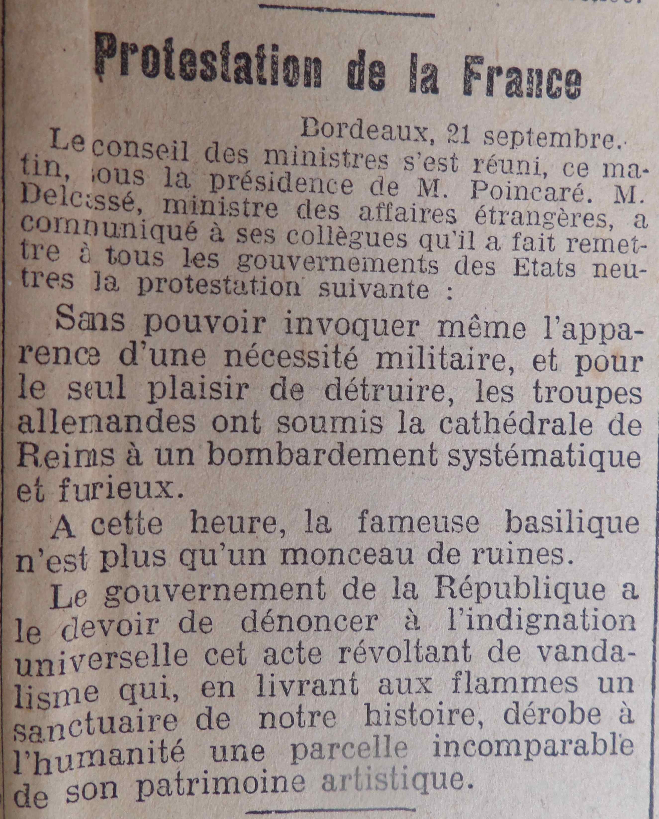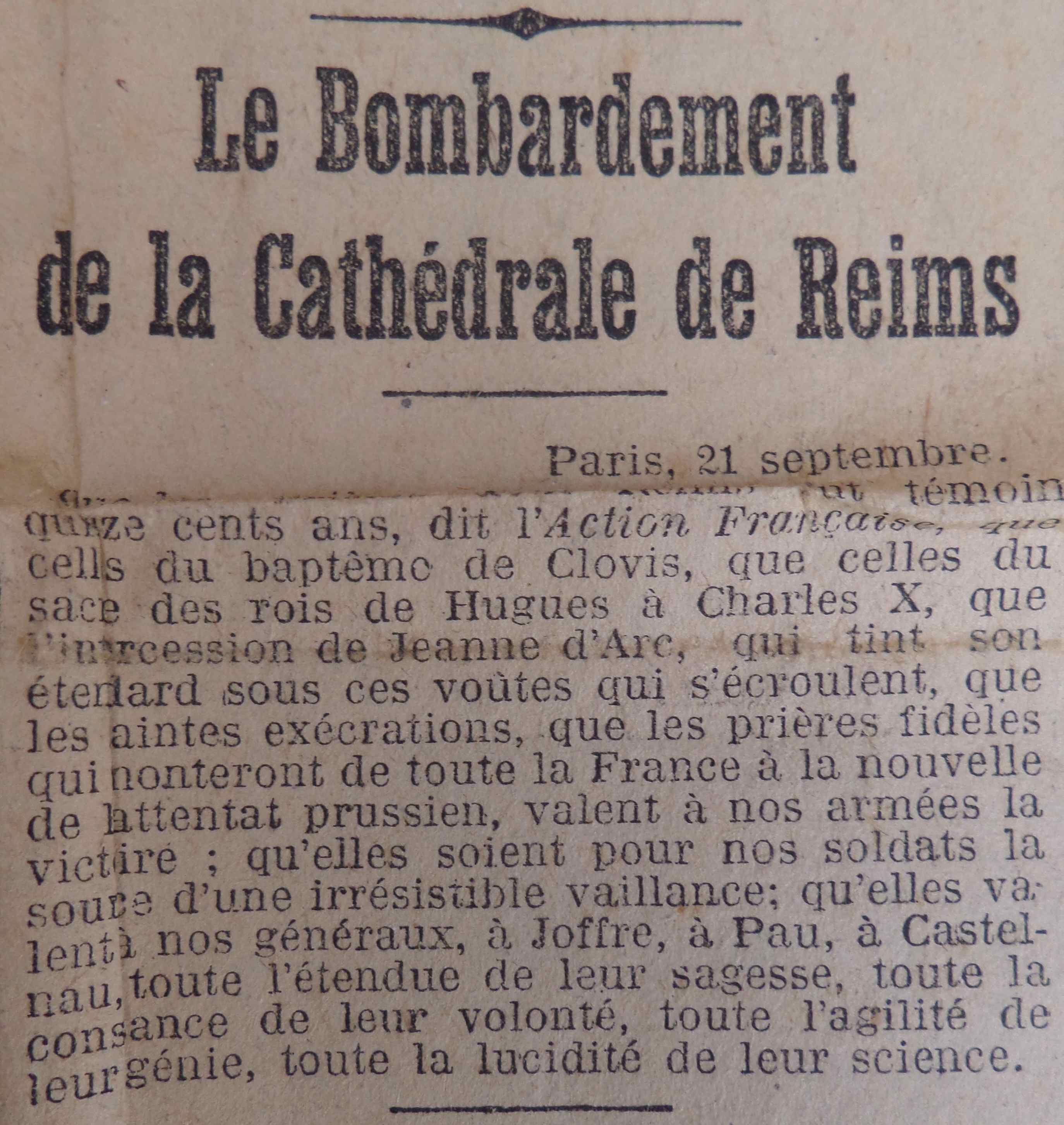 L’incendie de la cathédrale de Reims suite à un bombardement allemand après la reconquête de la ville par les Français fait beaucoup écrire. Dans la une militaire