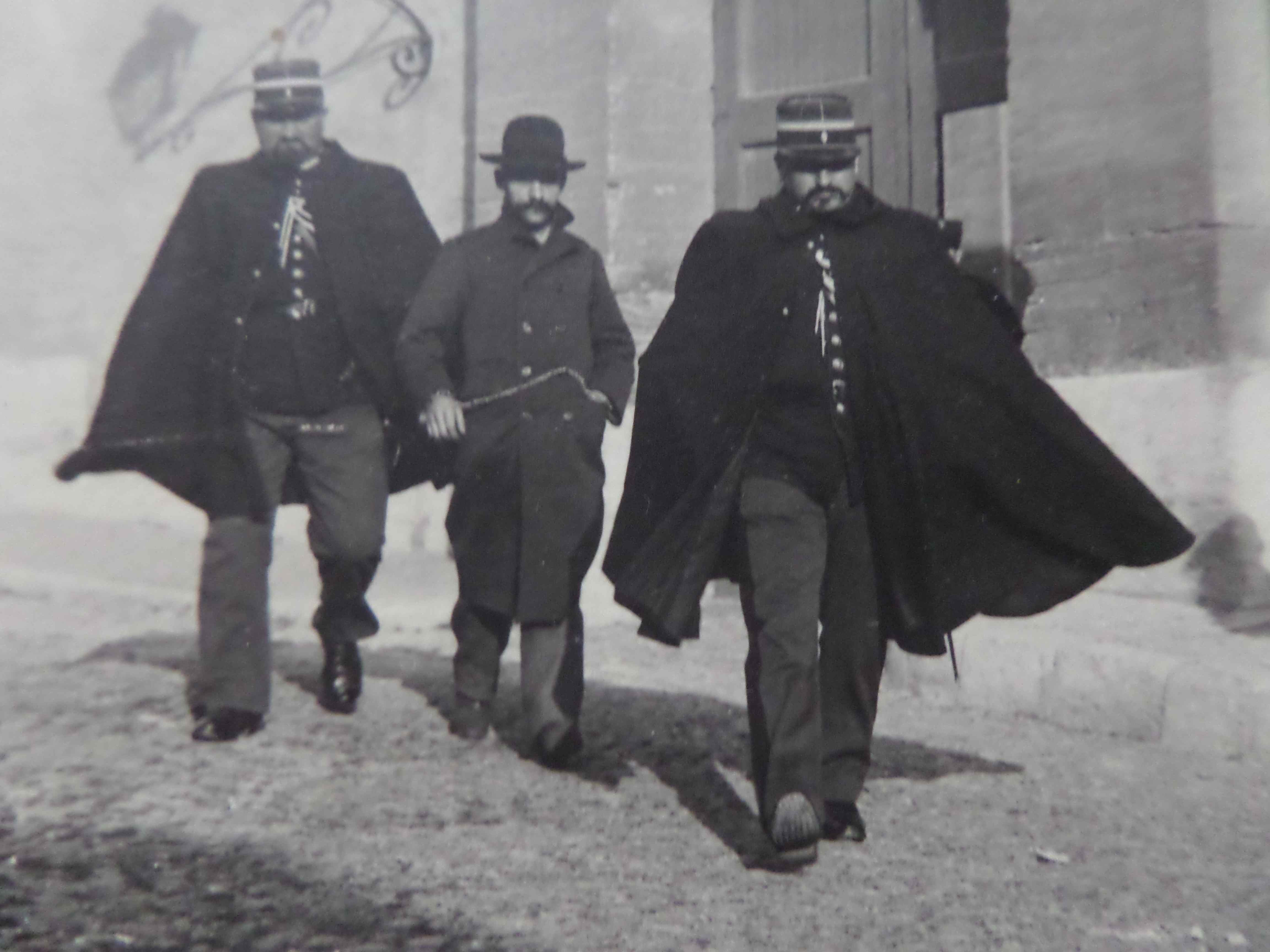 Il s’agit certainement d’un transfert de prisonniers vers le Palais de Justice. La scène doit dater dans les années 1900, à la vue de la tenue des gendarmes (disparition du bicorne en 1904).