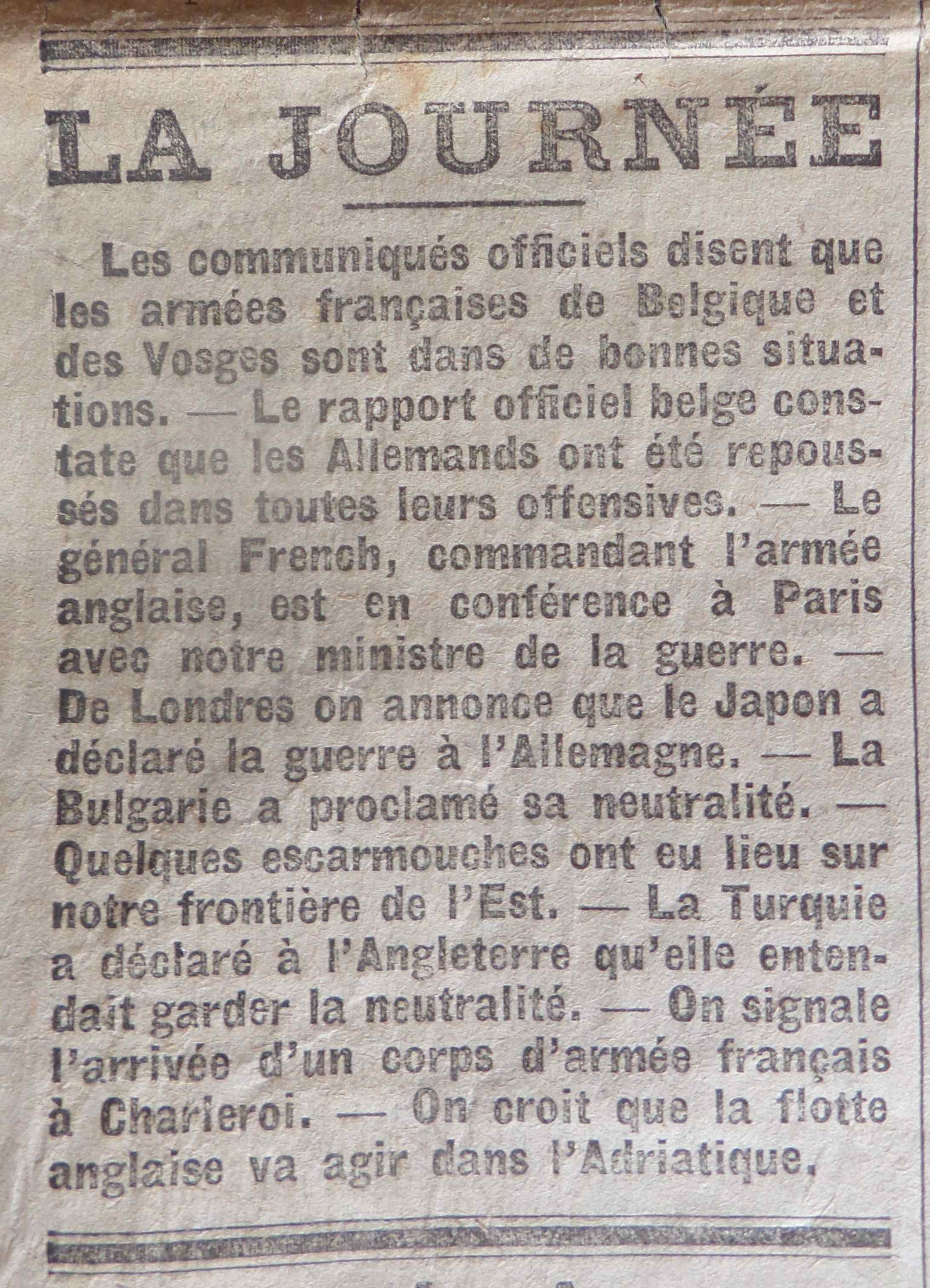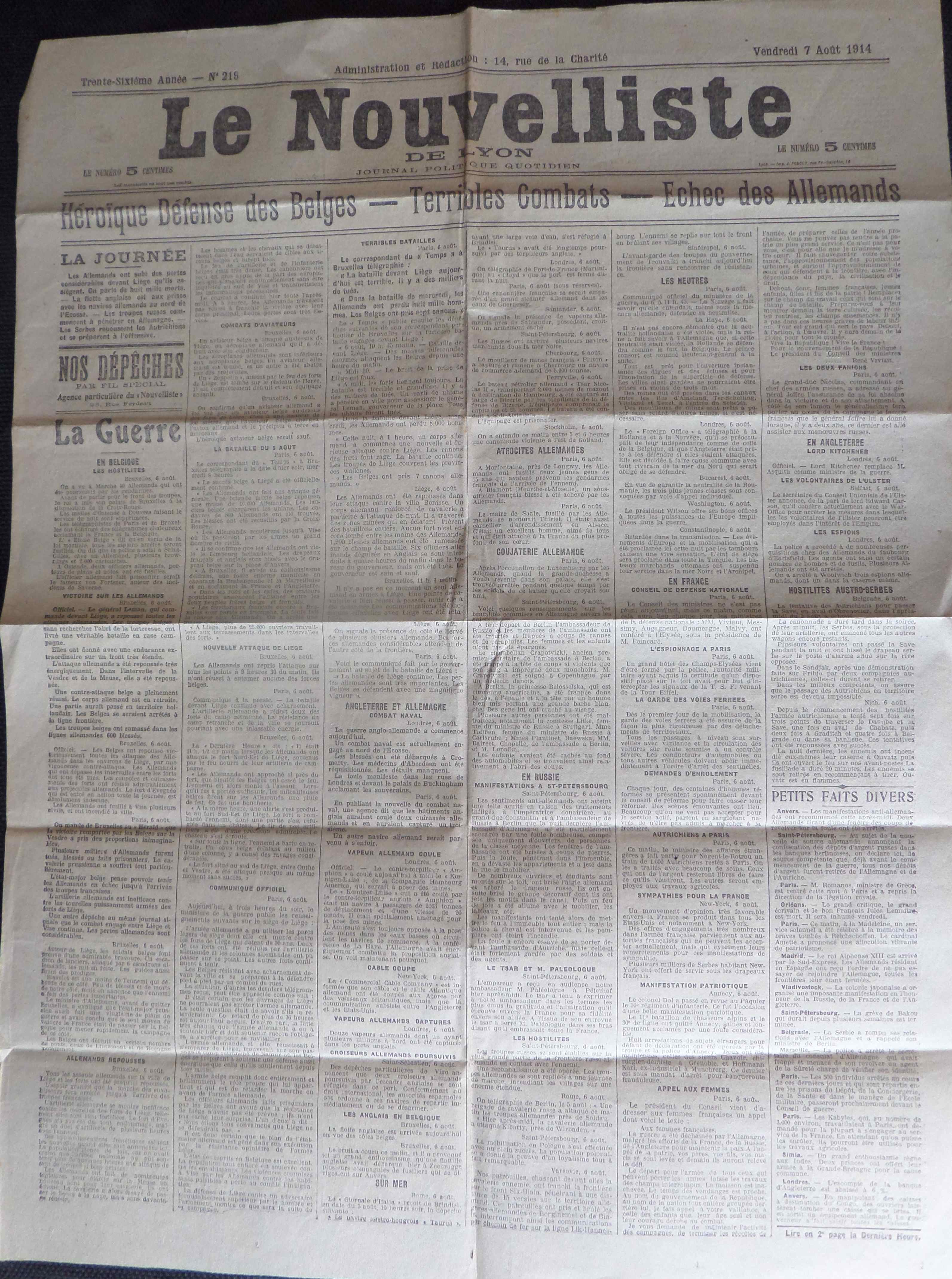 LE NOUVELLISTE du 7 Août 1914 (4ème jour de guerre)
