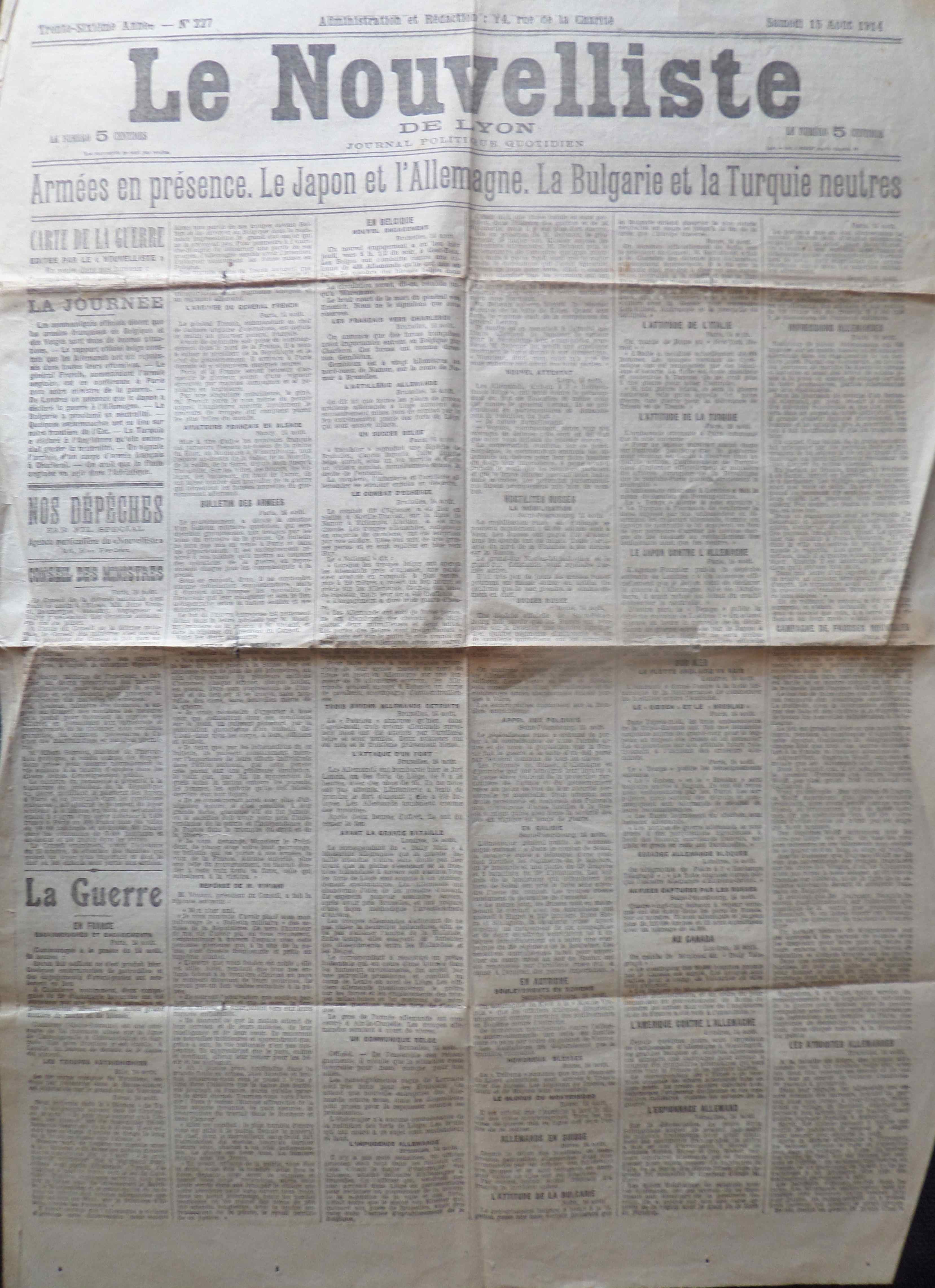LE NOUVELLISTE du 15 Août 1914 (12ème jour de guerre)