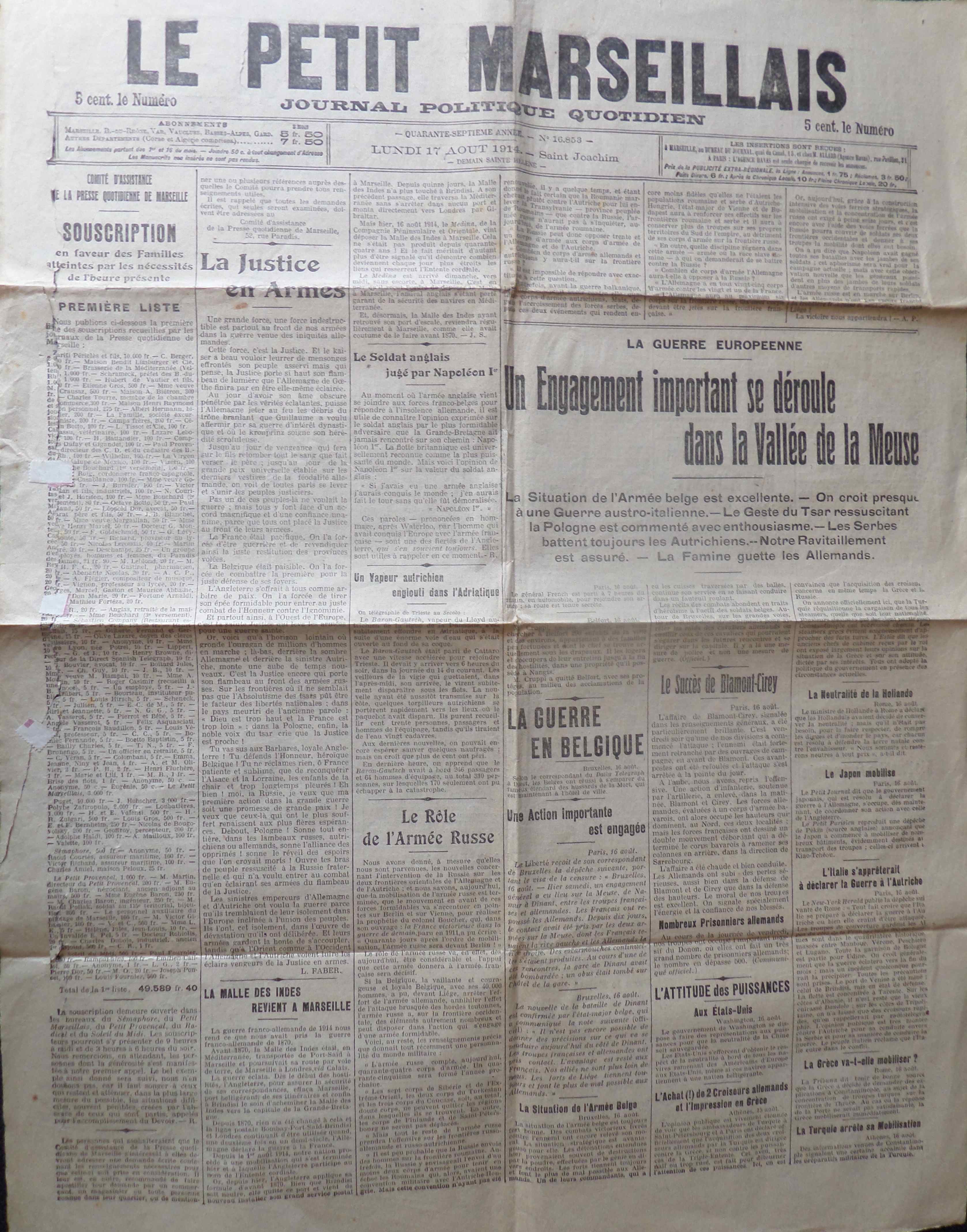 LE PETIT MARSEILLAIS du 17 Août 1914 (14ème jour de guerre)